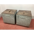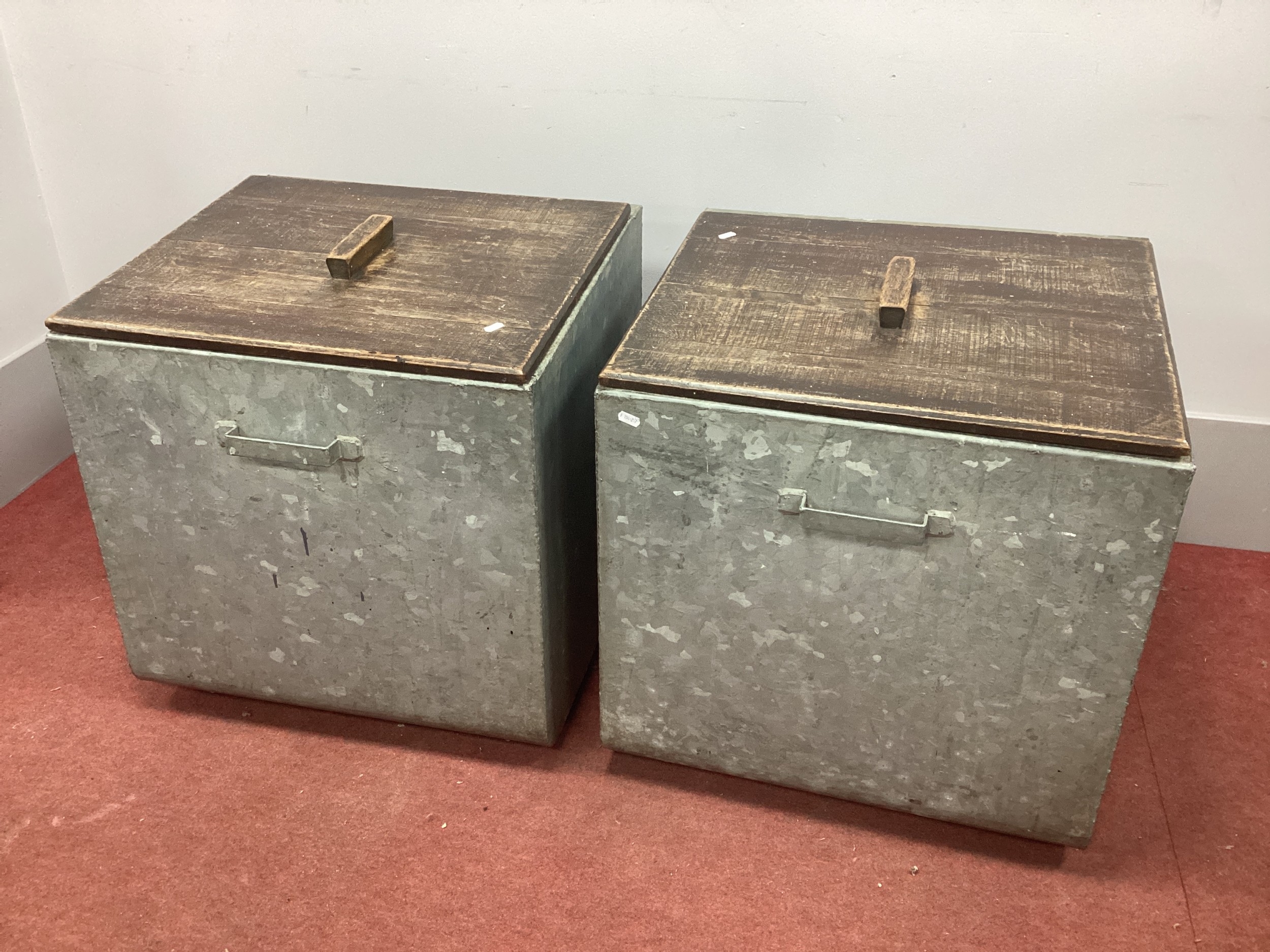 Two Galvanised Flour Bins, with wooden lids, 62cm wide.