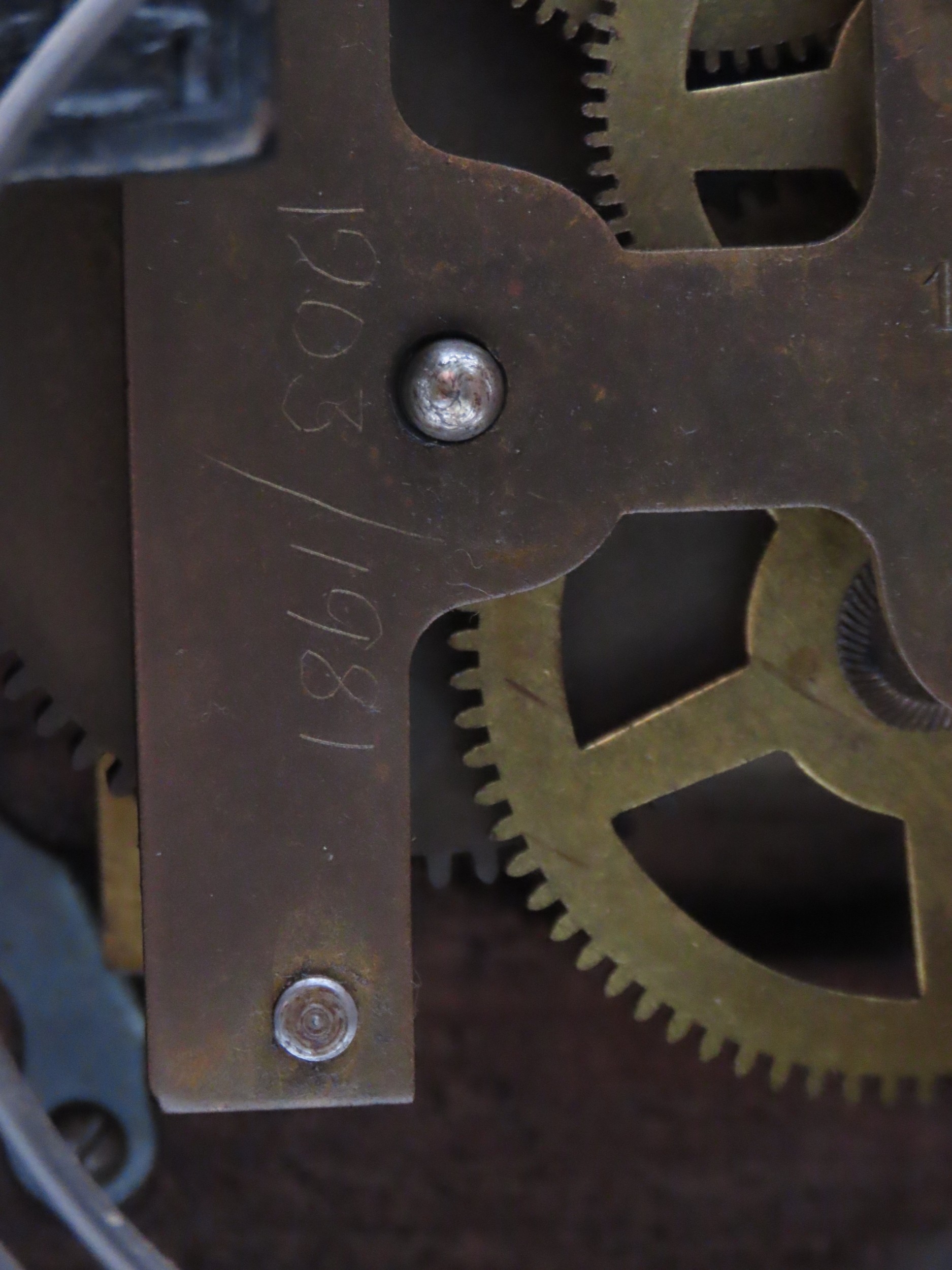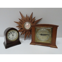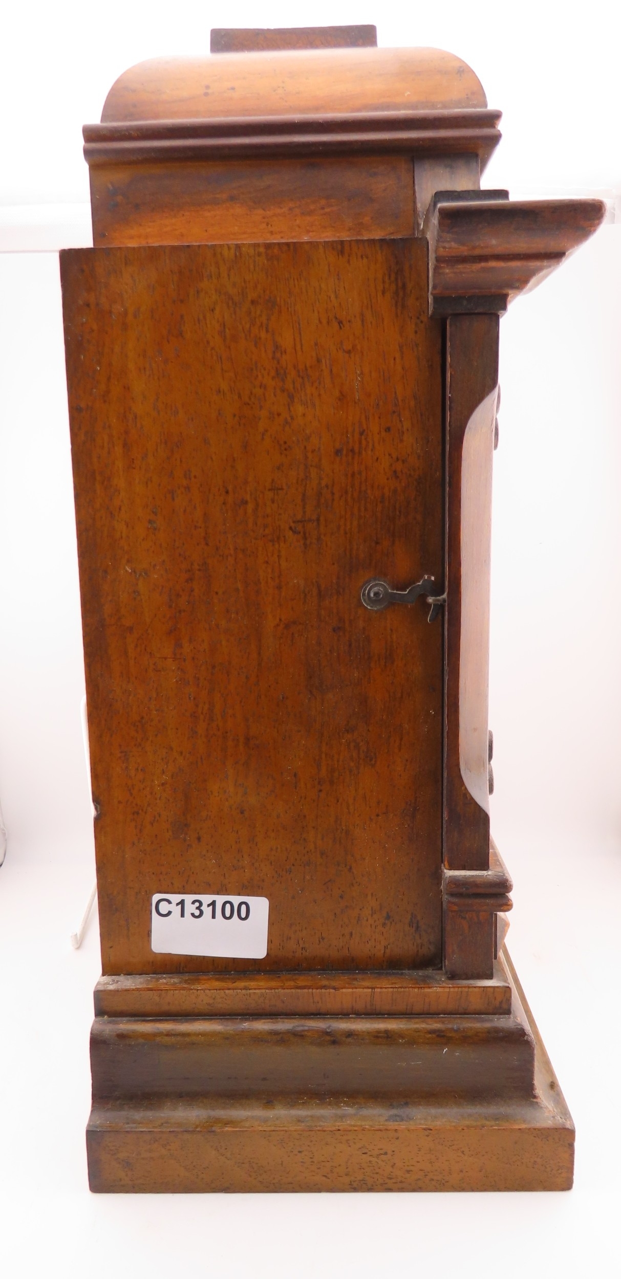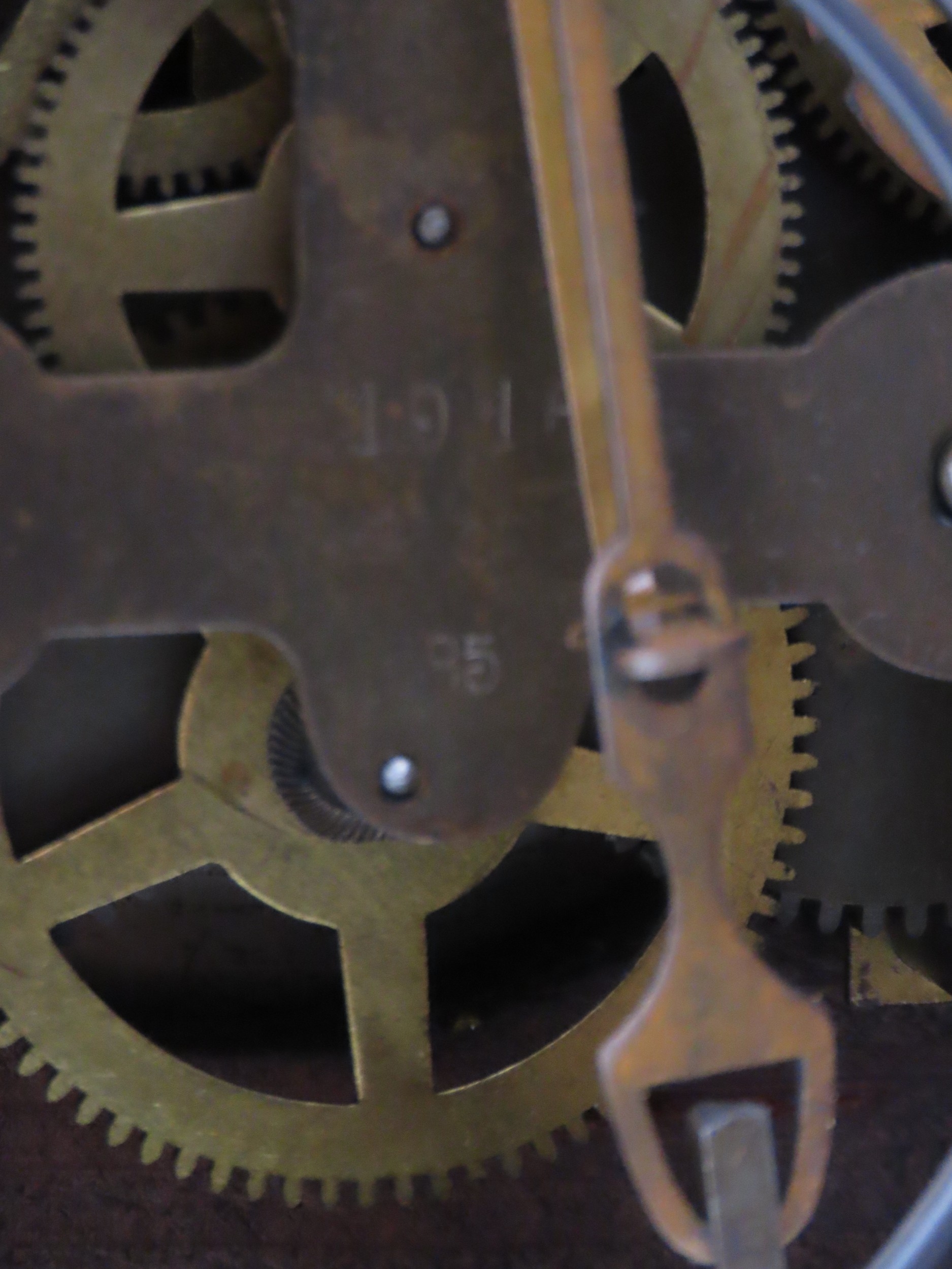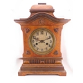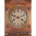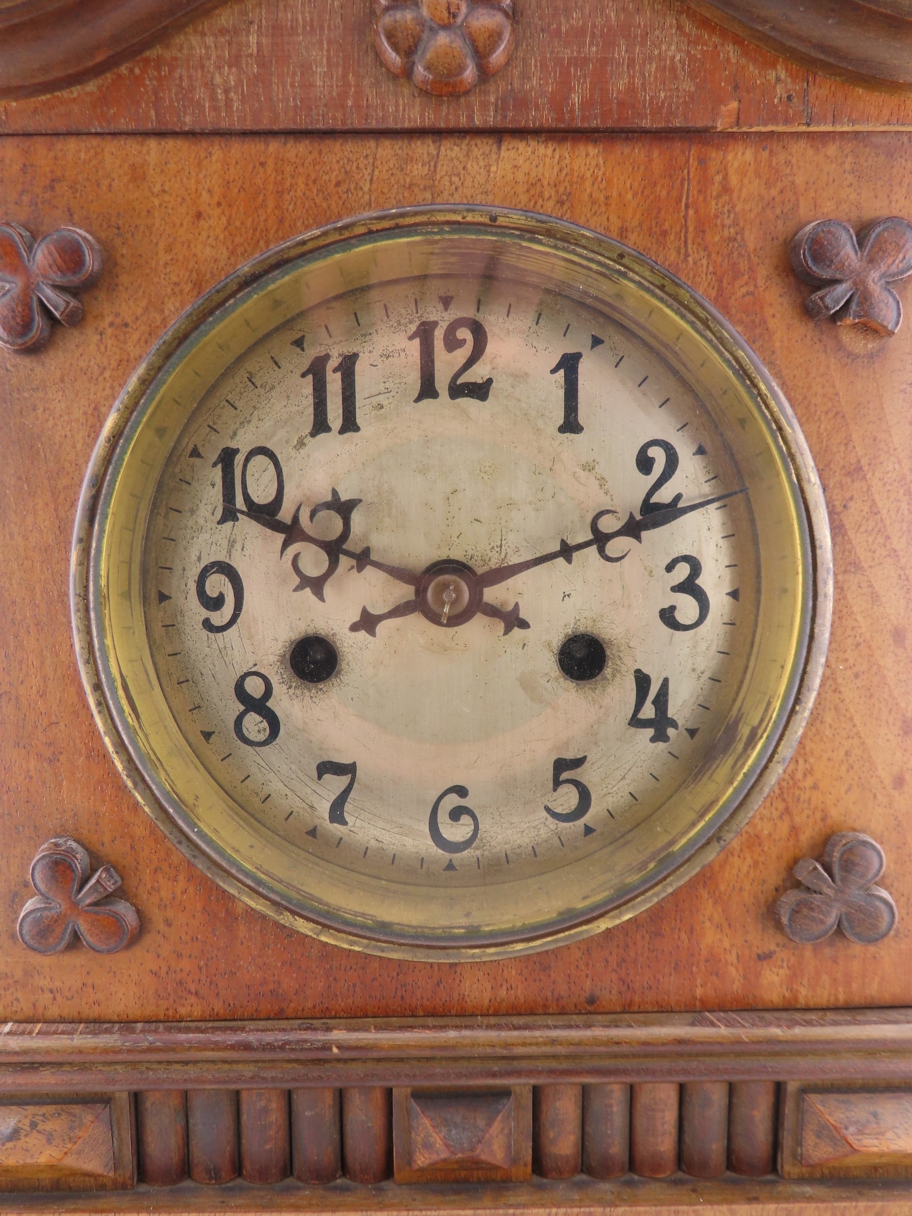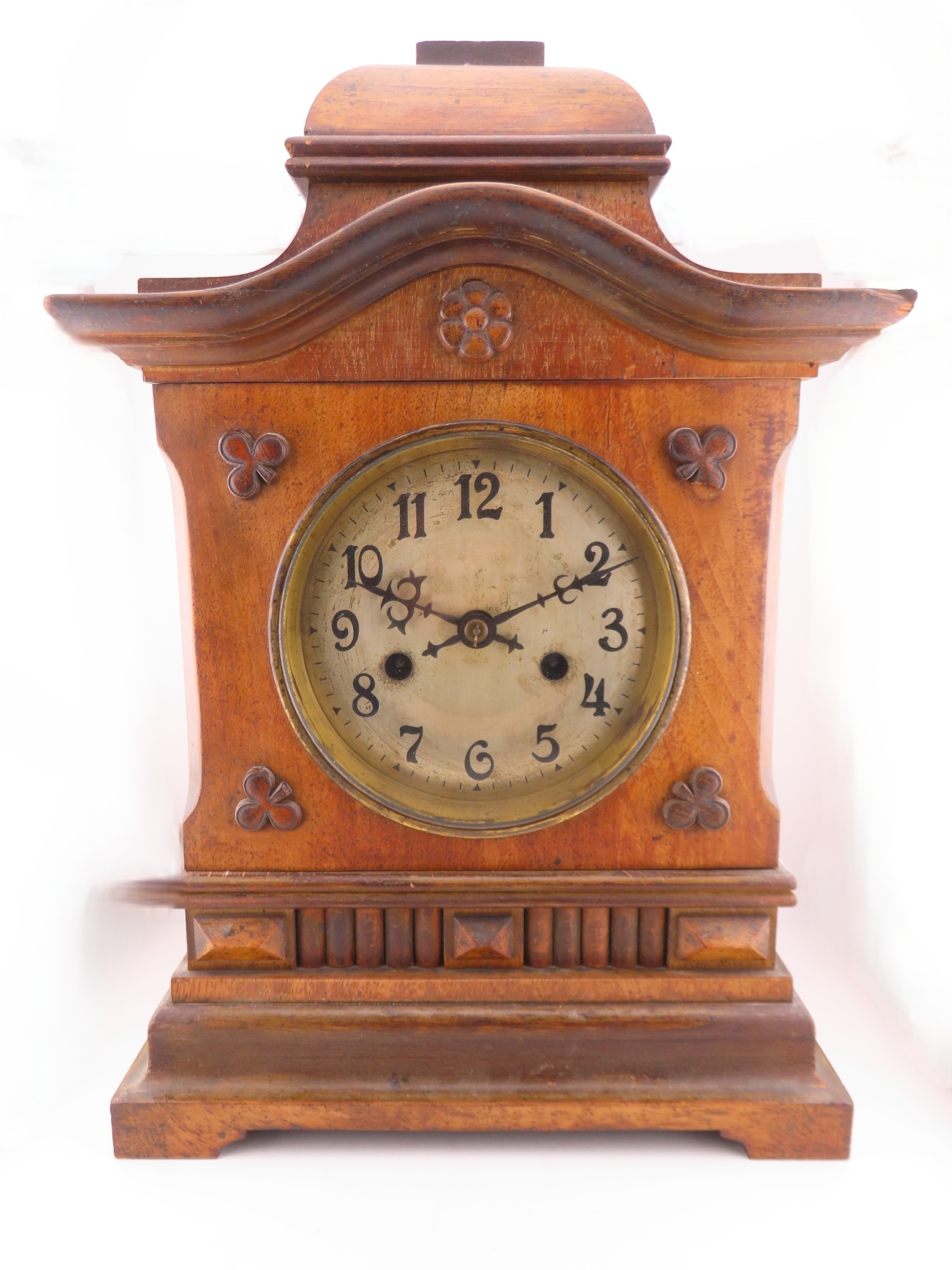 Carved wooden mantel clock approx 15 inches tall, in running order.