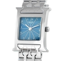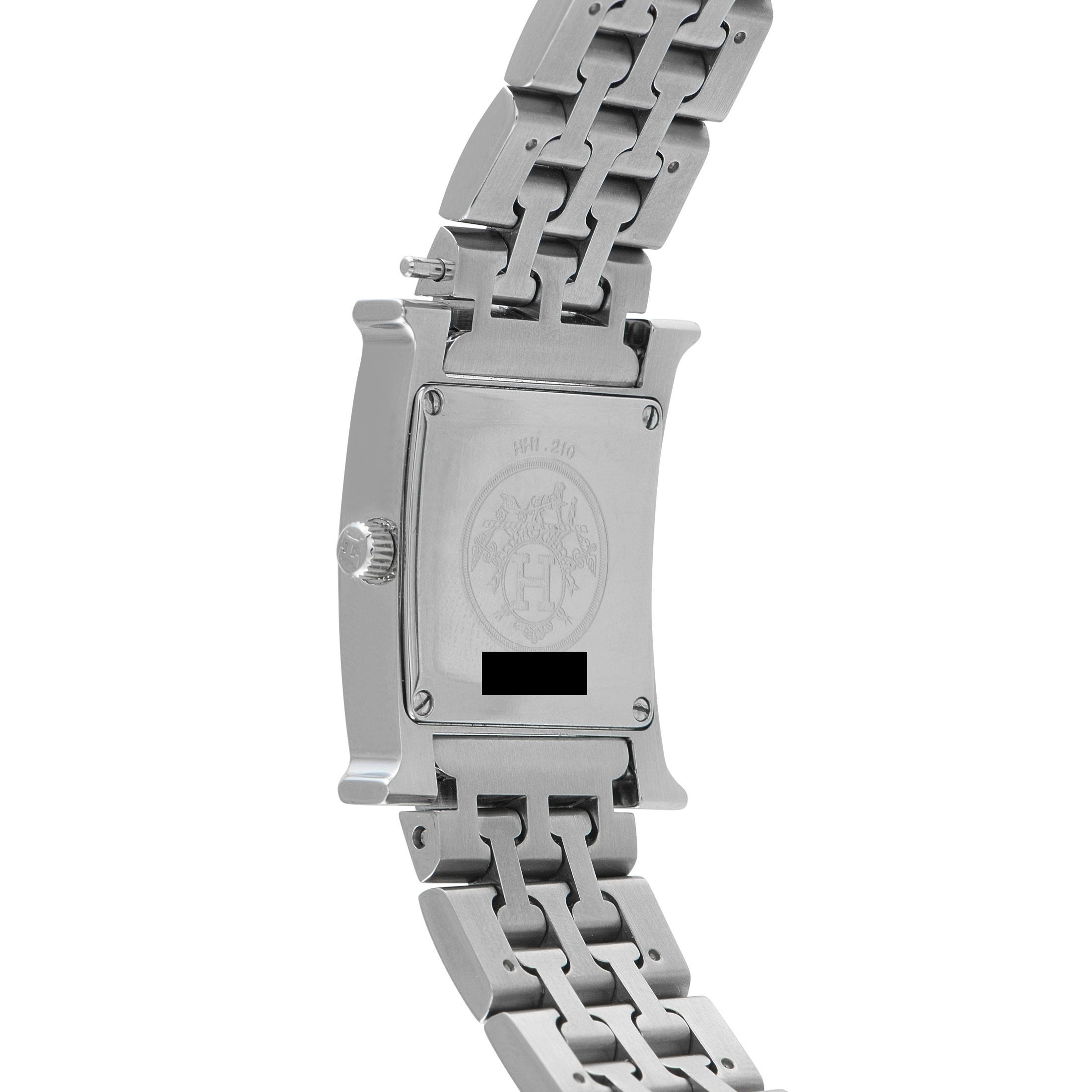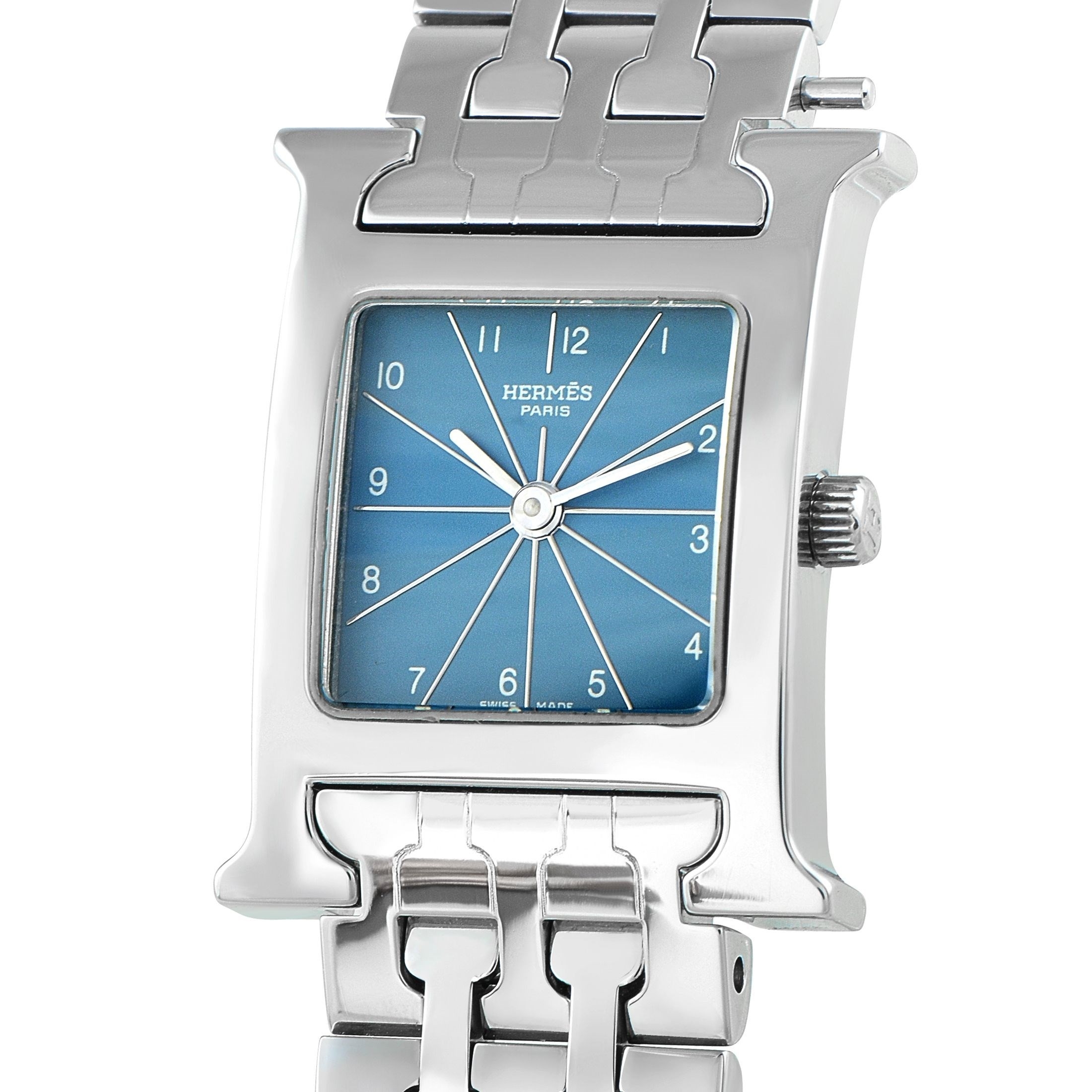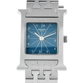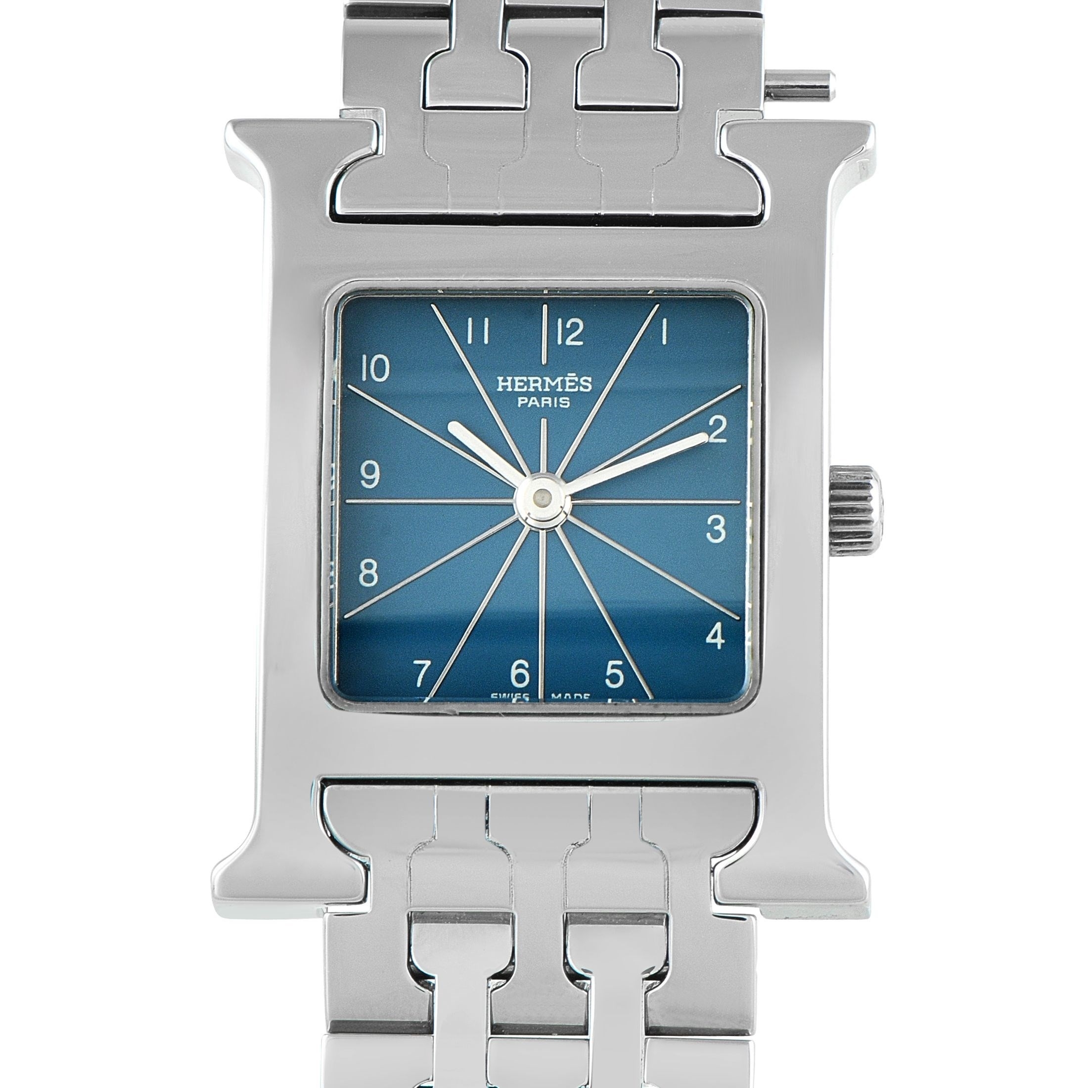 An Hermes Heure H Blue Dial Steel Watch. ref. HH1.210, H-shaped stainless steel case equipped with an interchangeable strap system. This particular example is fitted with a matching steel bracelet, with the versatility to switch to a leather strap for a casual look. Silver-toned sunburst lines radiate from the dials center to each hour, giving the denim-blue face a sense of dimension. This time-only watch is powered by a Swiss quartz movement. In very good condition, presented in a gift box. *This item is held at Cadmore USA Office in Pennsylvania, USA and will be shipped from there. Buyers will be responsible for direct shipping payments.*