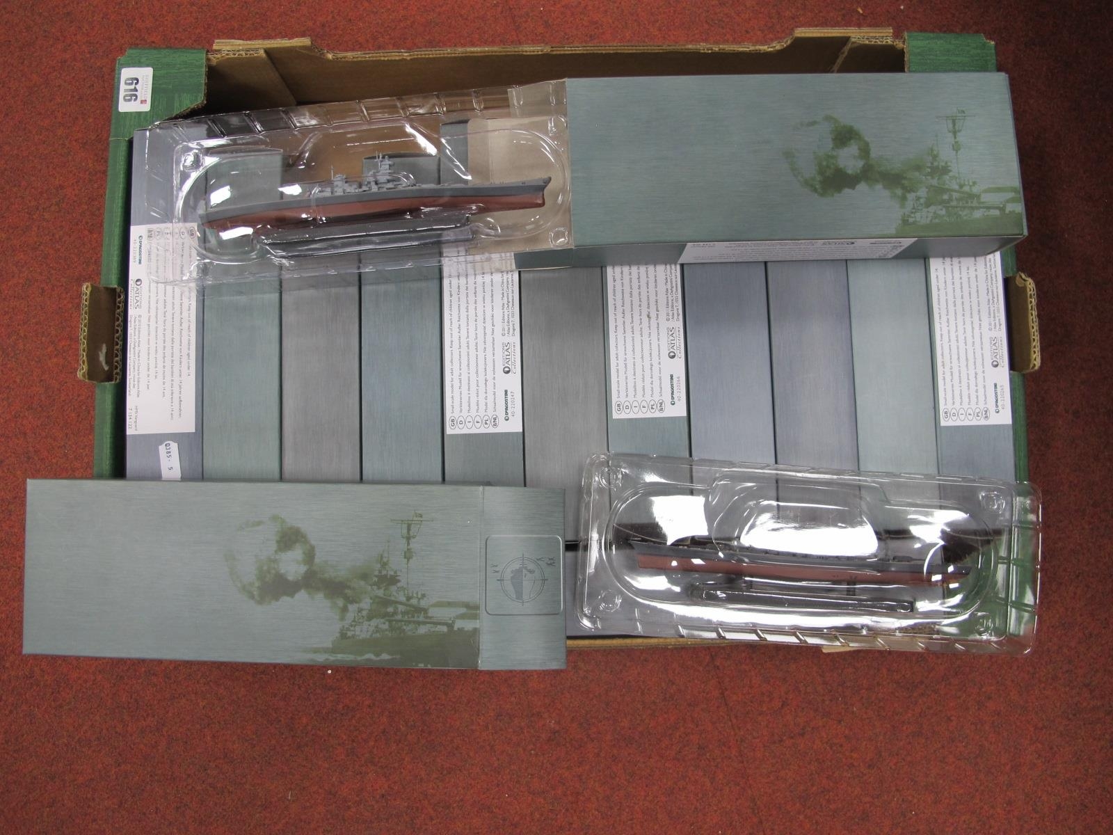 Fourteen Atlas Editions Diecast Model Warships, including Tirpitz, HMS Vanguard, HMS Exeter, HMS Nelson, all boxed.
