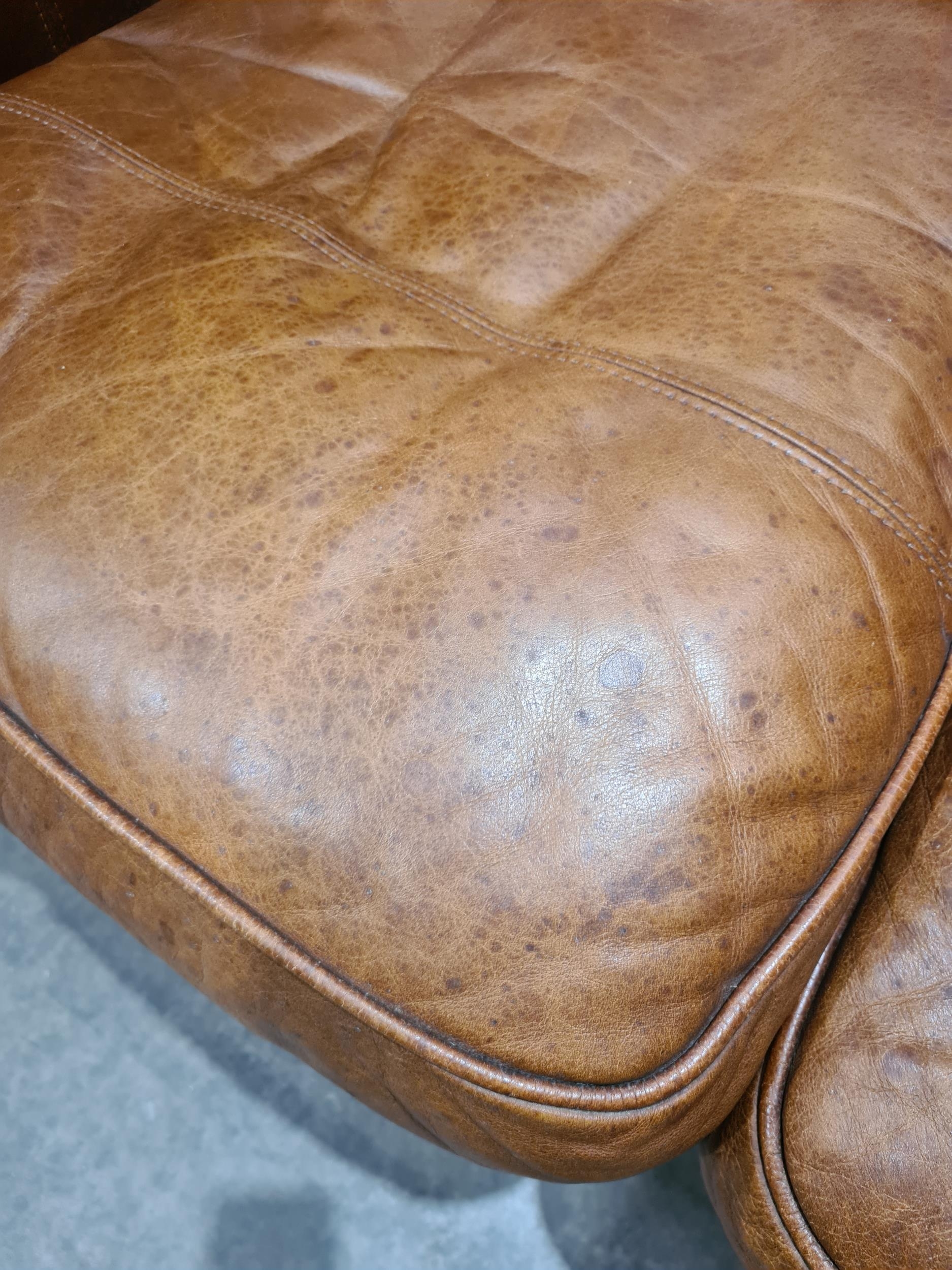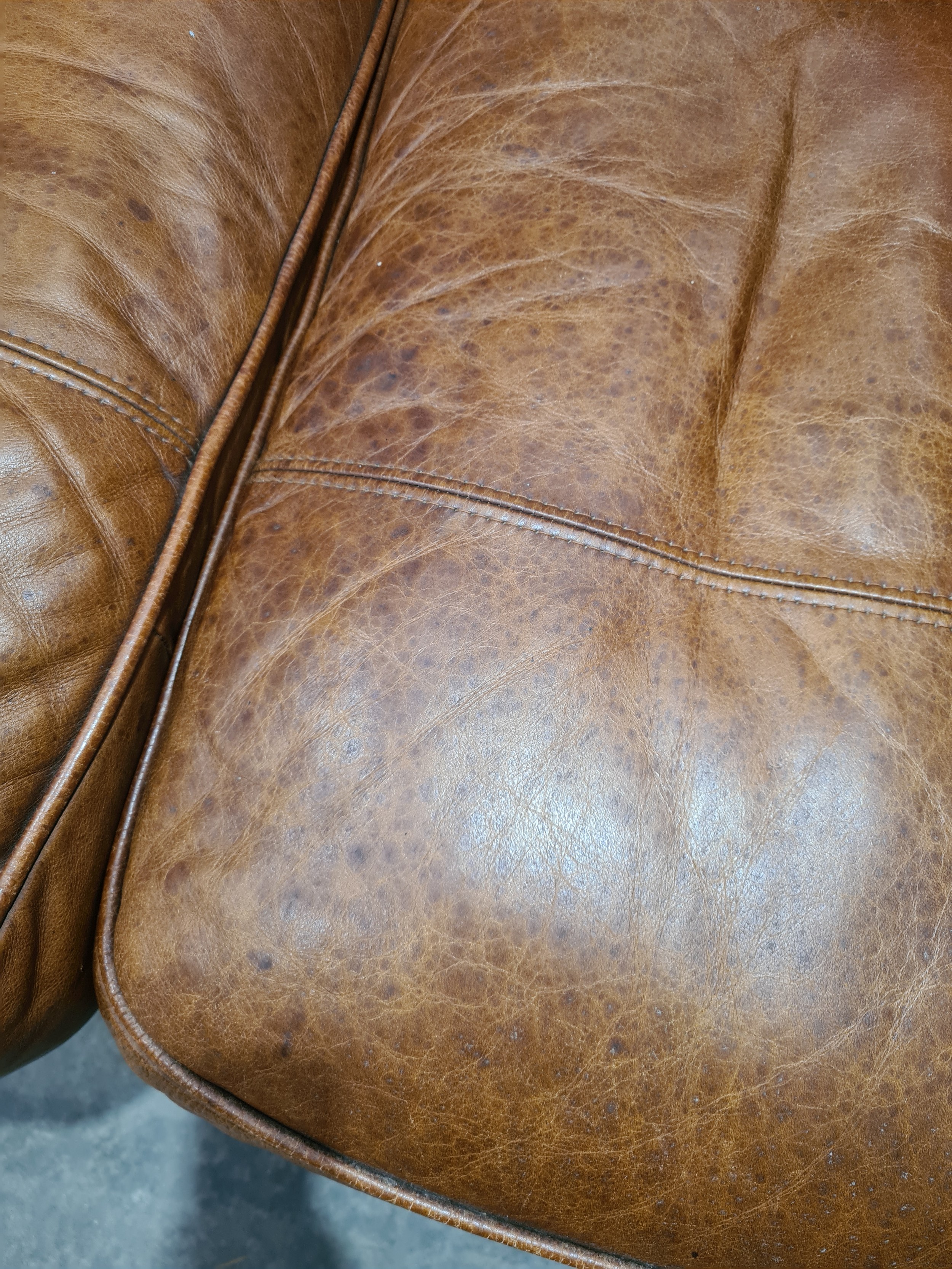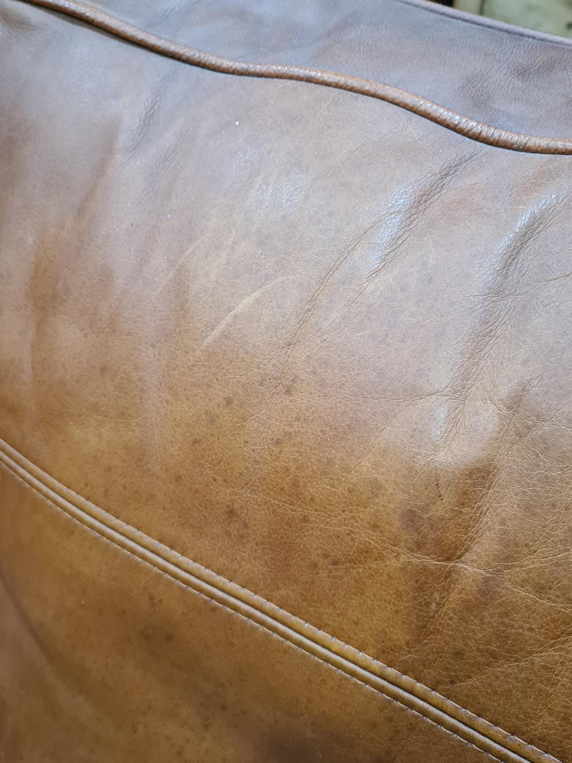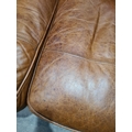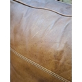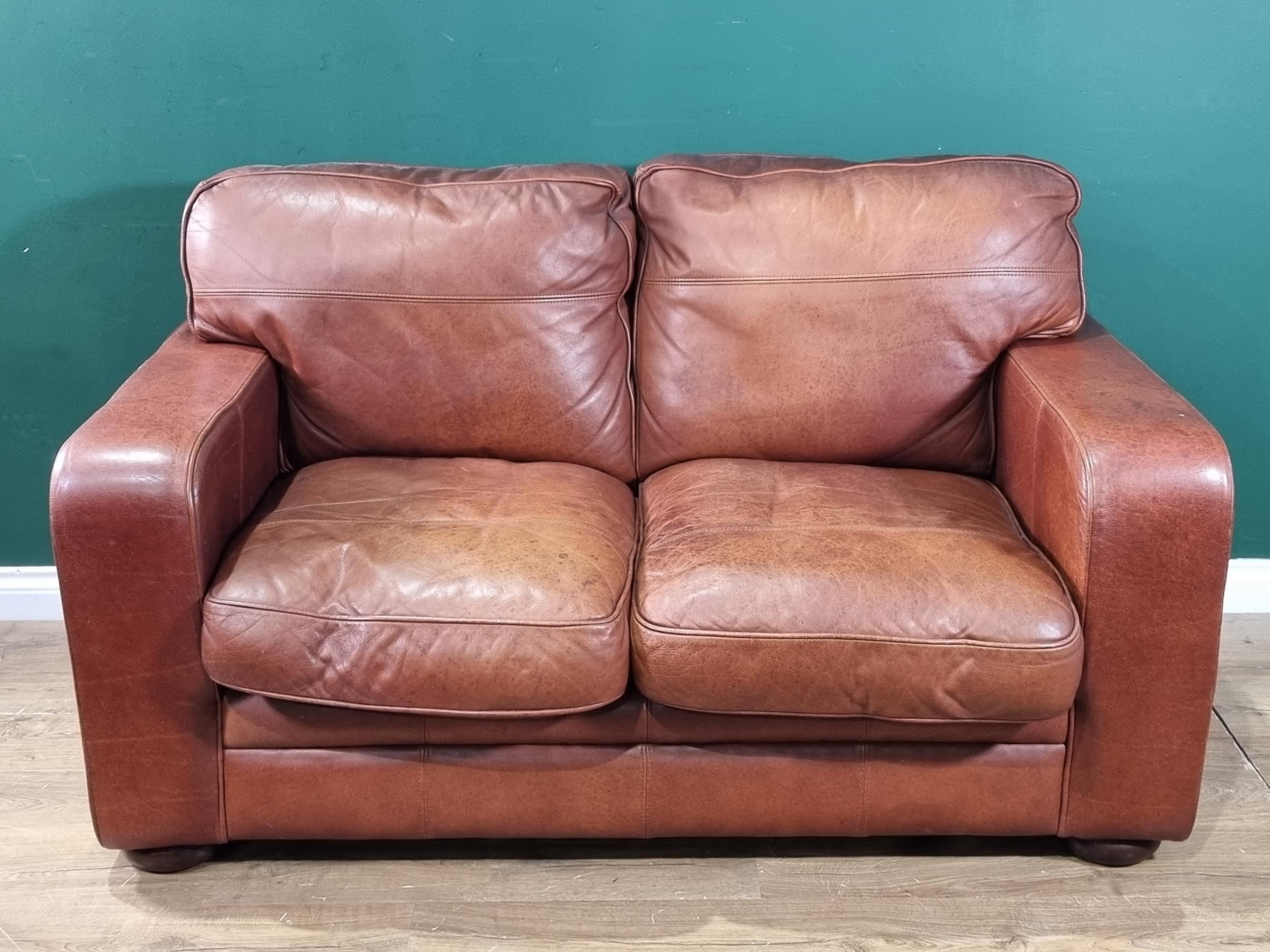 A tan leather two seater Settee, raised on circular bun feet, 4ft 11"Wide. (R7).