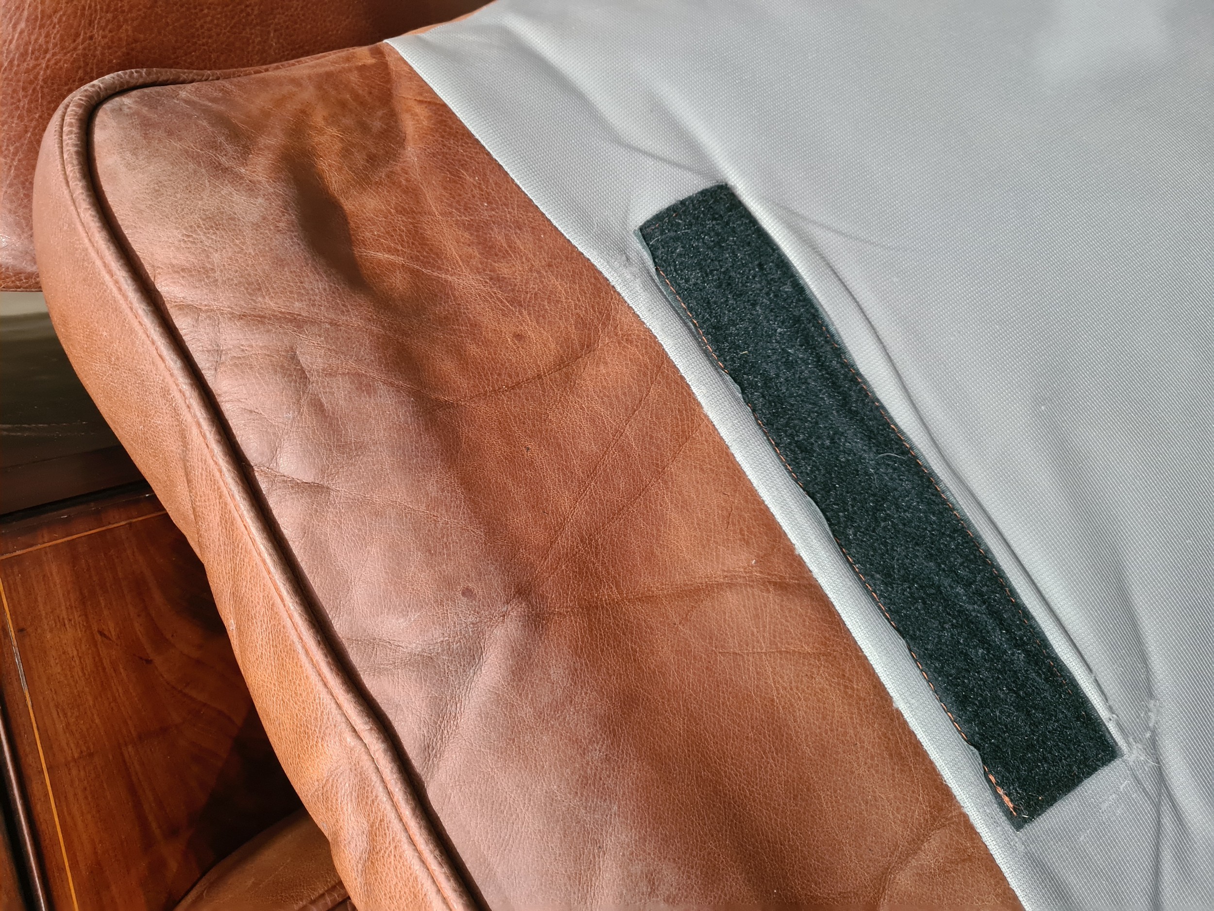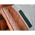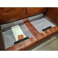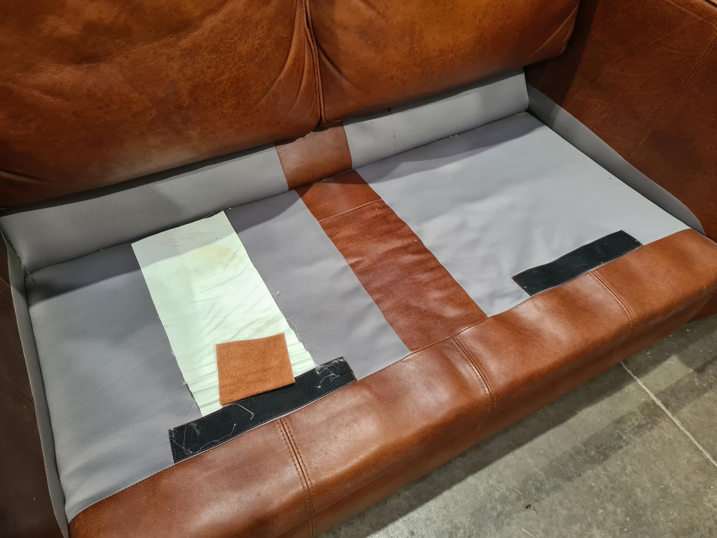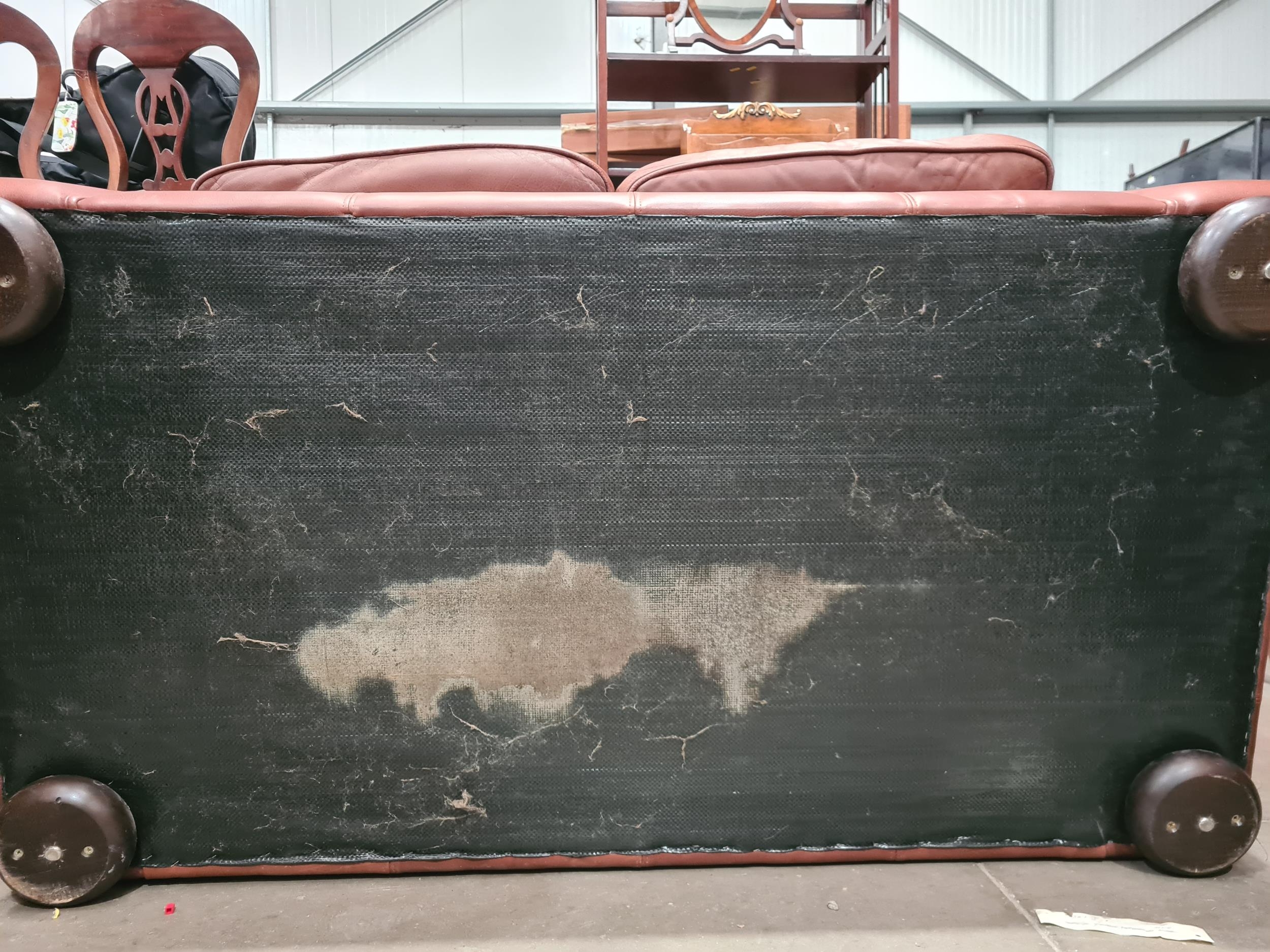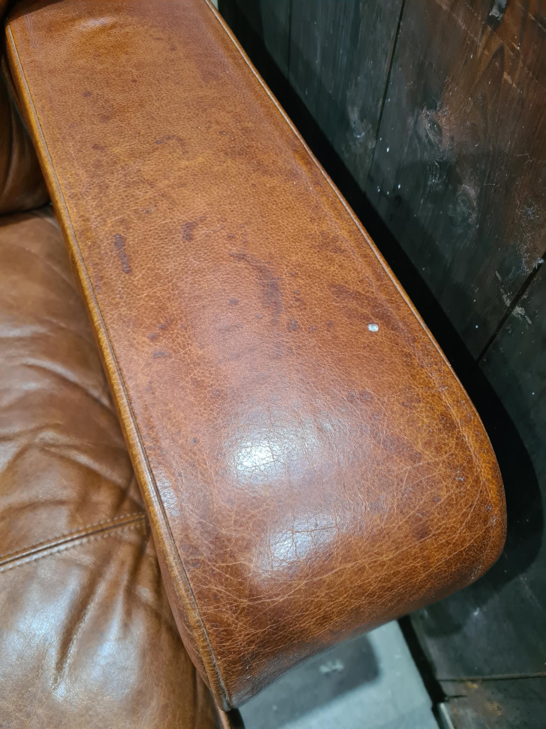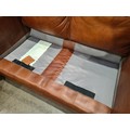 A tan leather two seater Settee, raised on circular bun feet, 4ft 11"Wide. (R7).