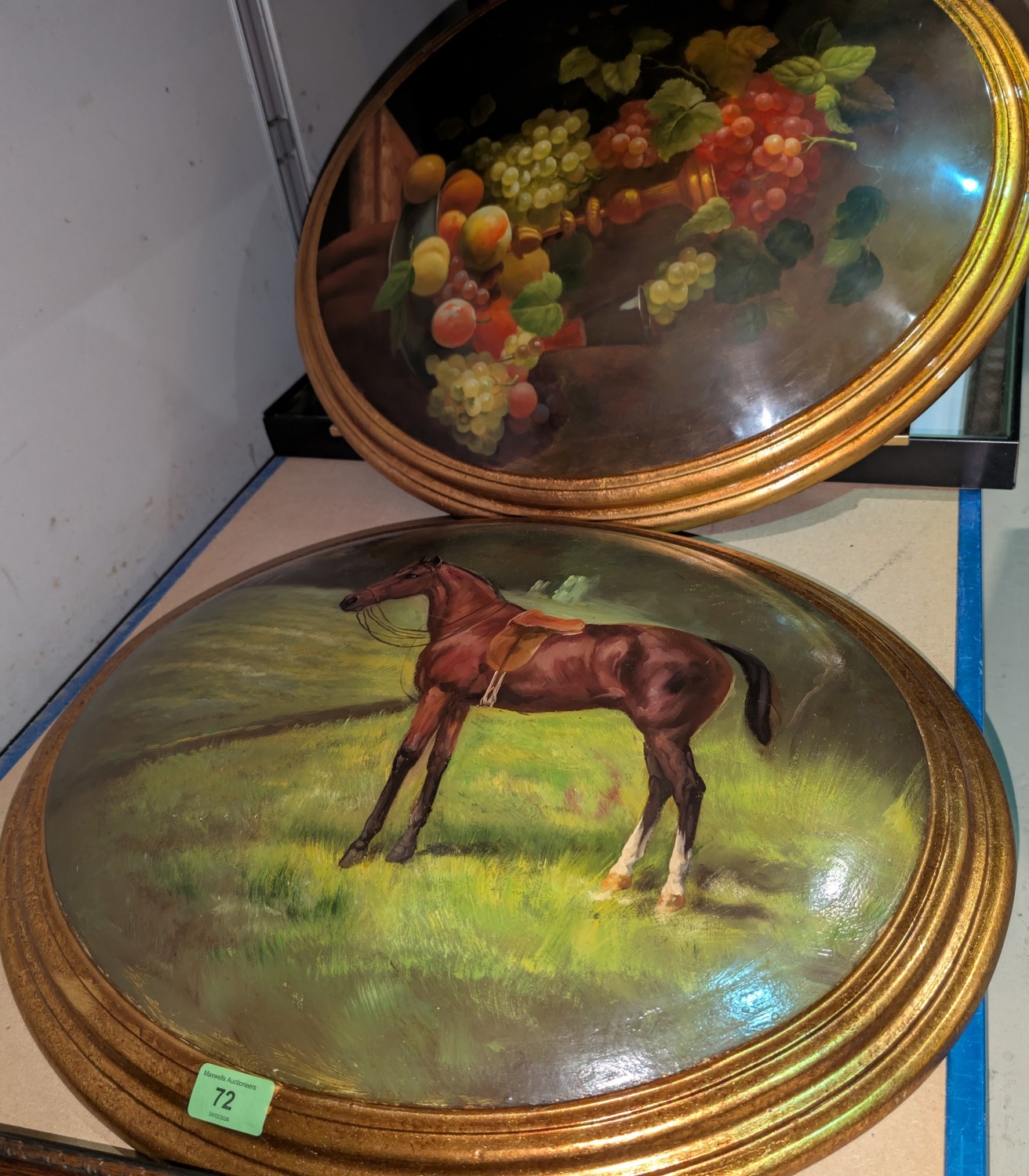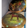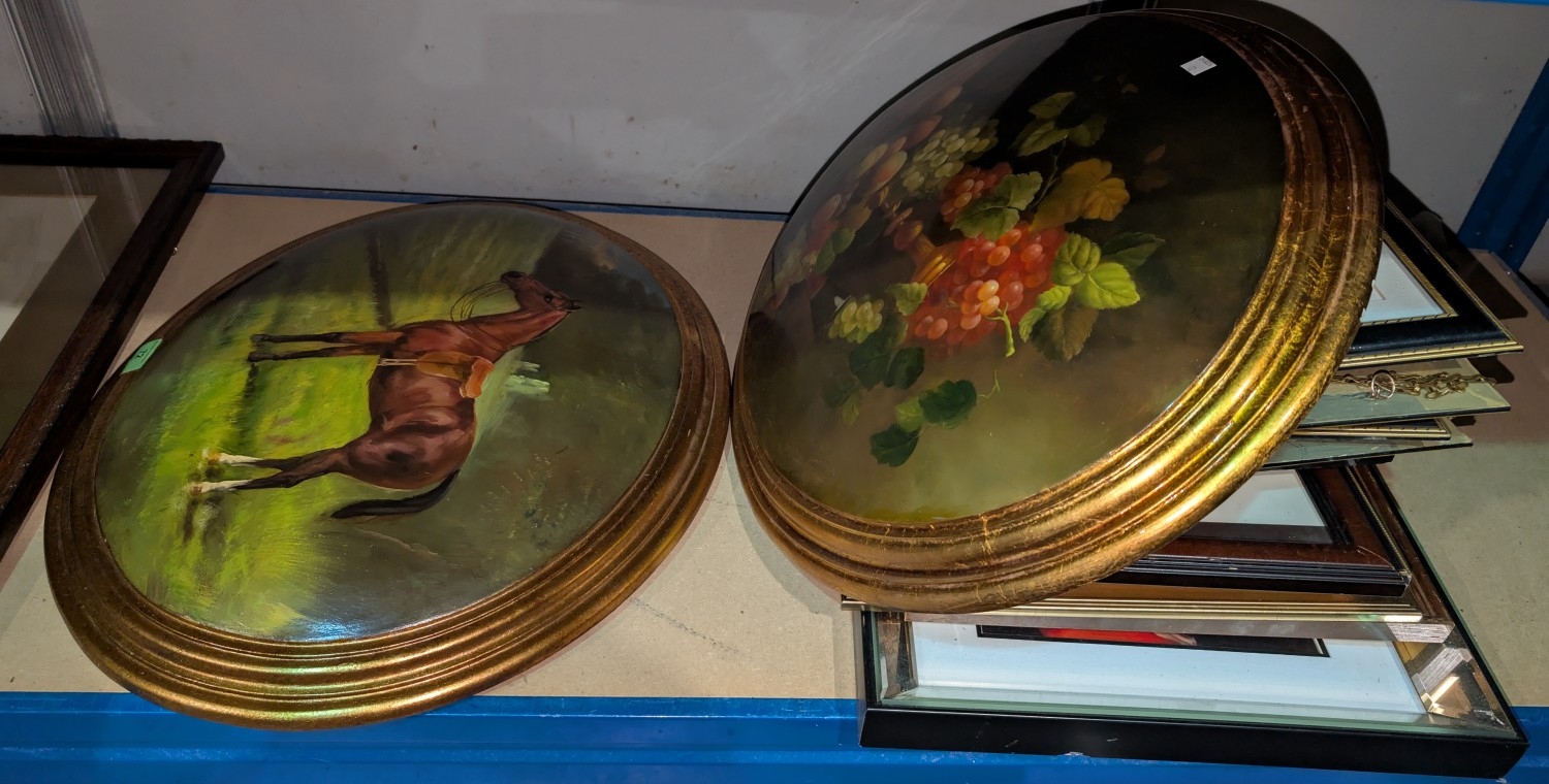 A painting of a horse on domed wood and a selection of similar pictures etc.