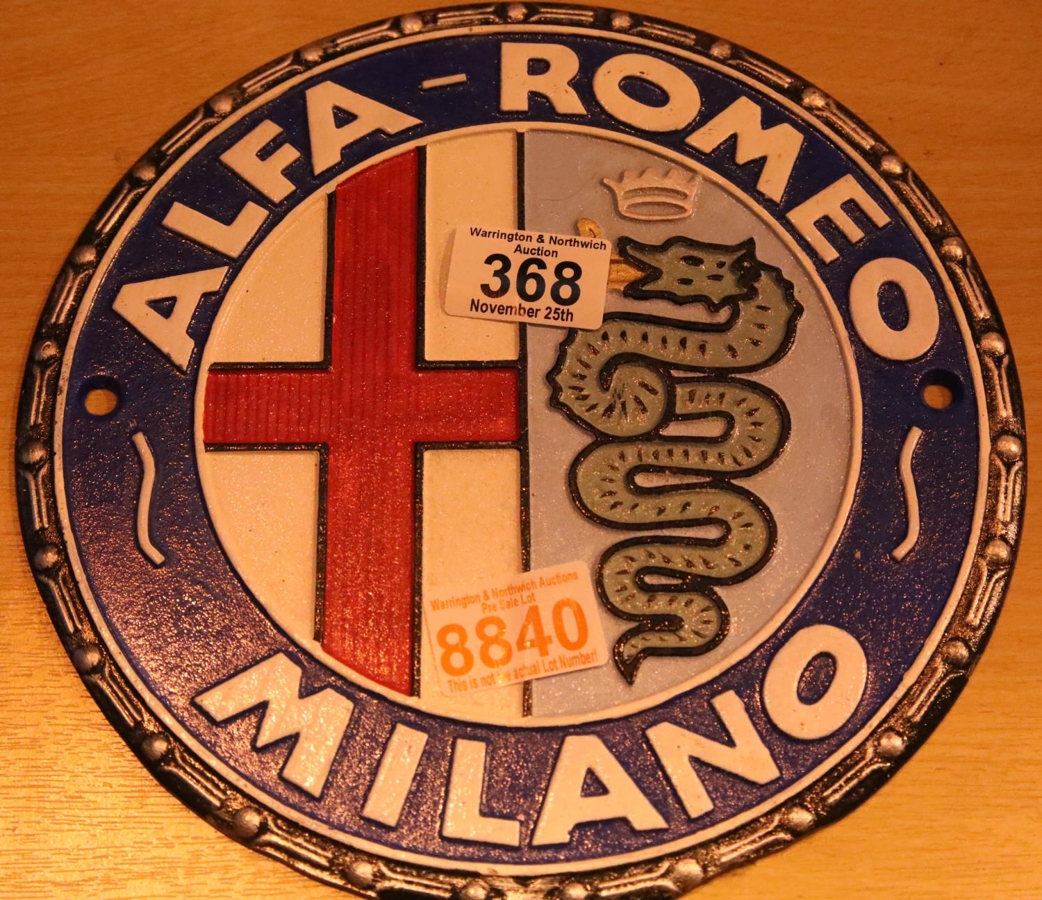 Cast iron Alfa Romeo Milano sign, D: 24 cm. P&P Group 1 (£14+VAT for the first lot and £1+VAT for subsequent lots)