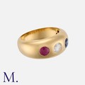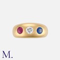 A Vintage Ruby, Sapphire and Diamond Three Stone Gypsy Ring in 18 carat gold, set with a round cut diamond to the centre of approximately 0.45 carats, flanked on one side with a round cut ruby, the other side with a round cut sapphire. Unmarked, tests indicate 18 carat gold.