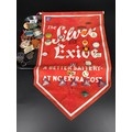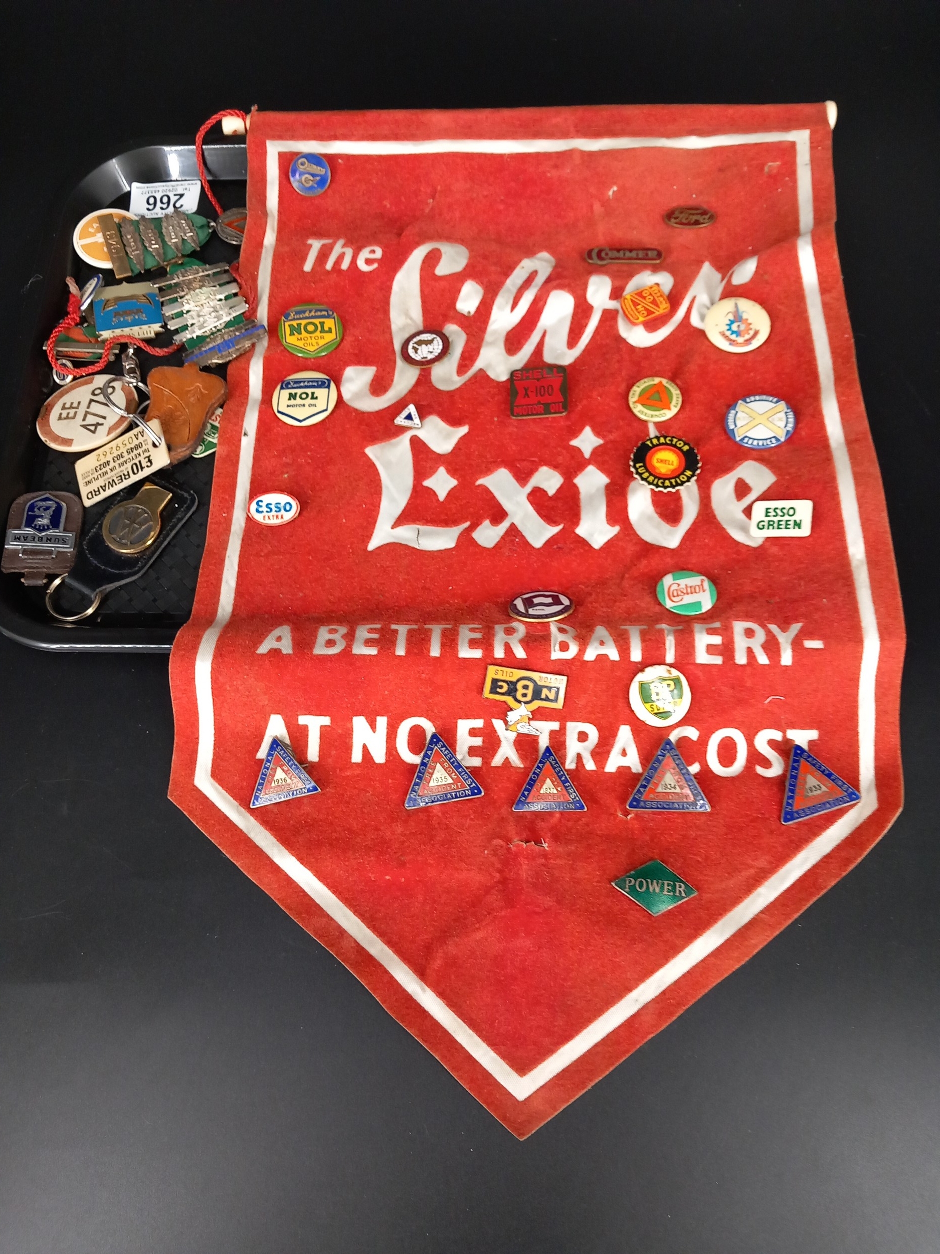 Various motoring pin badges and medals - some mounted on an Exide Advertising flag - Safe Driving, Duckhams, Shell, Castrol, Esso etc