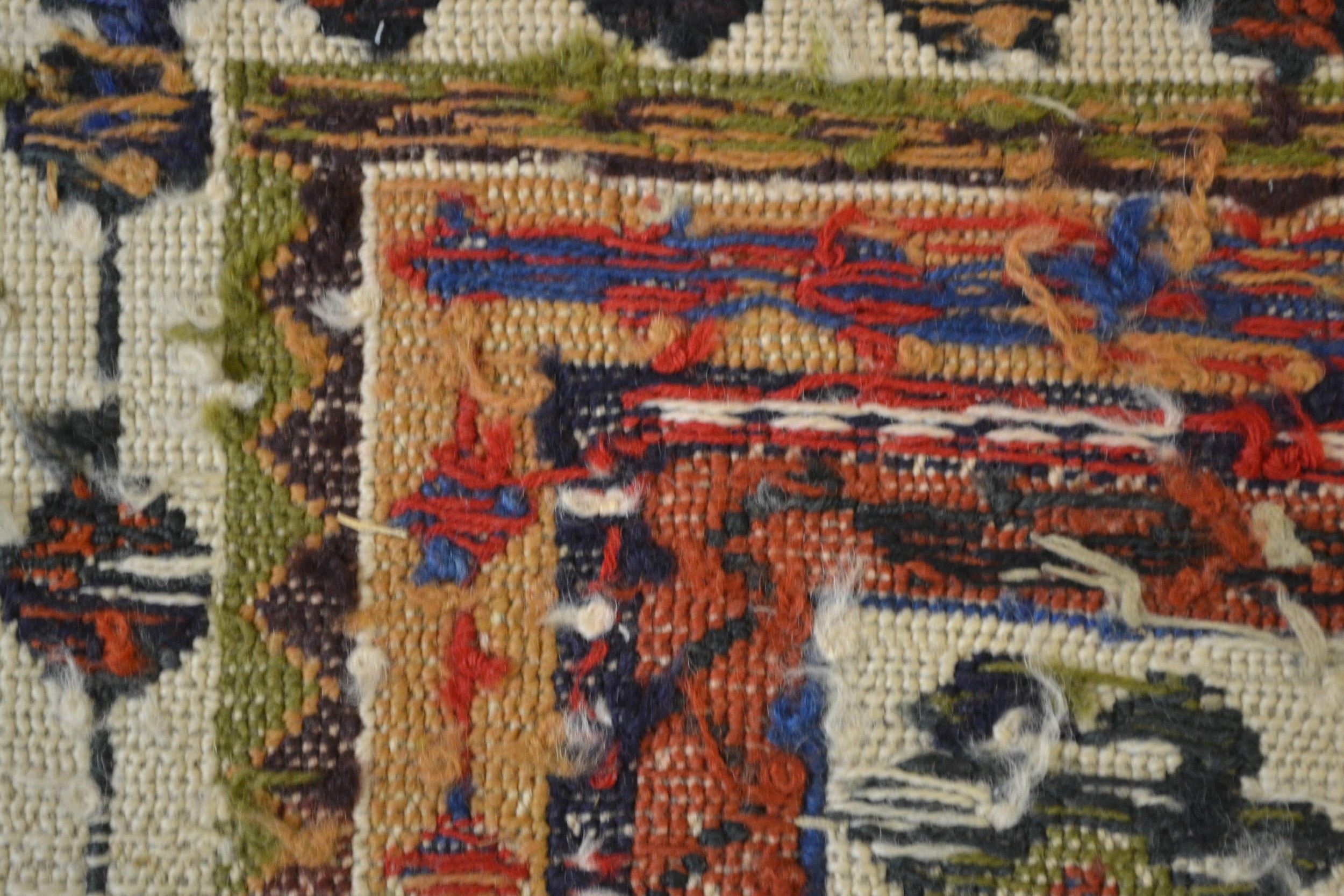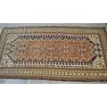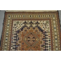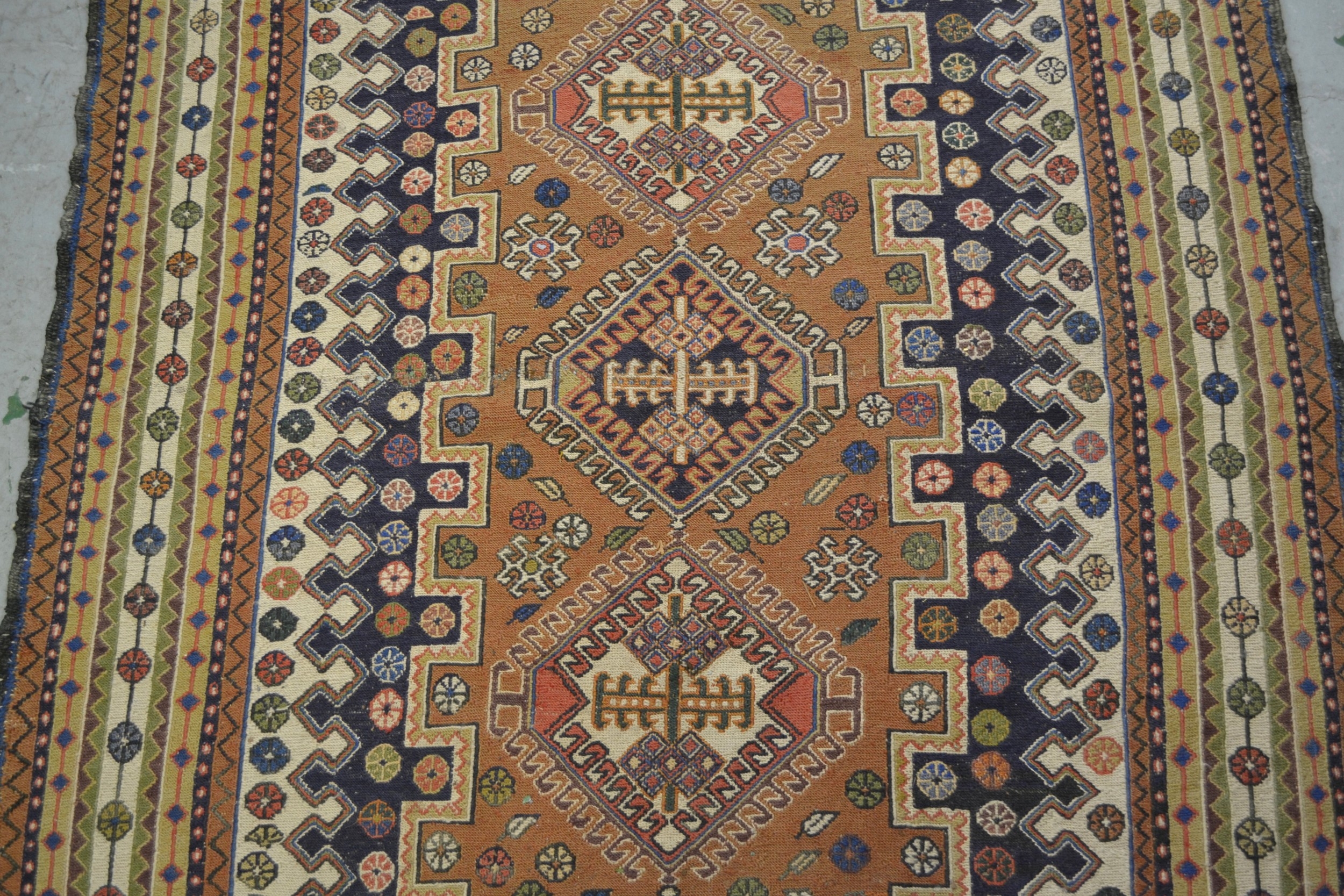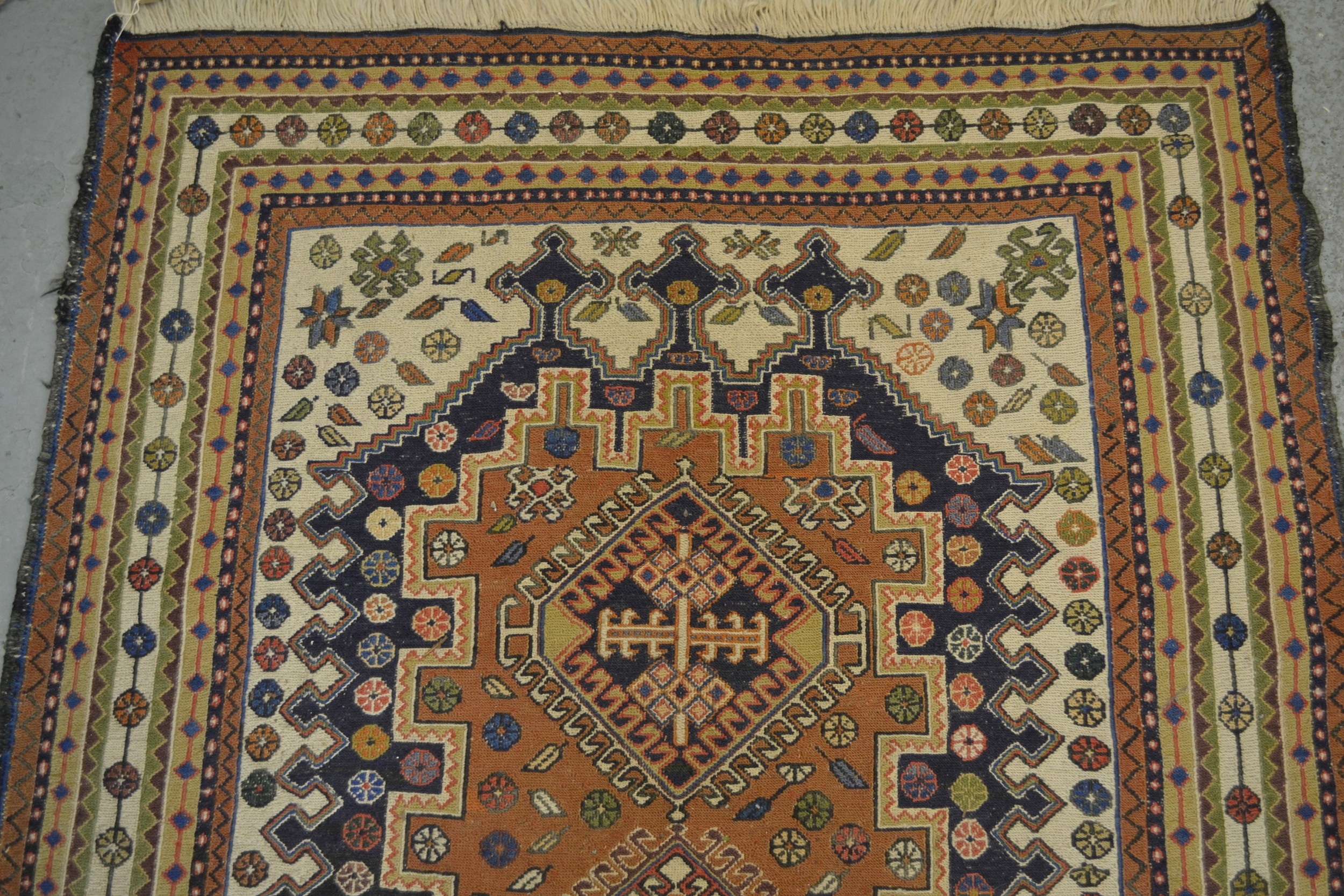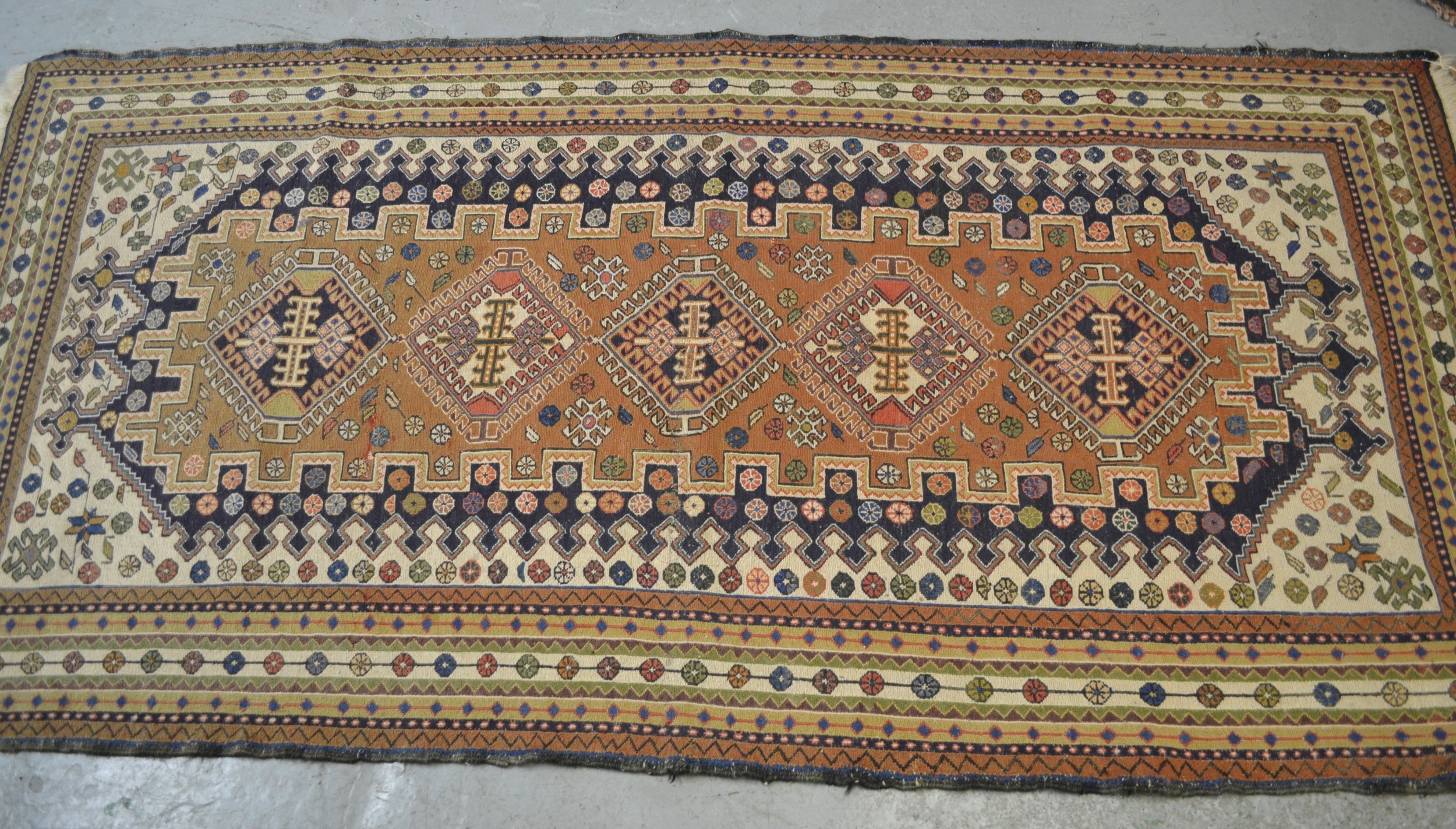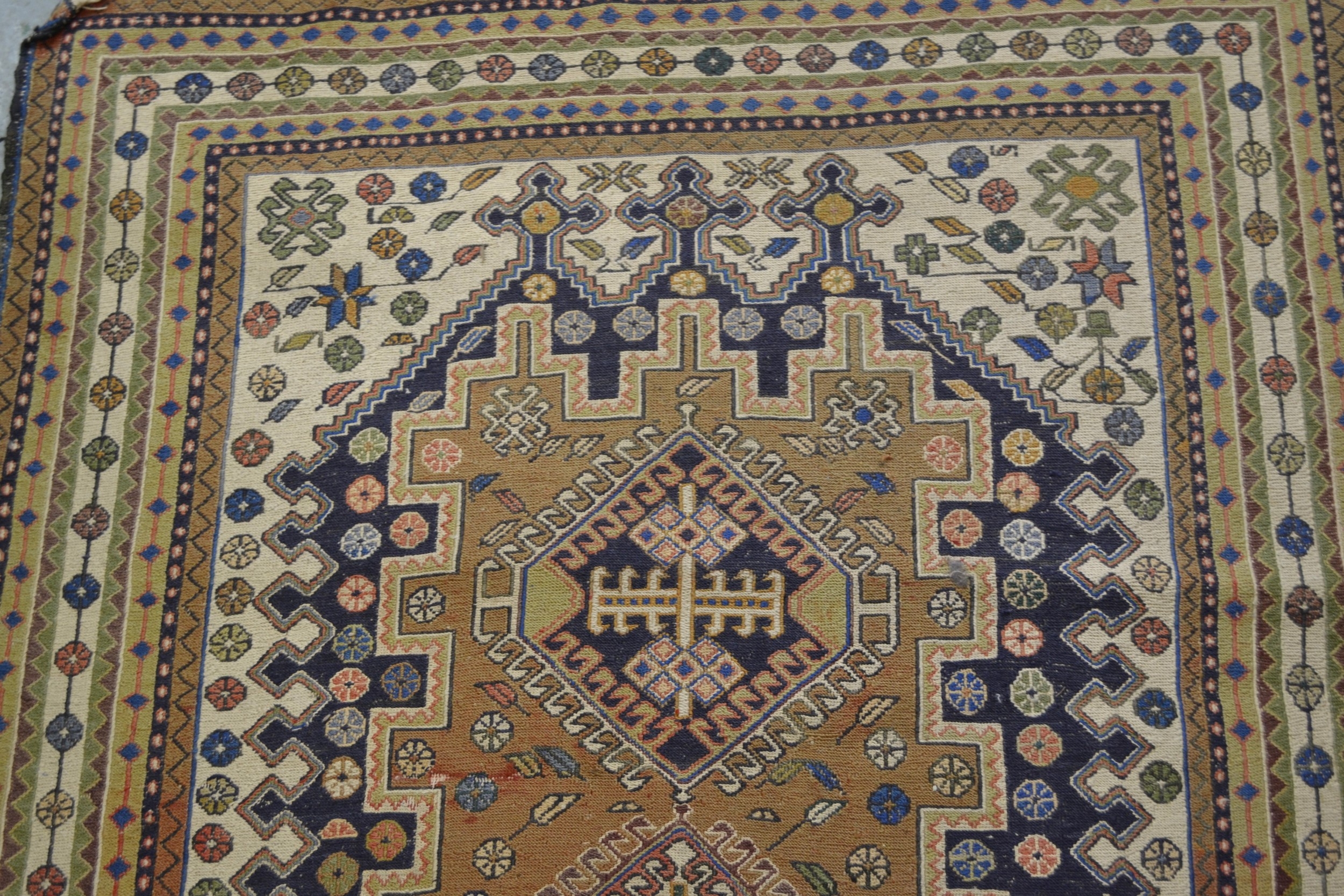 Soumak rug with a hooked medallion design in shades of blue, pink, beige, cream and pale green, 223 x 115cm approximately