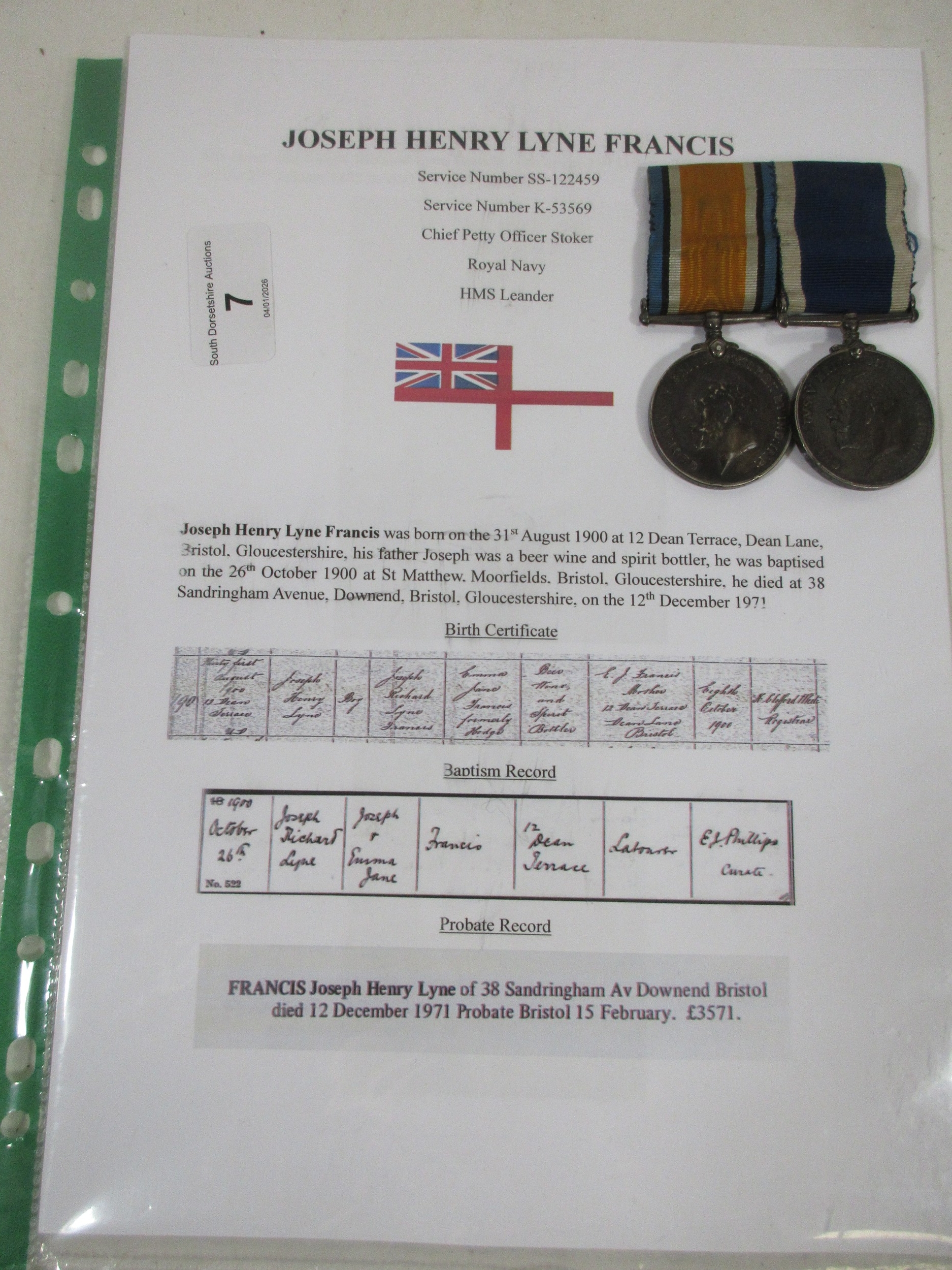 A WW1 Royal Navy medal pair comprising a British War Medal and a Navy Long Service & Good Conduct Medal, the former inscribed to K53569 J H L Francis Sto 2 RN, the latter inscribed to K53569 J H L Francis SPO HMS Leander, mounted for wear. Includes a sheaf of military and genealogical research.