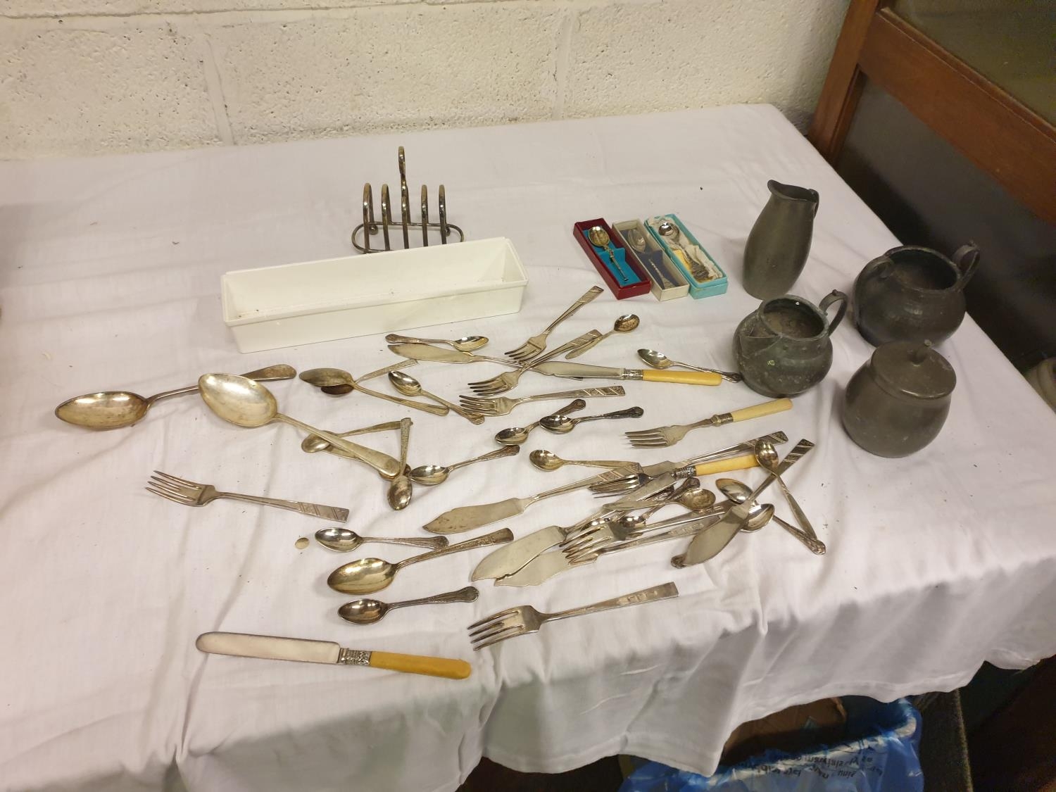 Box to Include Pewter Jugs & Bowls, Plated Cutlery & Toast Rack etc.