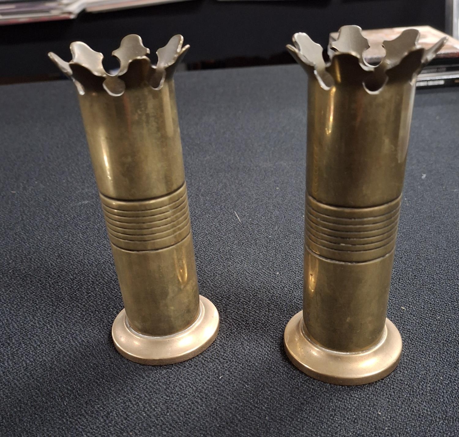 Pair of trench art (unmarked but prob WWI era) eclastical themed bud vases (2).