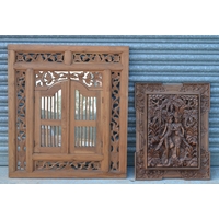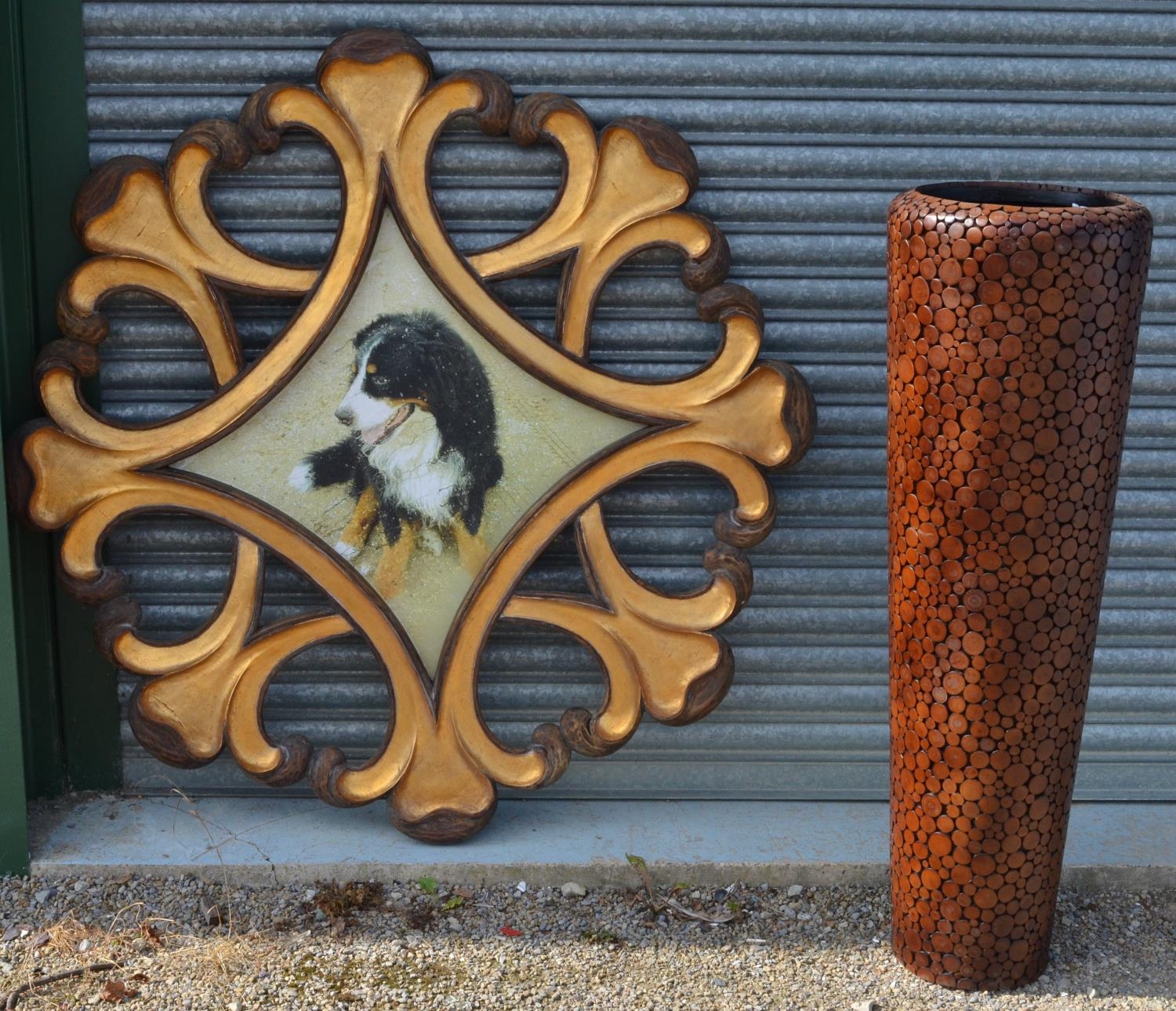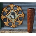 Circular scrolled open work frame containing of a printed study of a collie. D134cm, large floor vase decorated with cork roundalls H126cm (2)