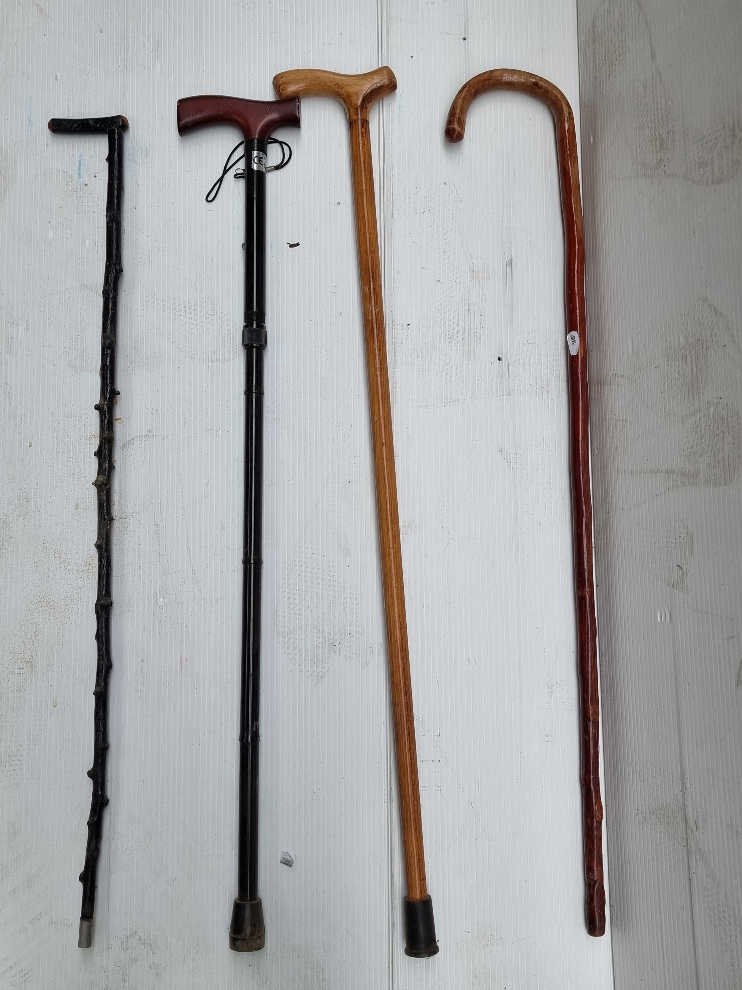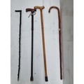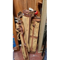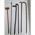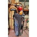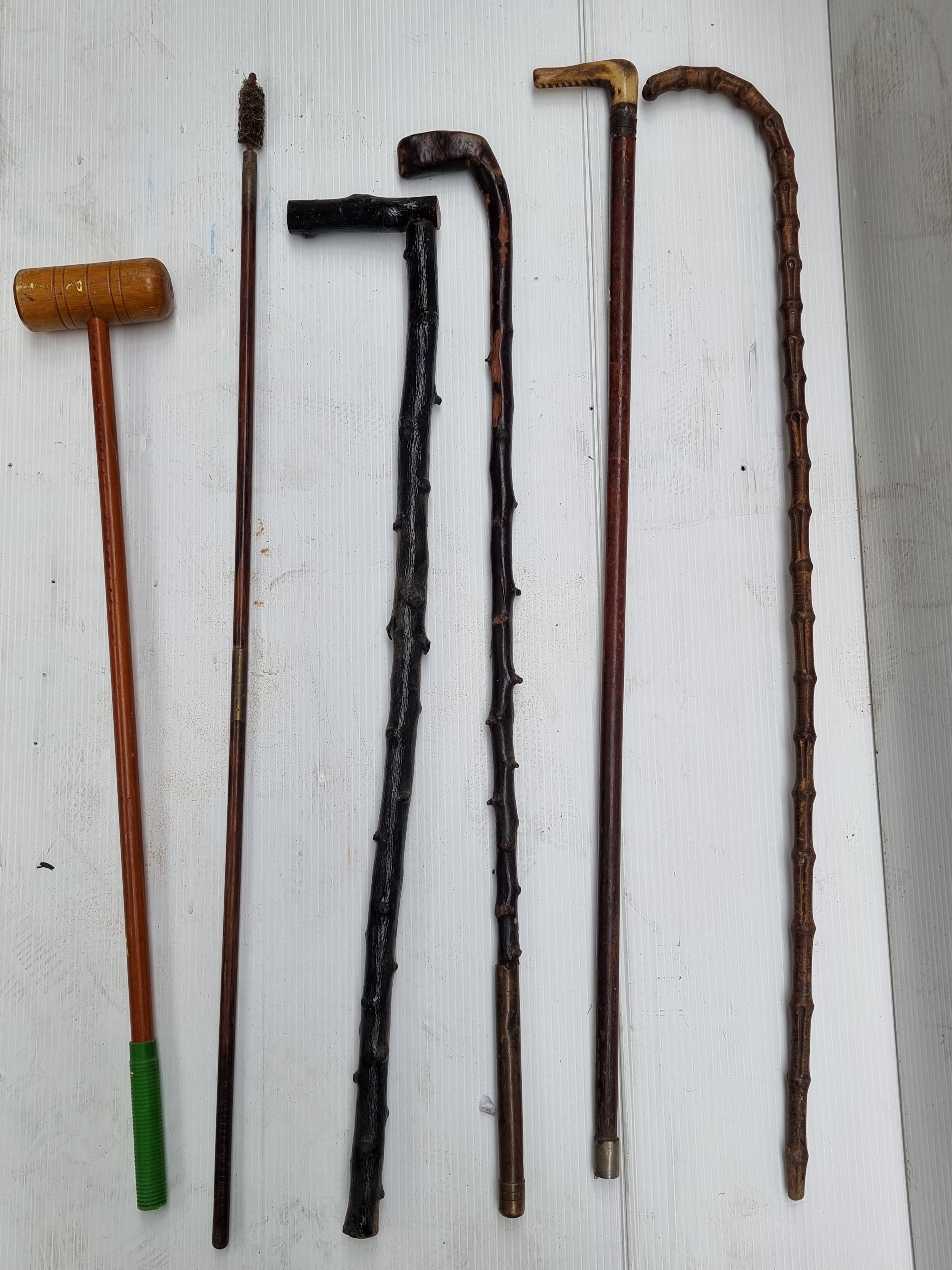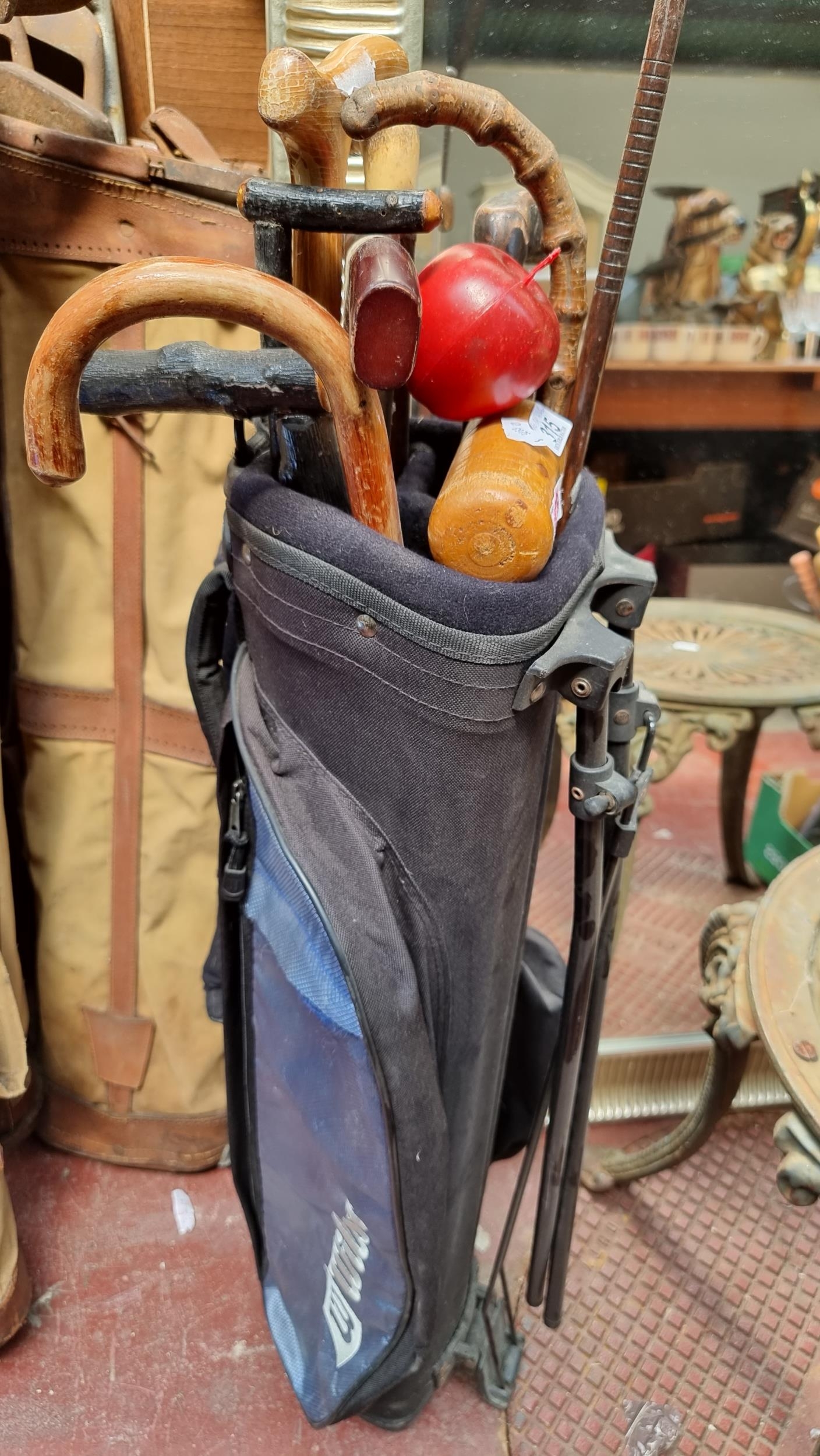 A golf bag filled with vintage walking sticks including a natural form example and one with horn handle. Also a mallet for croquet etc.
