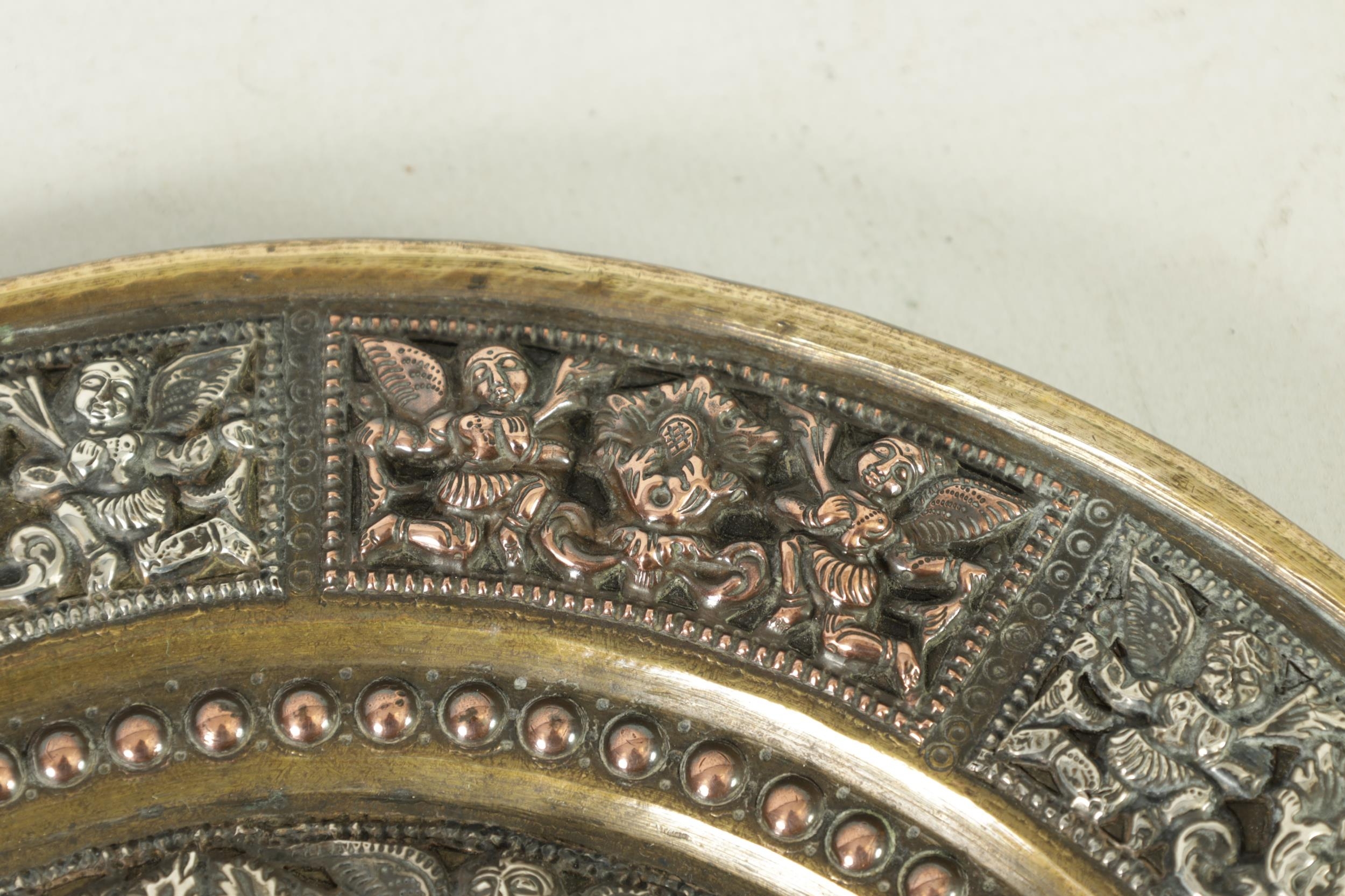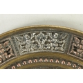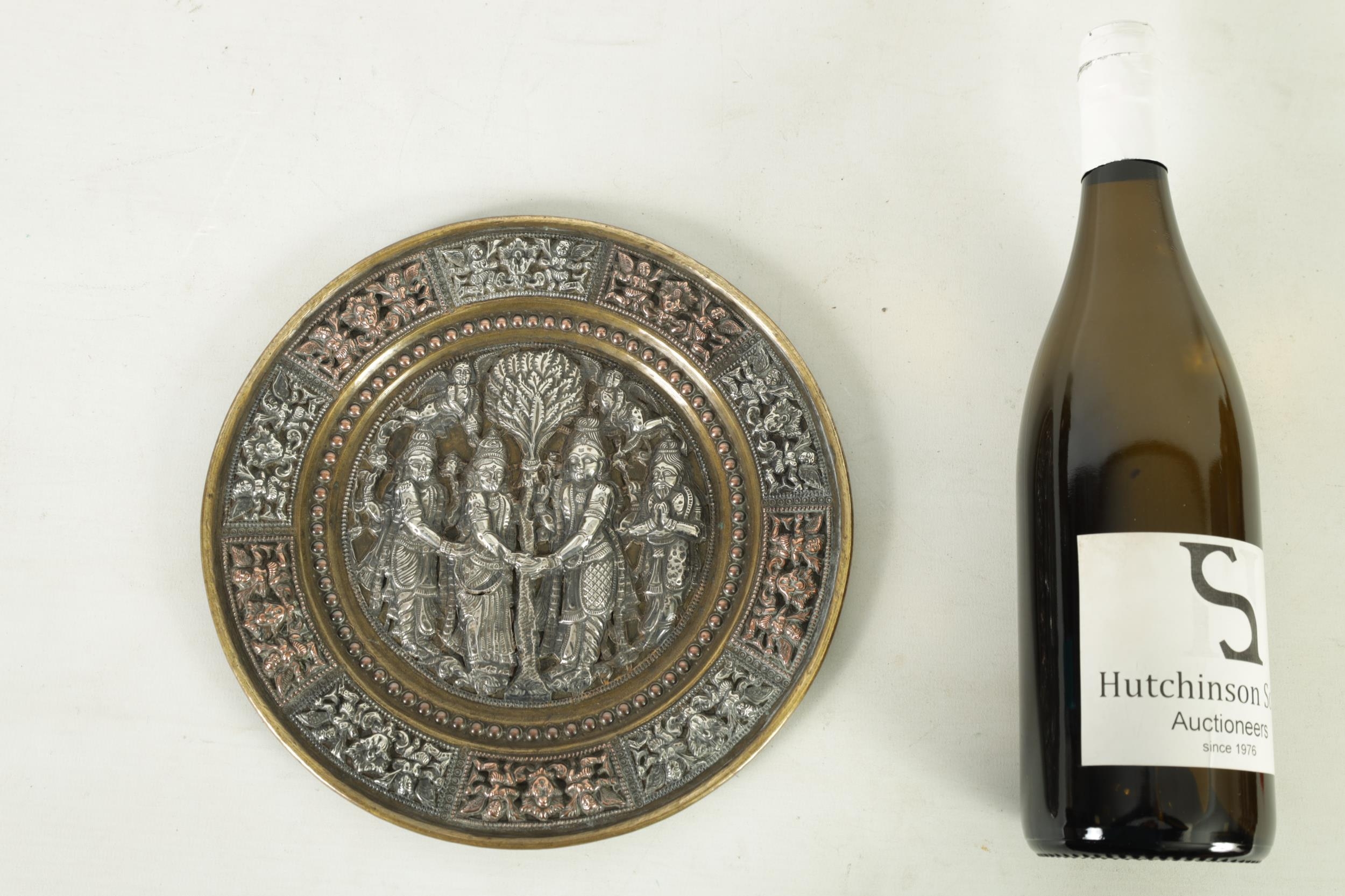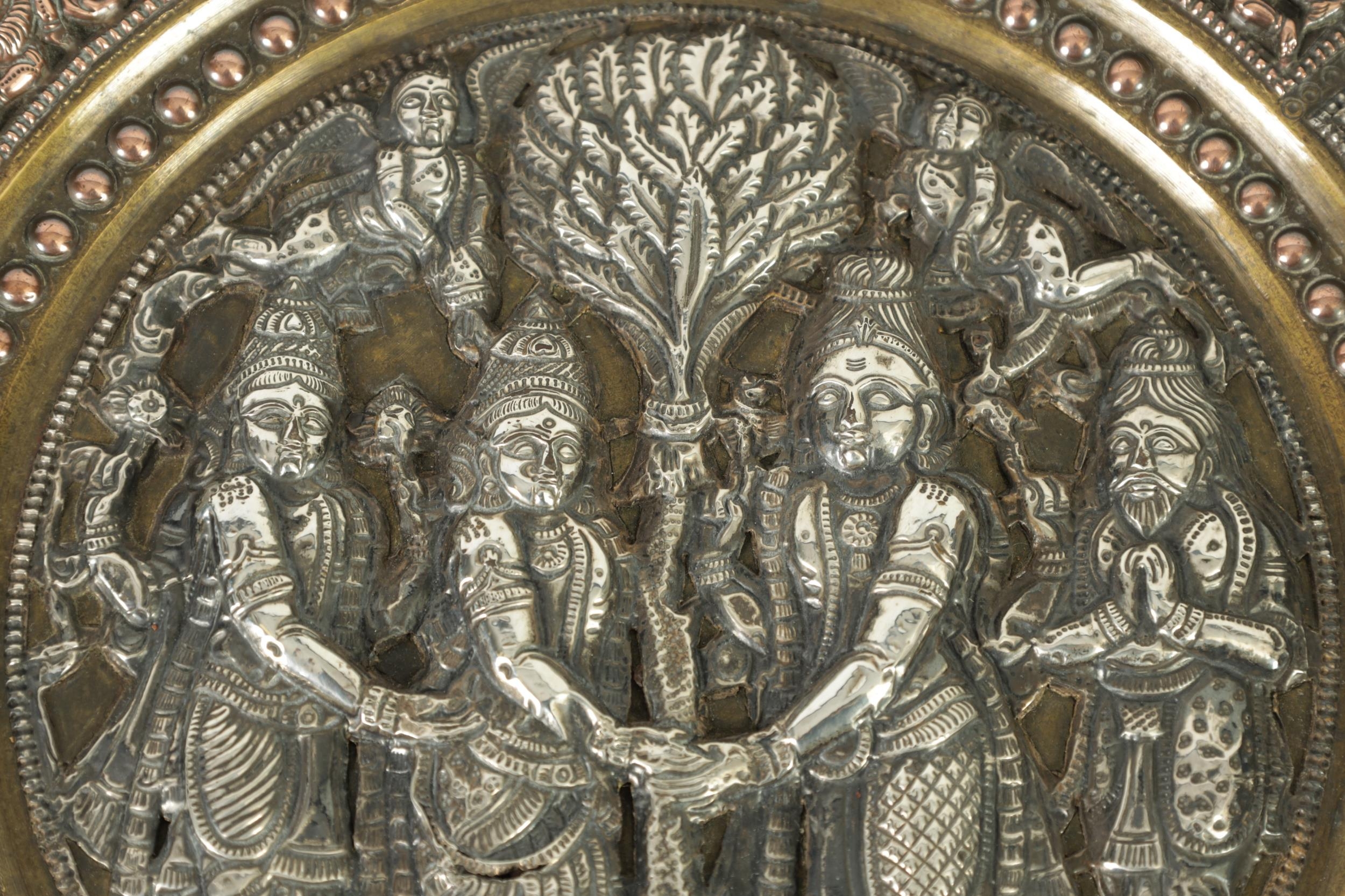 A LATE 19TH CENTURY INDIAN BRONZE AND MIXED METAL PLAQUE with silver and copper metal figural relief decoration (24cm diameter )
