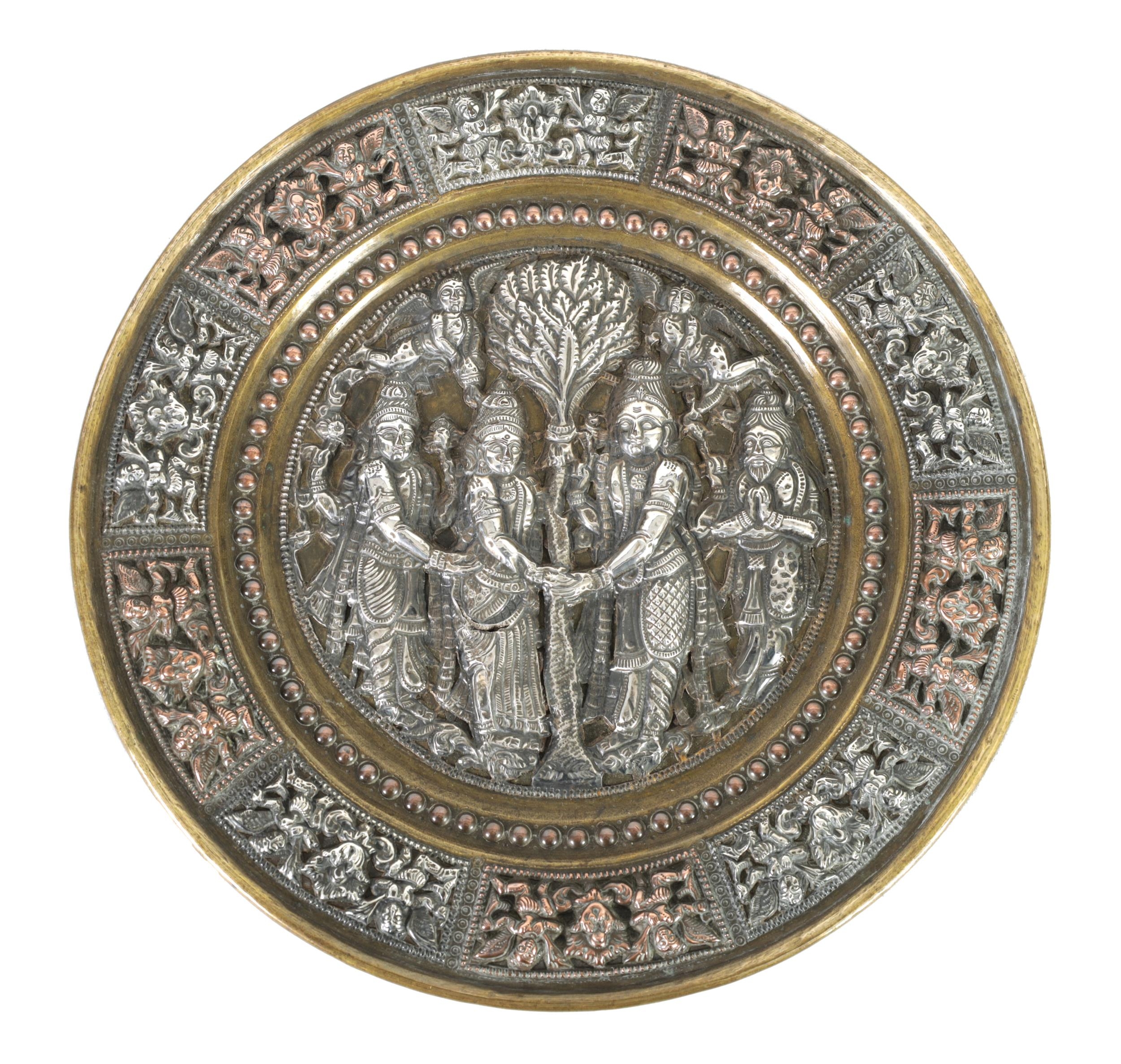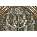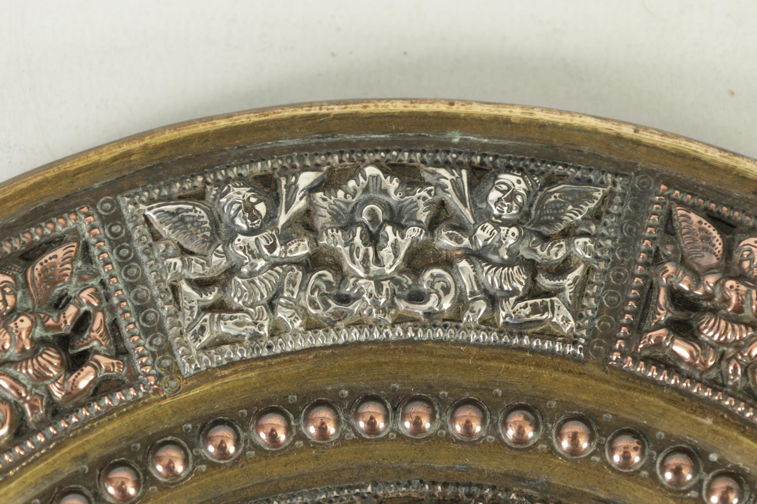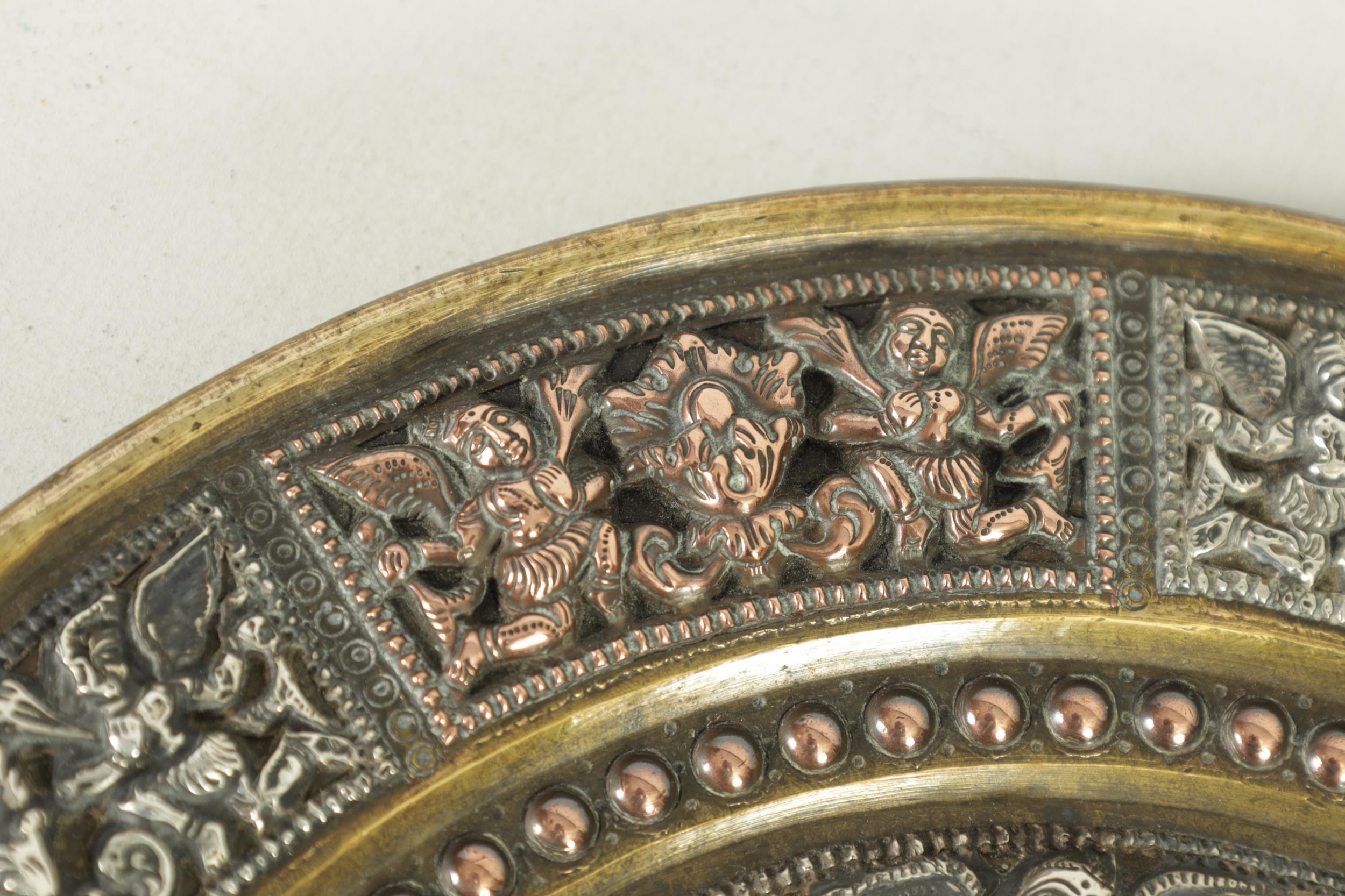 A LATE 19TH CENTURY INDIAN BRONZE AND MIXED METAL PLAQUE with silver and copper metal figural relief decoration (24cm diameter )