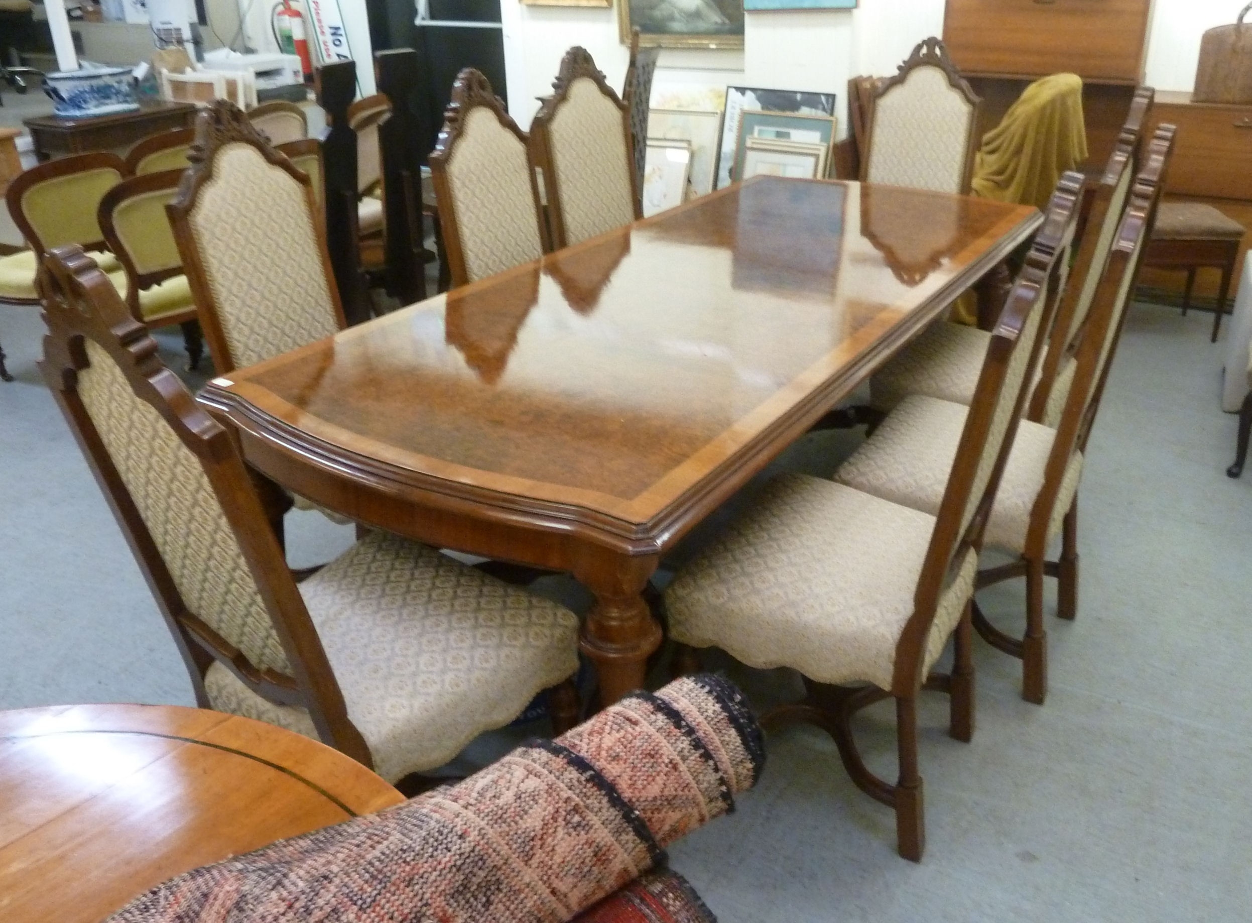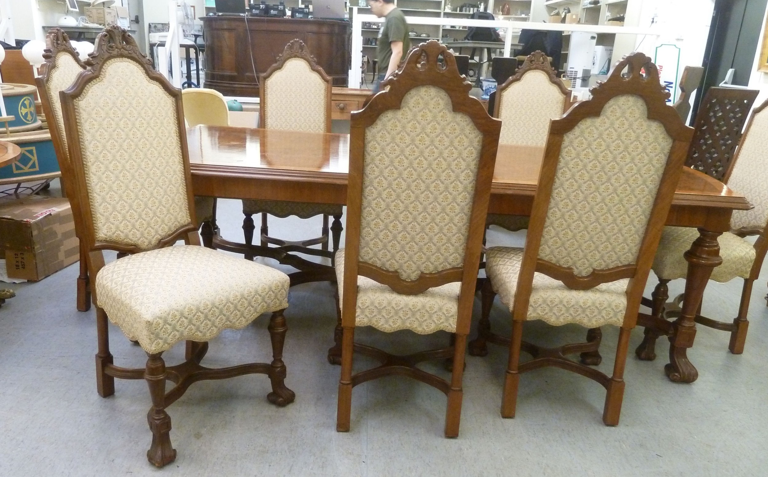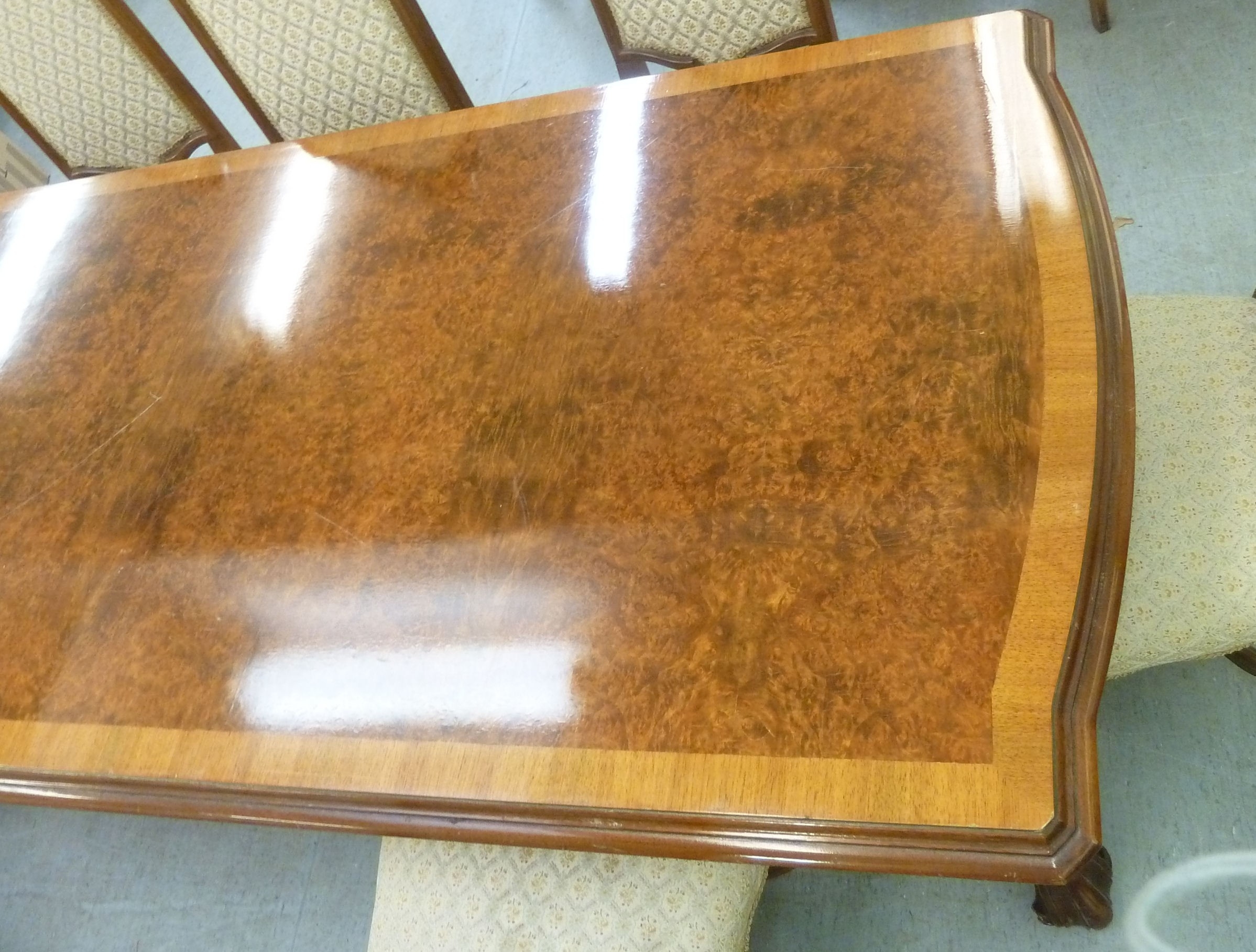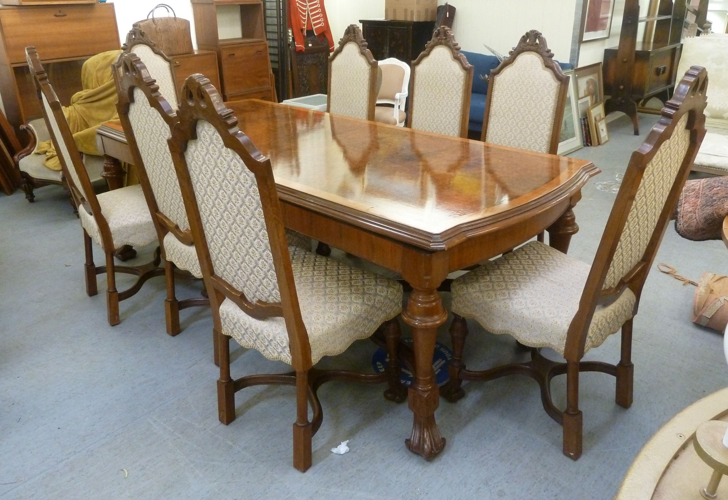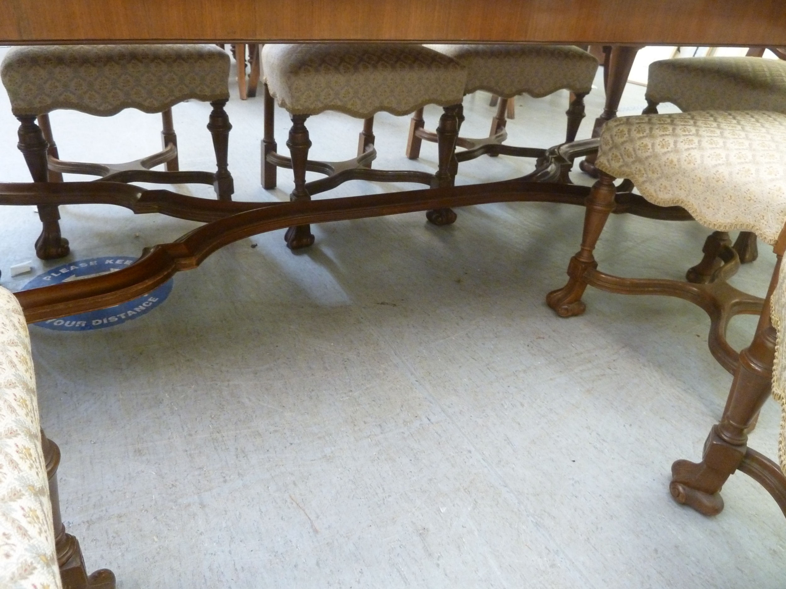 A modern Continental inspired walnut and mahogany finished dining table with a thumb moulded edge, raised on turned and block legs, united by free-flowing stretchers 30"h 95"L; and a matching set of eight standard mahogany framed and foliage pattern fabric upholstered chairs, raised on turned legs and C-scroll feet