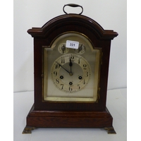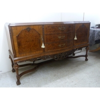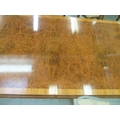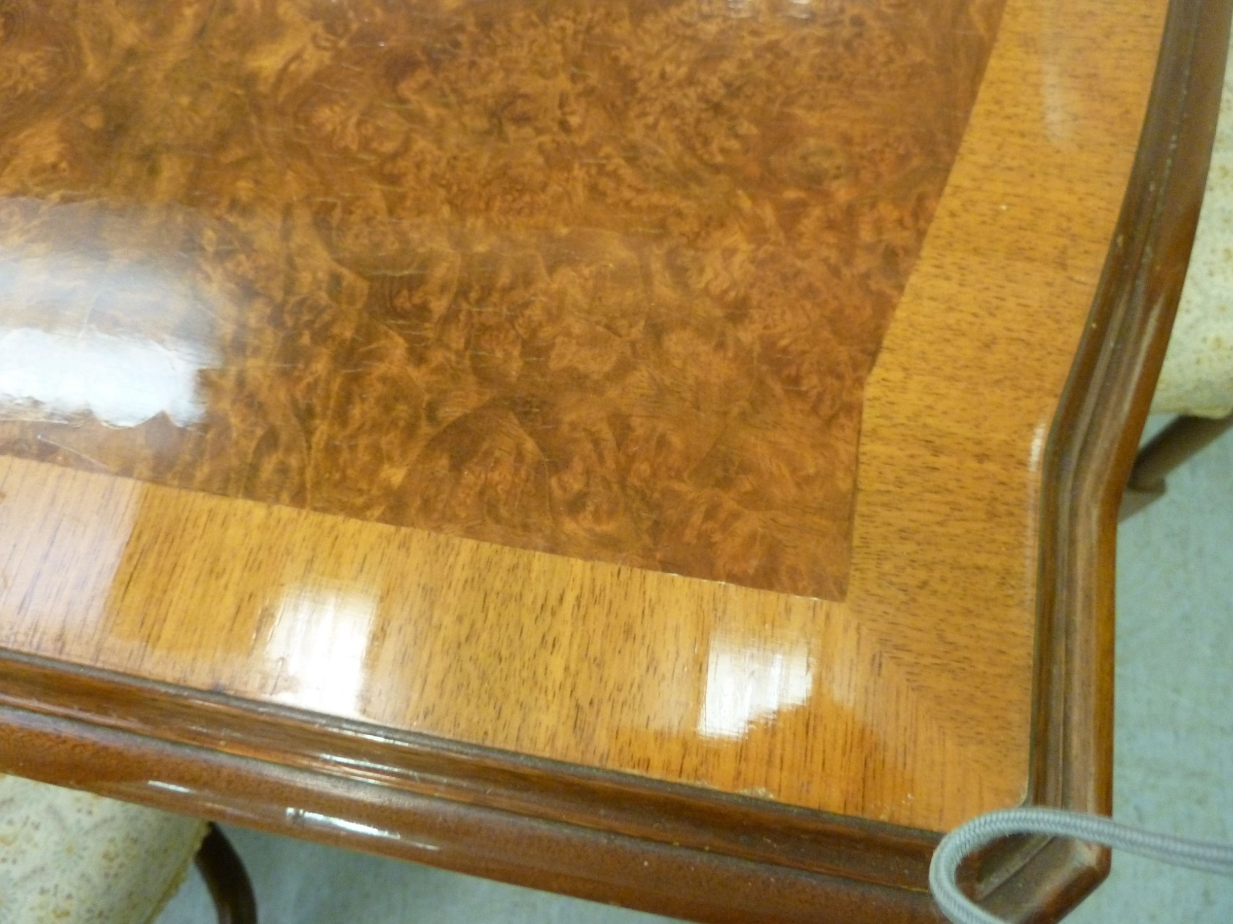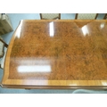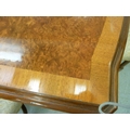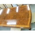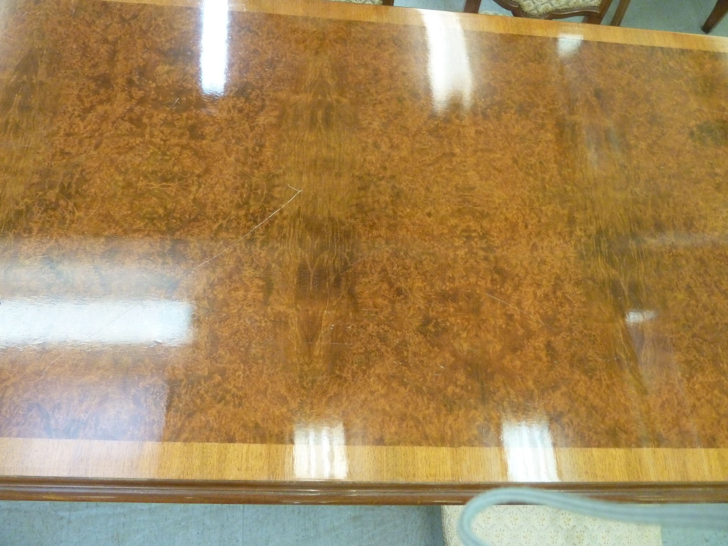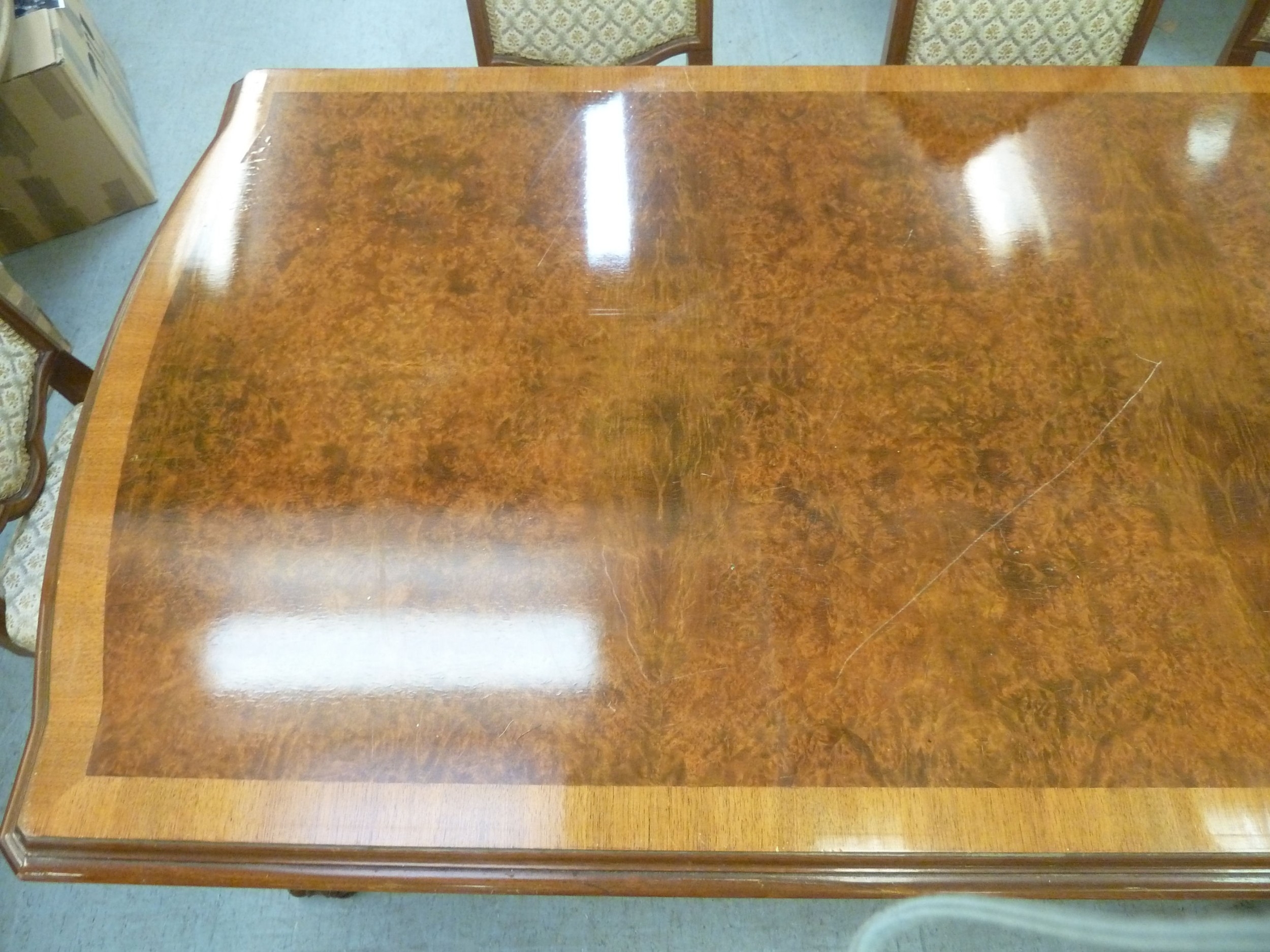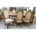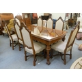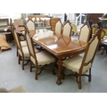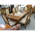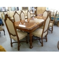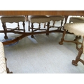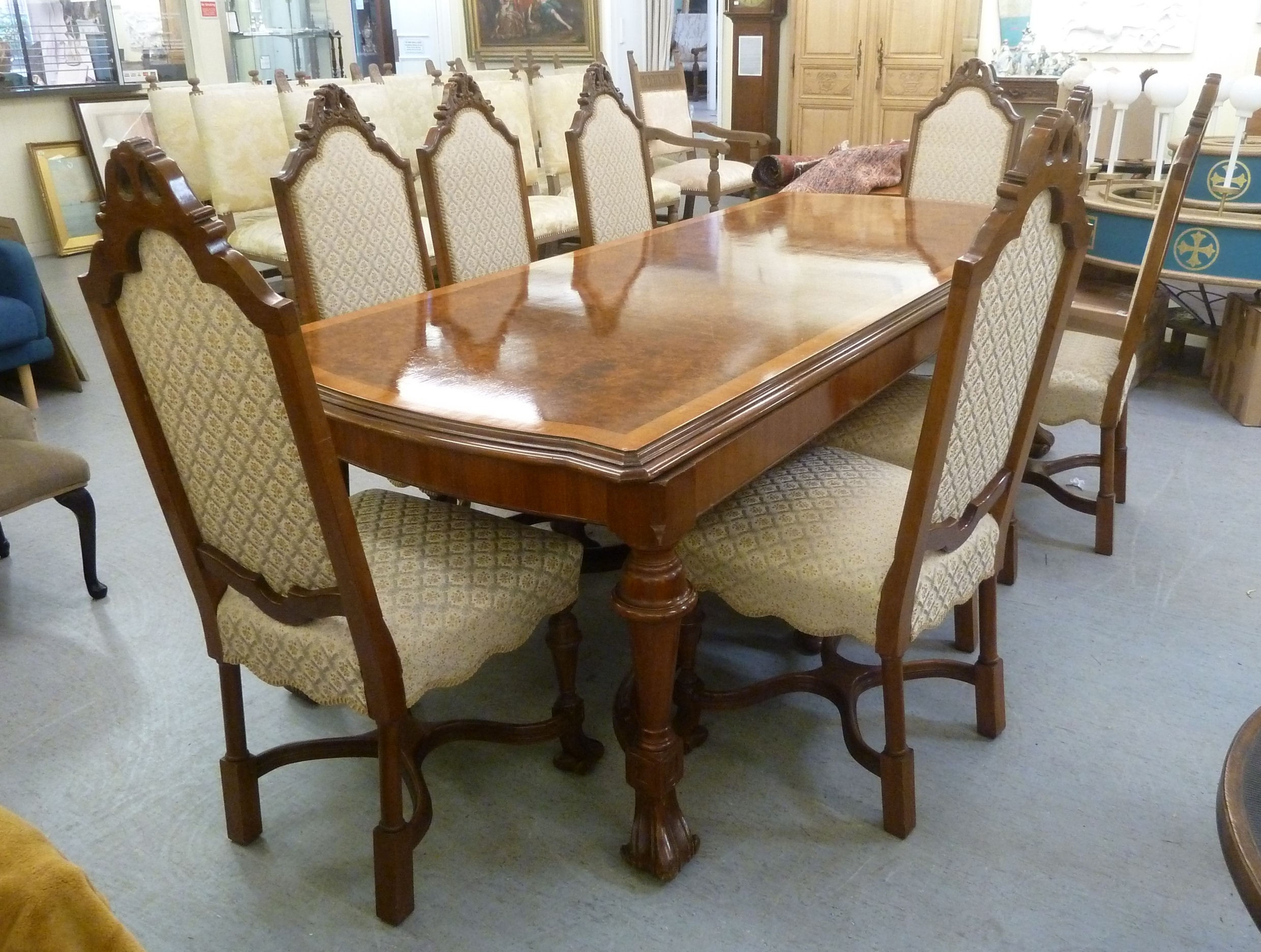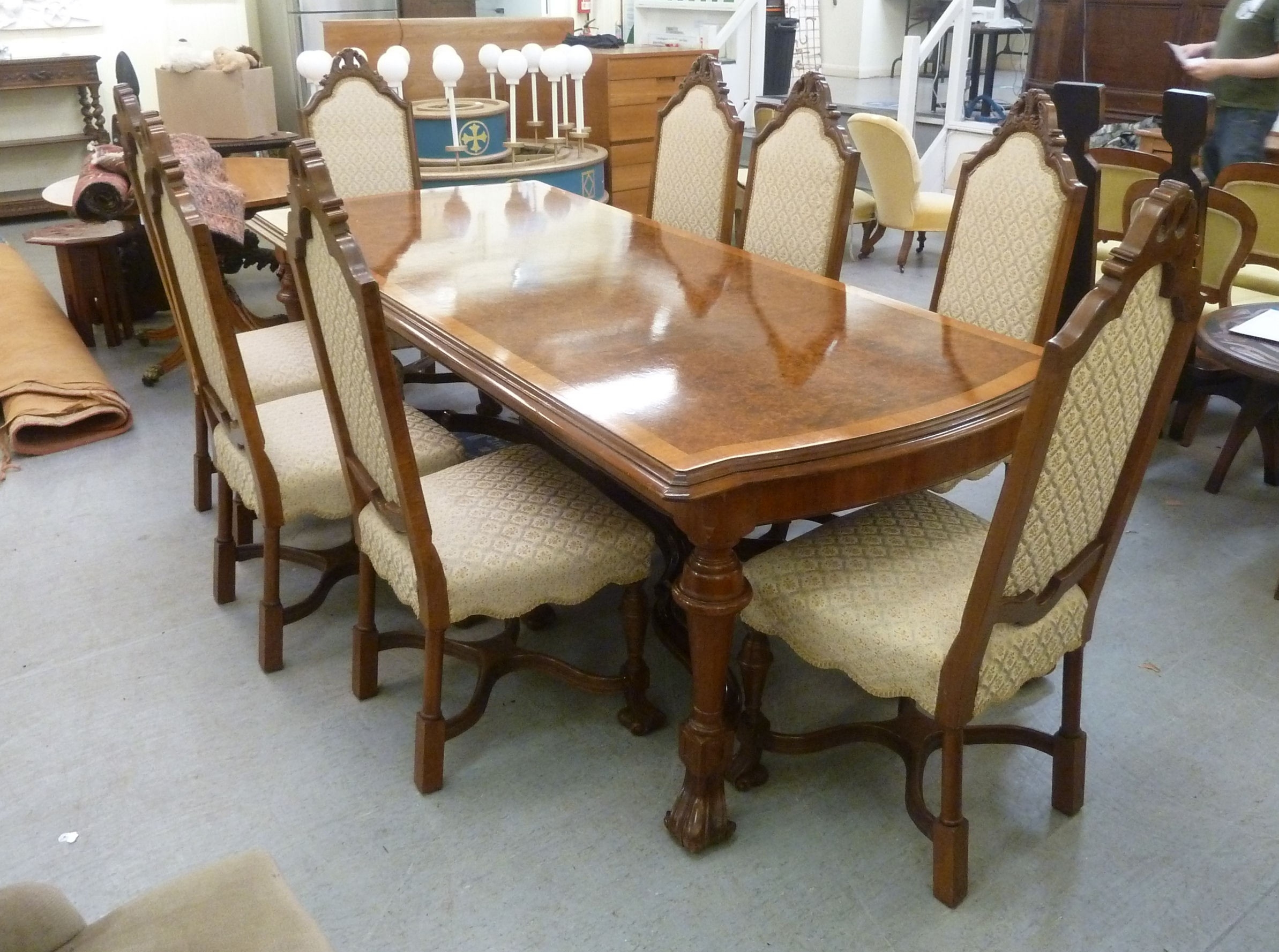 A modern Continental inspired walnut and mahogany finished dining table with a thumb moulded edge, raised on turned and block legs, united by free-flowing stretchers 30"h 95"L; and a matching set of eight standard mahogany framed and foliage pattern fabric upholstered chairs, raised on turned legs and C-scroll feet