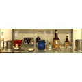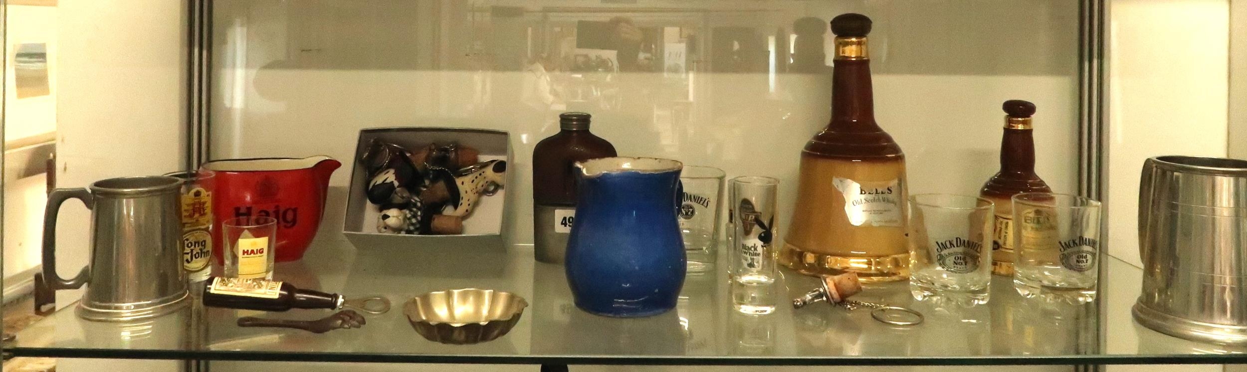 A group of drinking accoutrements, including a pewter, leather and glass hip flask, pewter pint and half pint tankards, various novelty bottle stoppers, a cat's paw bottle opener and others, a tasse-de-vin with crown centre, and a Haig whisky jug, various advertising glasses and a blue jug..