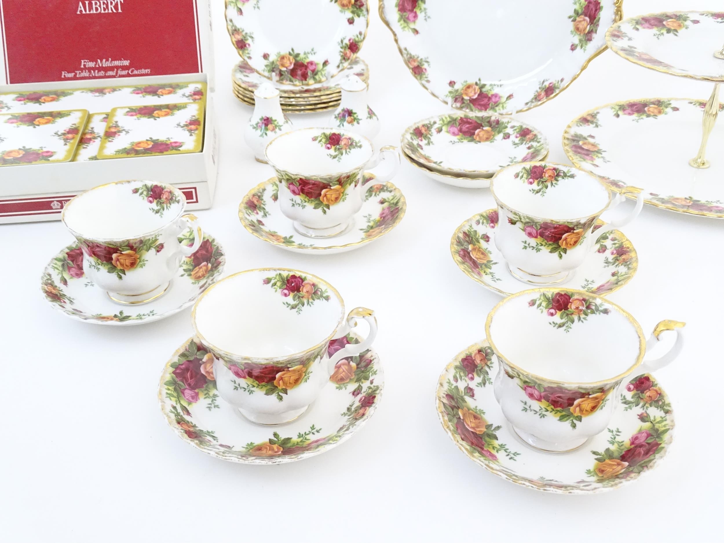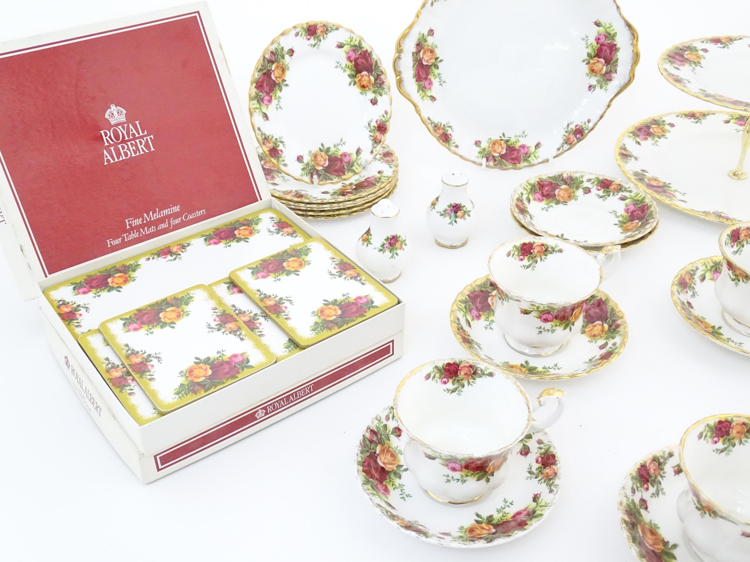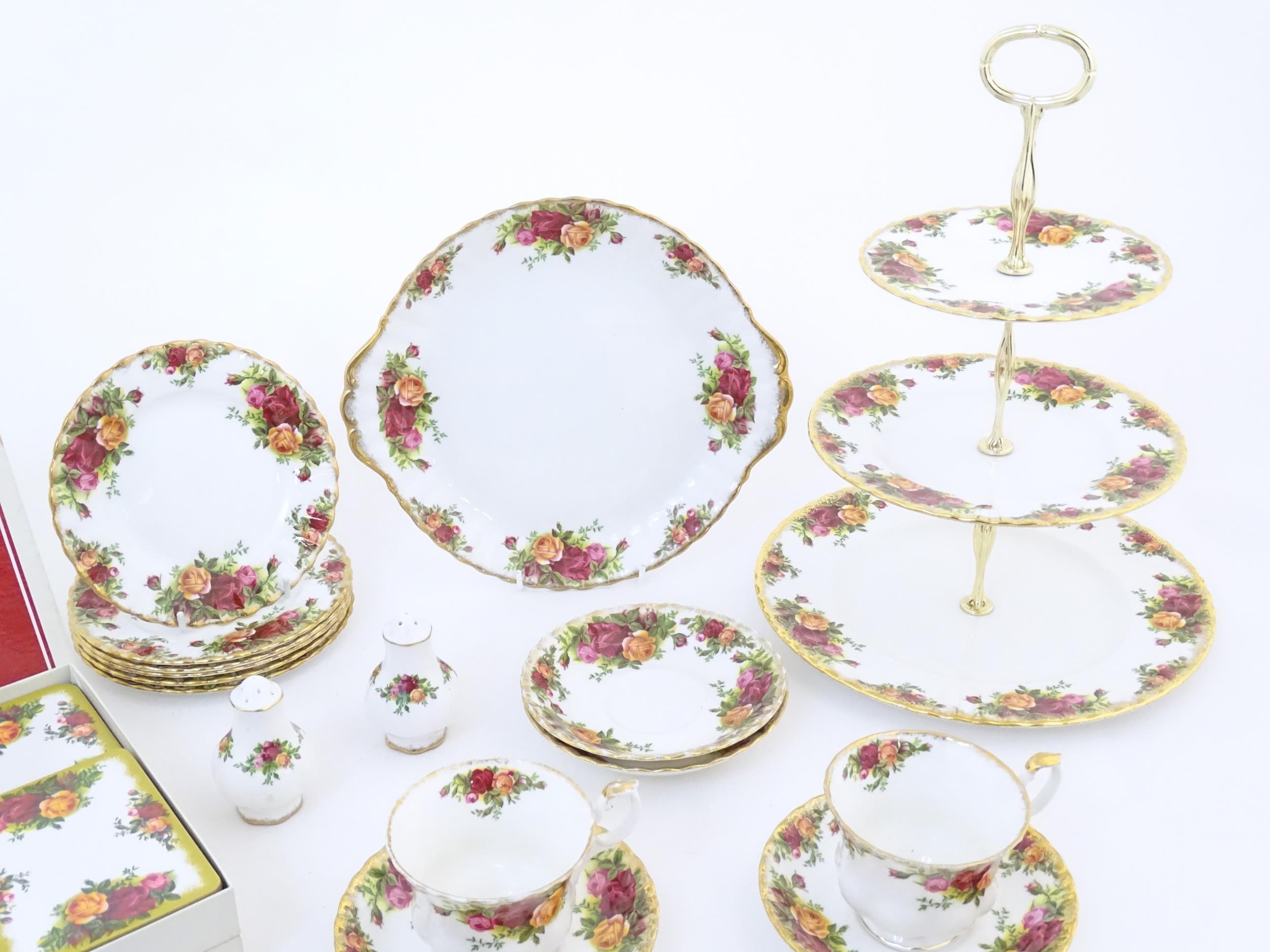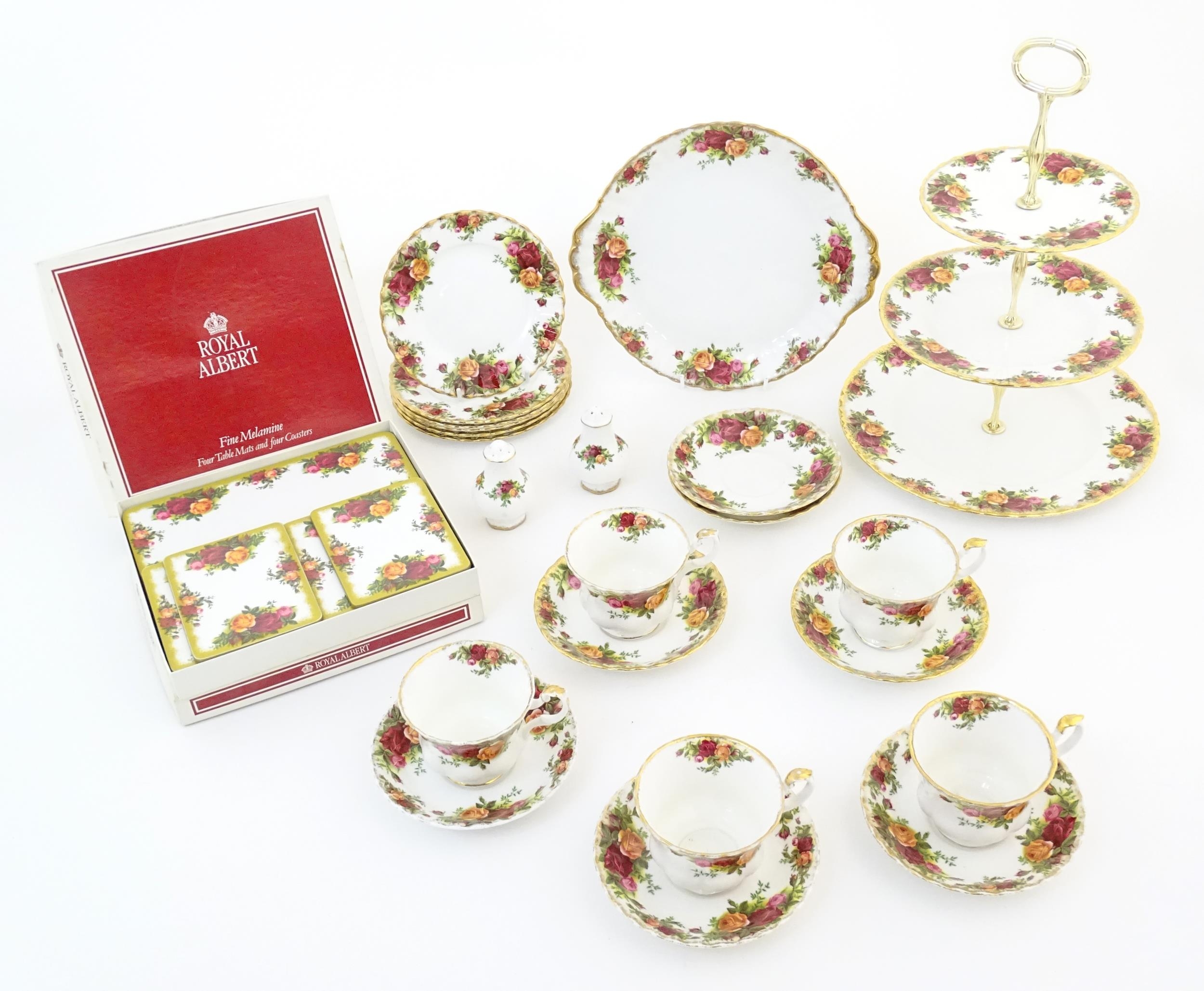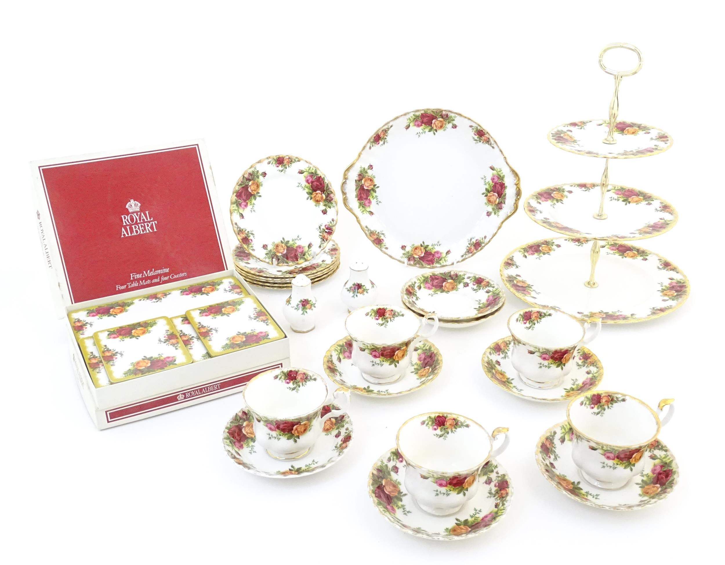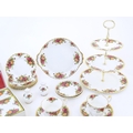 A quantity of Royal Albert tea wares in the Old Country Roses pattern, to include cake plate, tea cups and saucers, plates, pepperettes, three tier cake stand, etc. Marked under. Cake plate approx. 10 1/2" wide (Approx. 20 pieces)