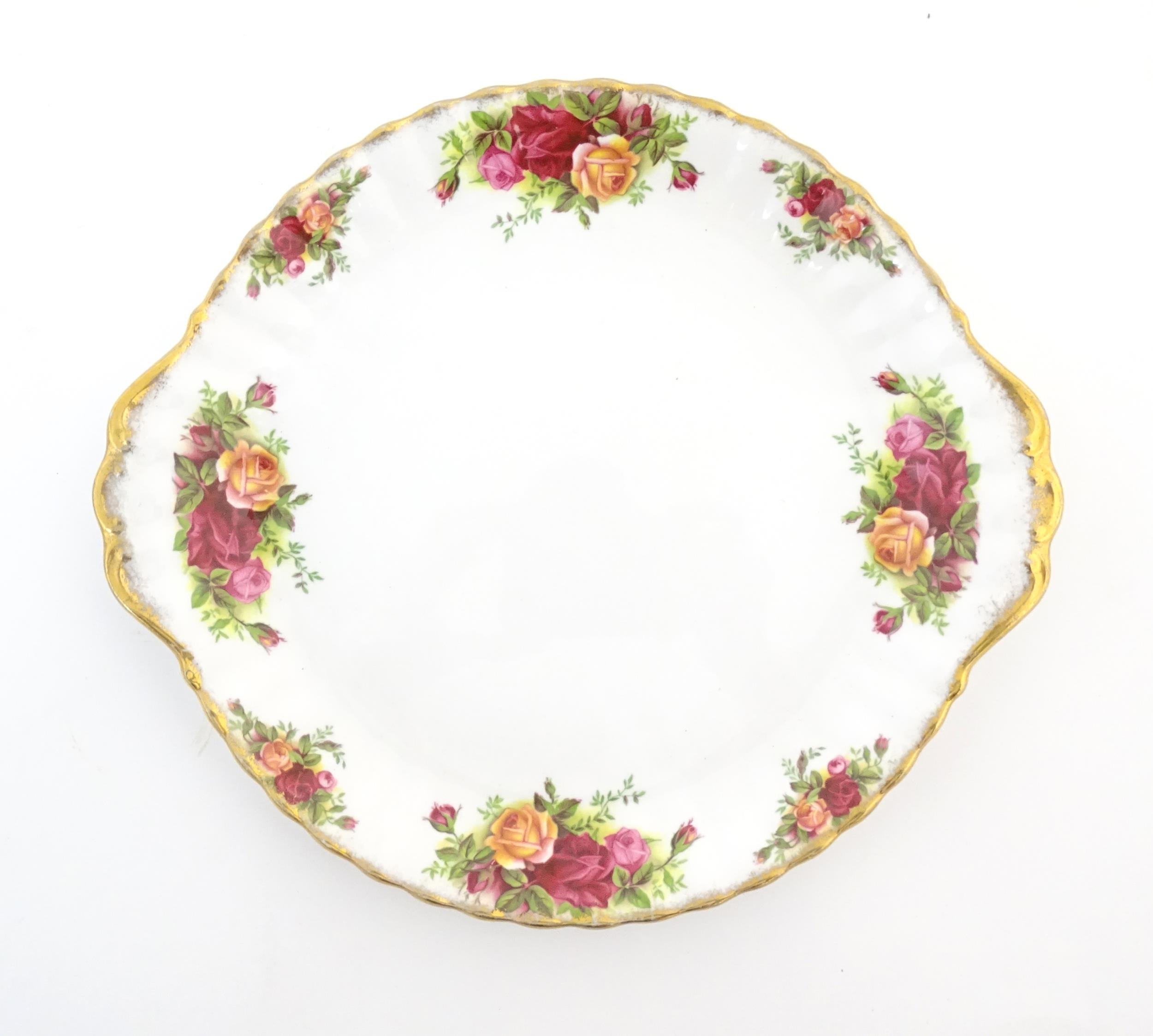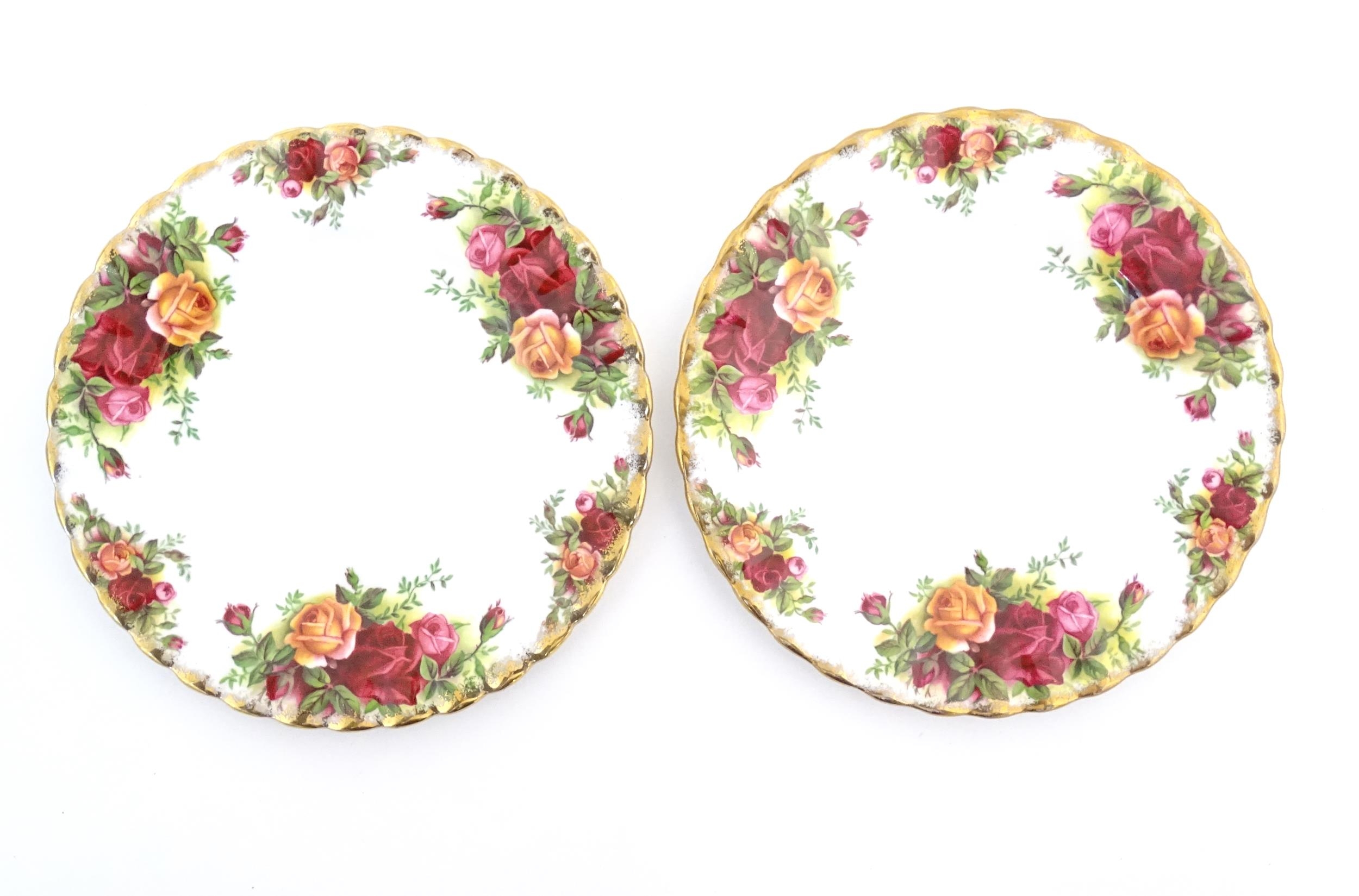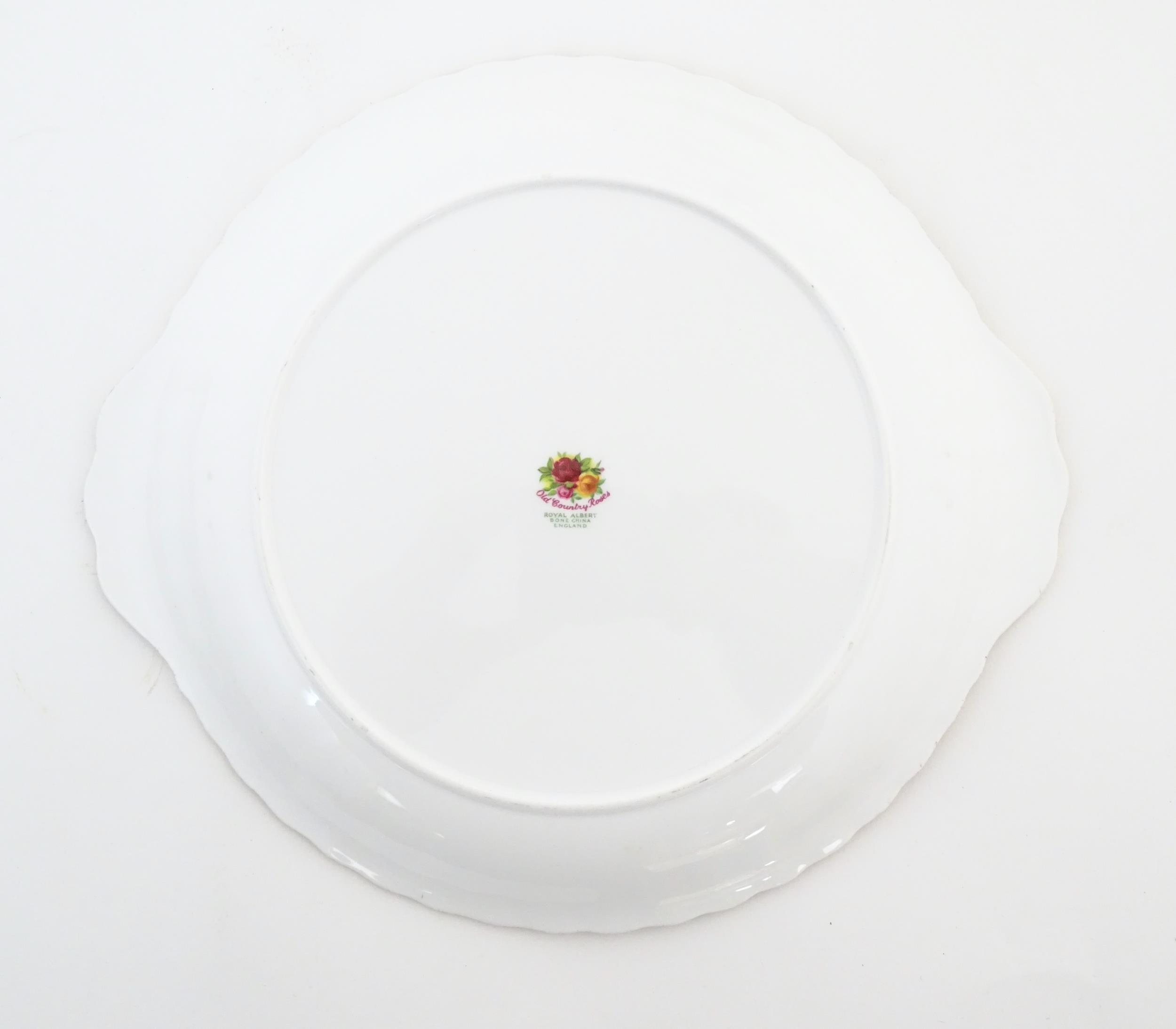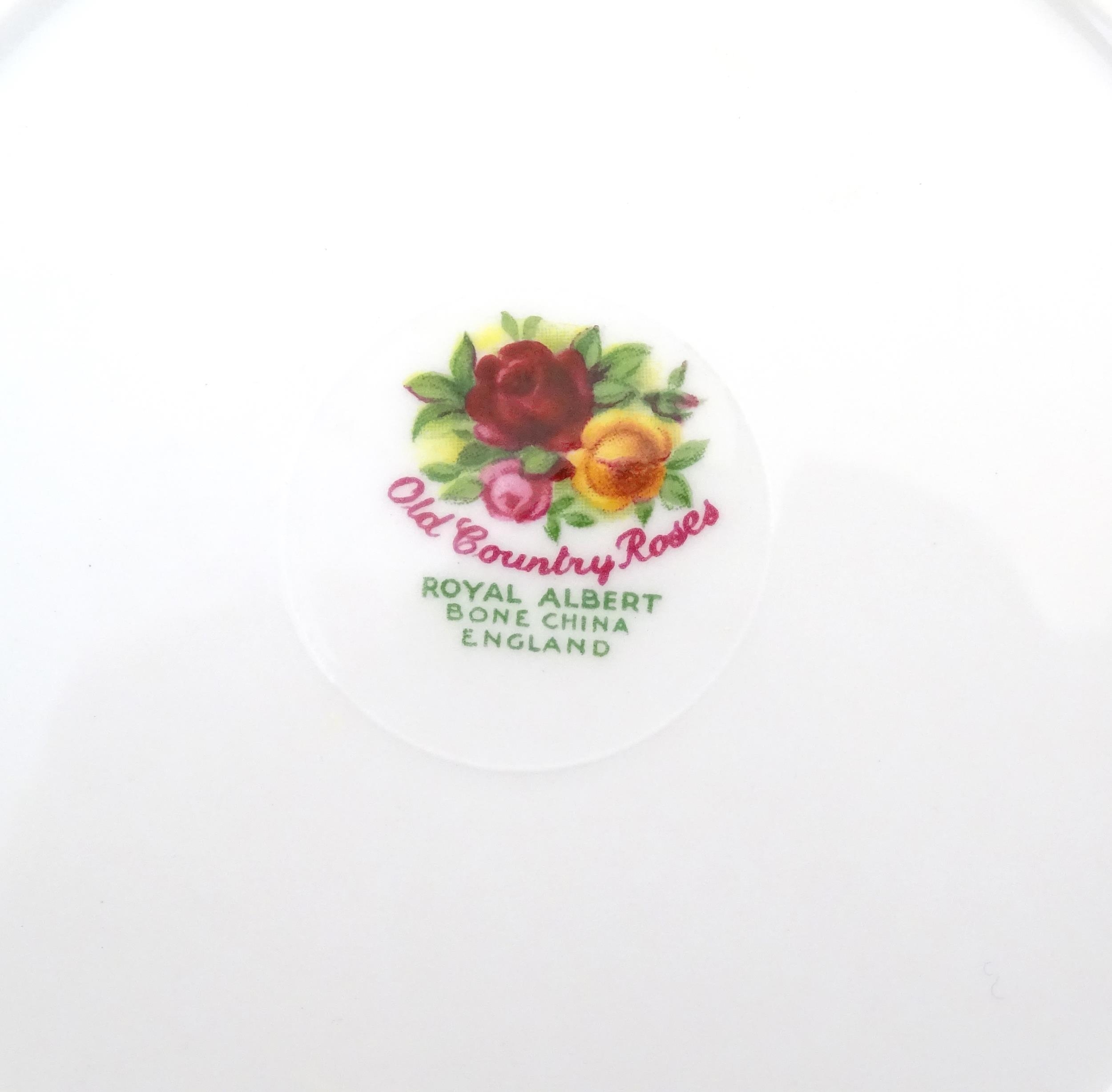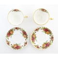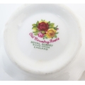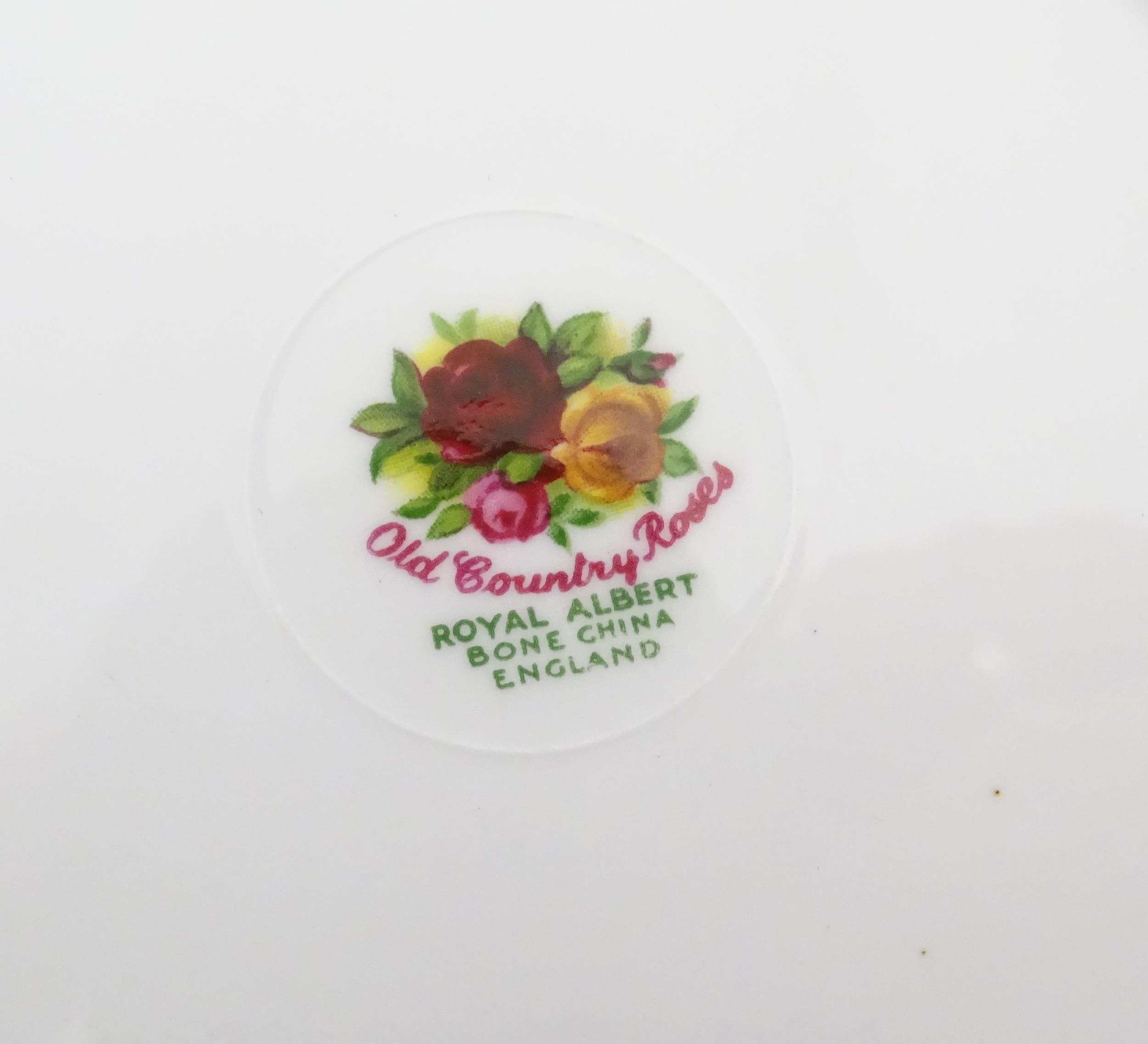 A quantity of Royal Albert tea wares in the Old Country Roses pattern, to include cake plate, tea cups and saucers, plates, pepperettes, three tier cake stand, etc. Marked under. Cake plate approx. 10 1/2" wide (Approx. 20 pieces)