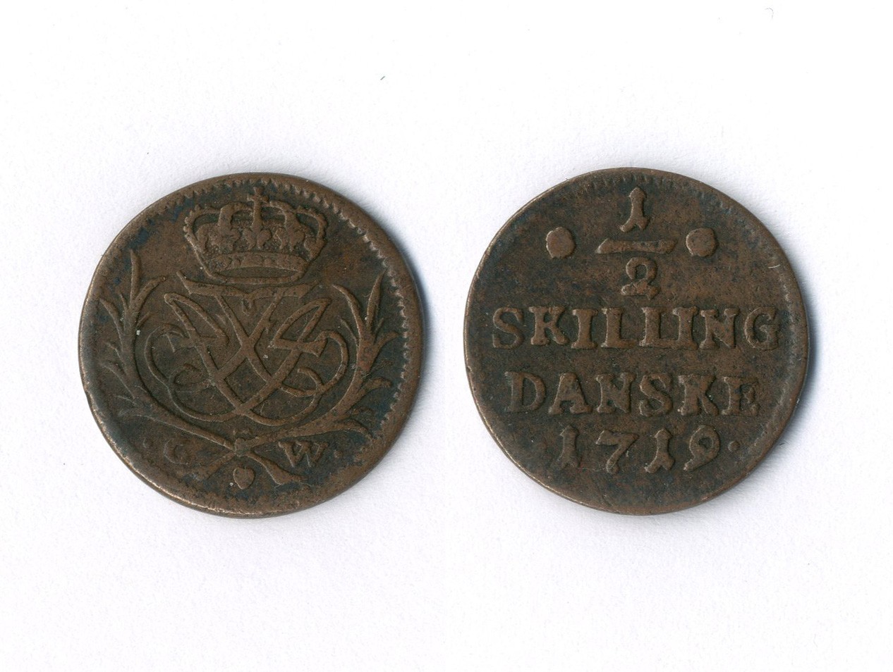 Denmark, Frederik IV, ½ skilling, 1719 (KM 512.10, near VF for issue and scarce