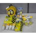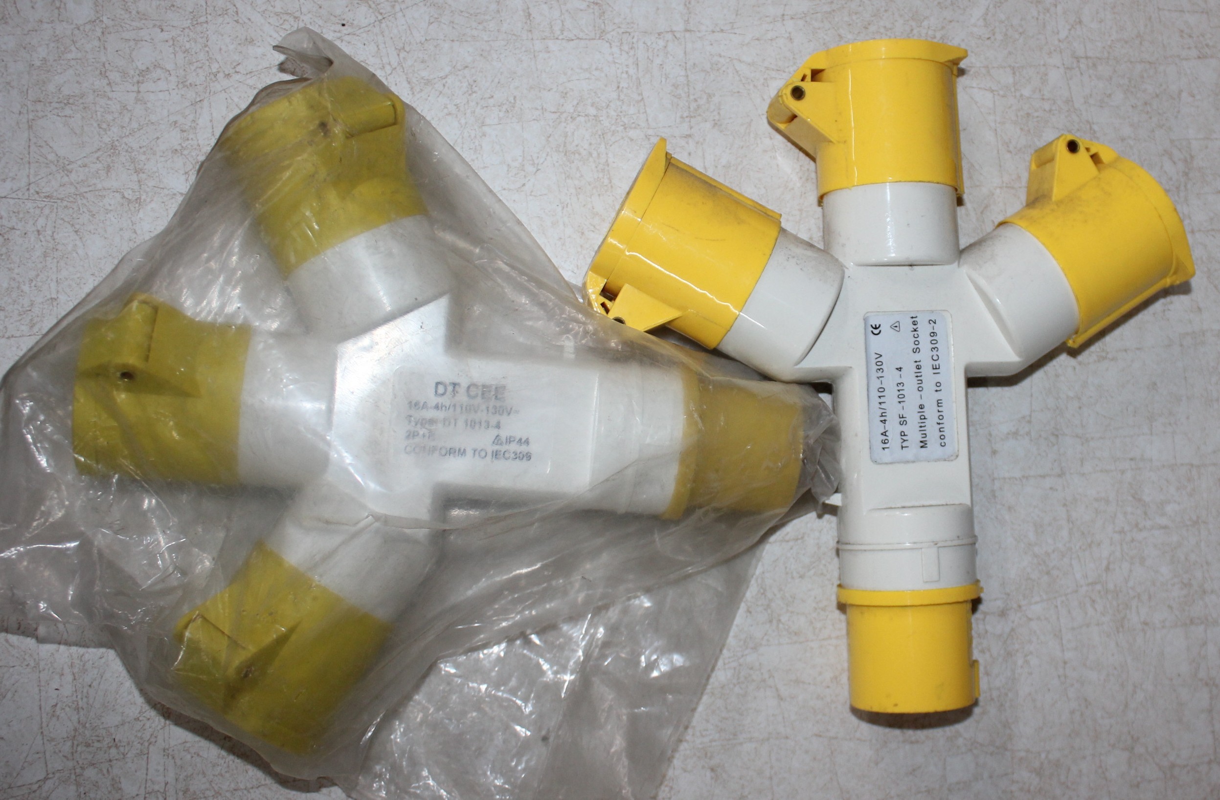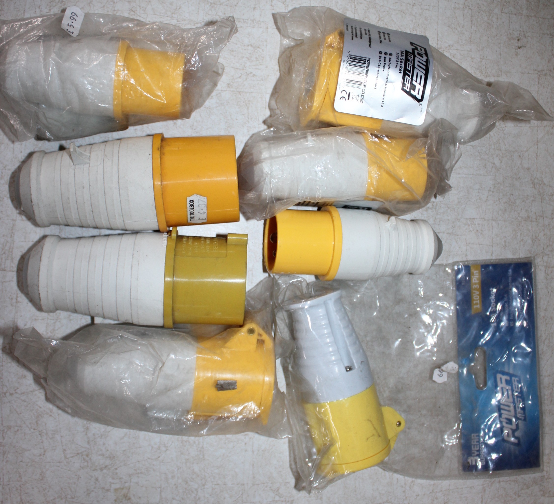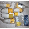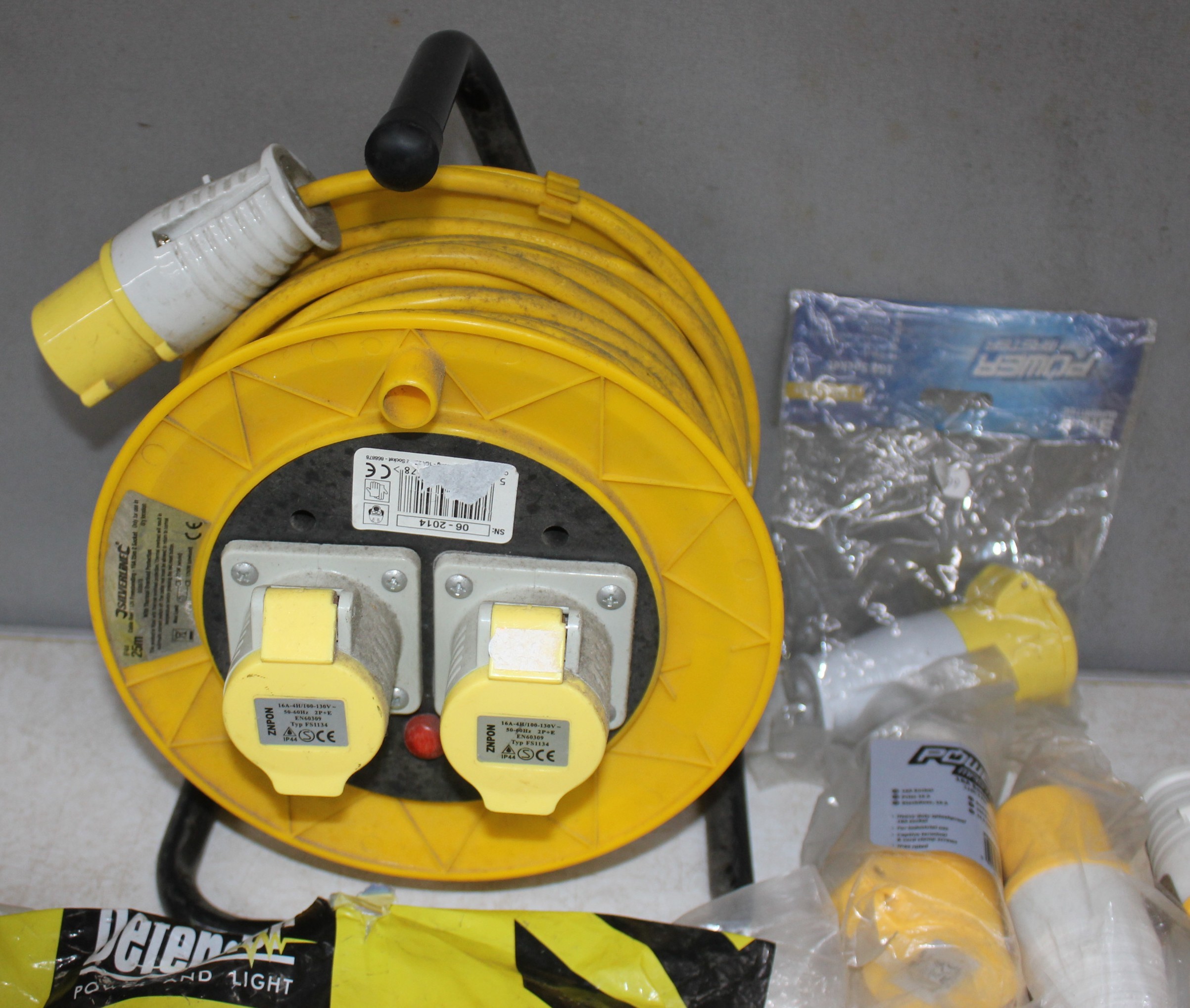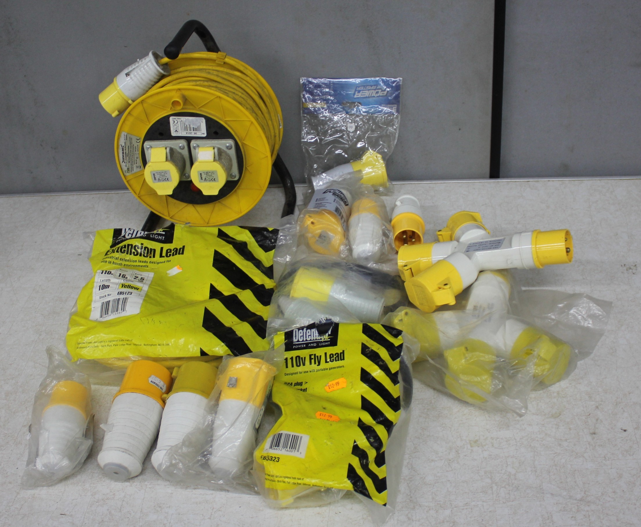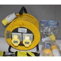 BOX OF 100v ELECTRICAL EQUIPMENT - EXTENSION REEL AND CABLE, 10M CABLE, 2 x MULTIPLE OUTLET SOCKET, 2 x FLY LEAD AND 8 SOCKETS