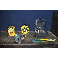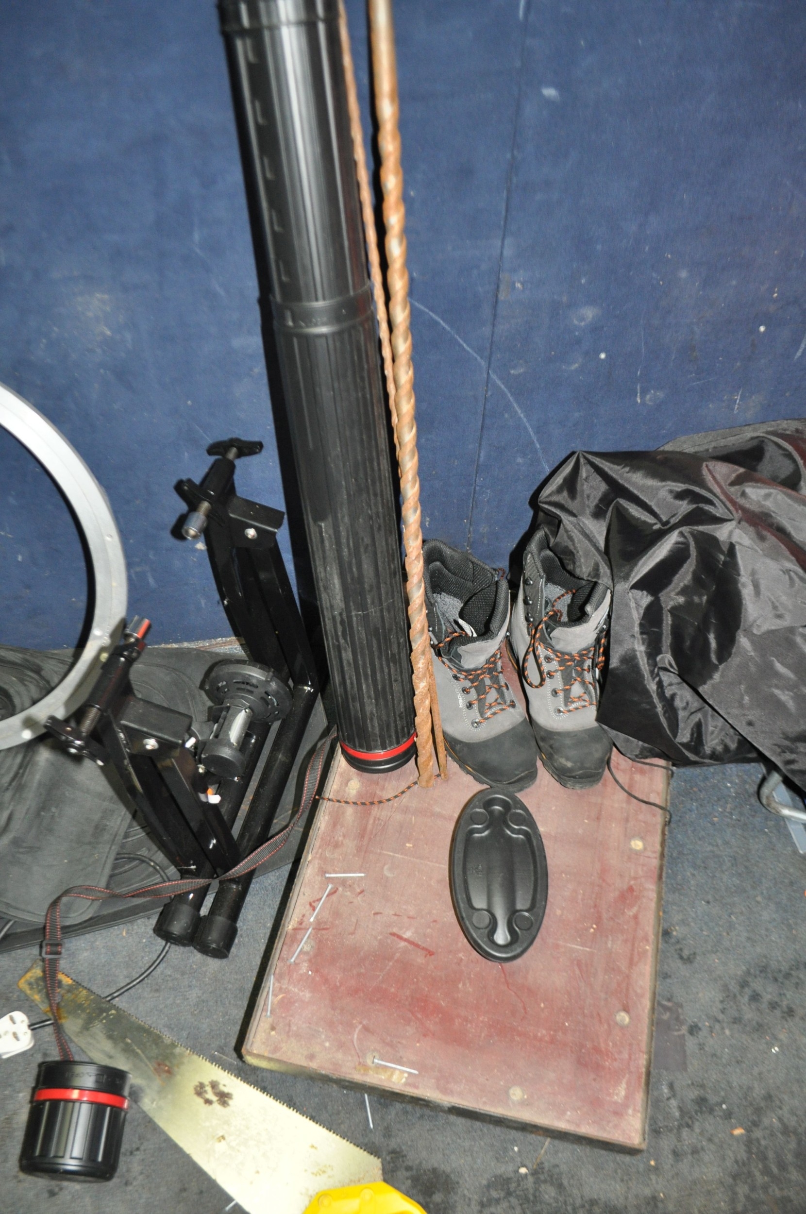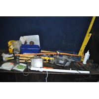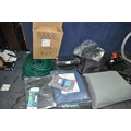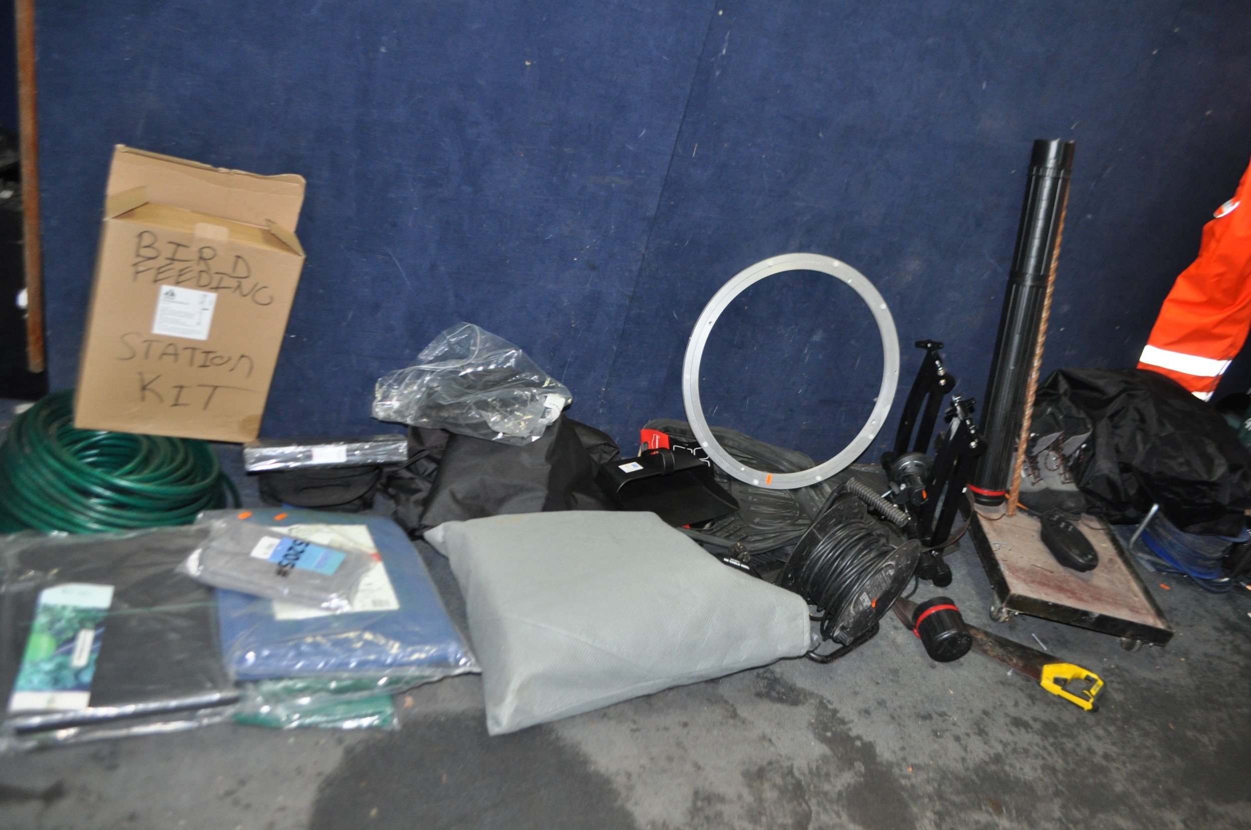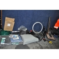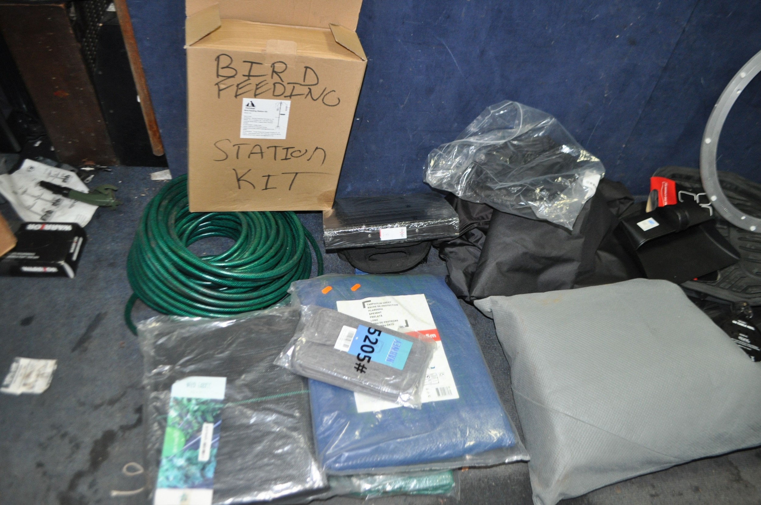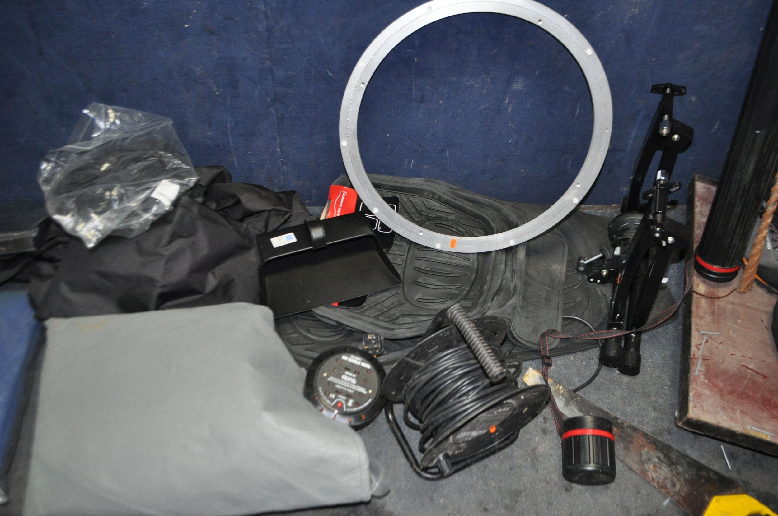 A COLLECTION OF TOOLS AND ACCESSORIES including a Cycle trainer, a trolley, a sedan car cover, seat covers for a BMW 4X4 and a Ford Ranger pickup, car mats, tarpaulin, weed fabric etc