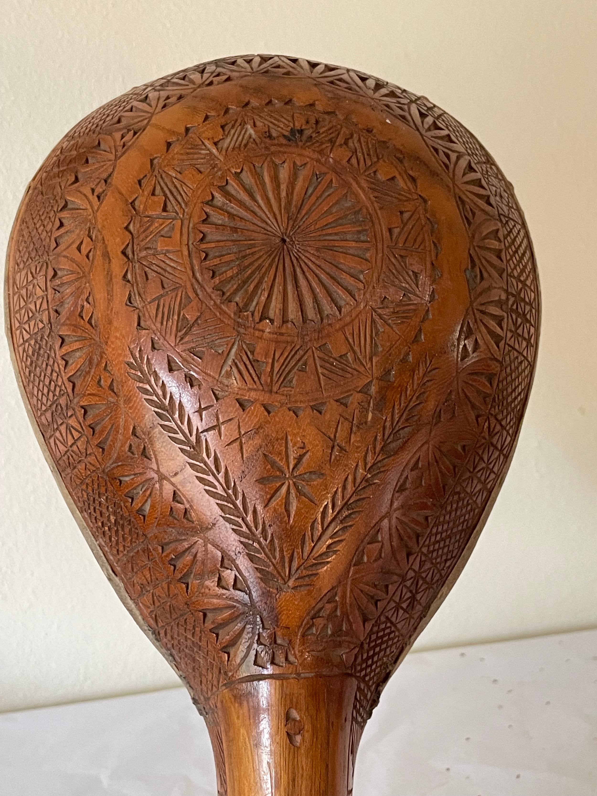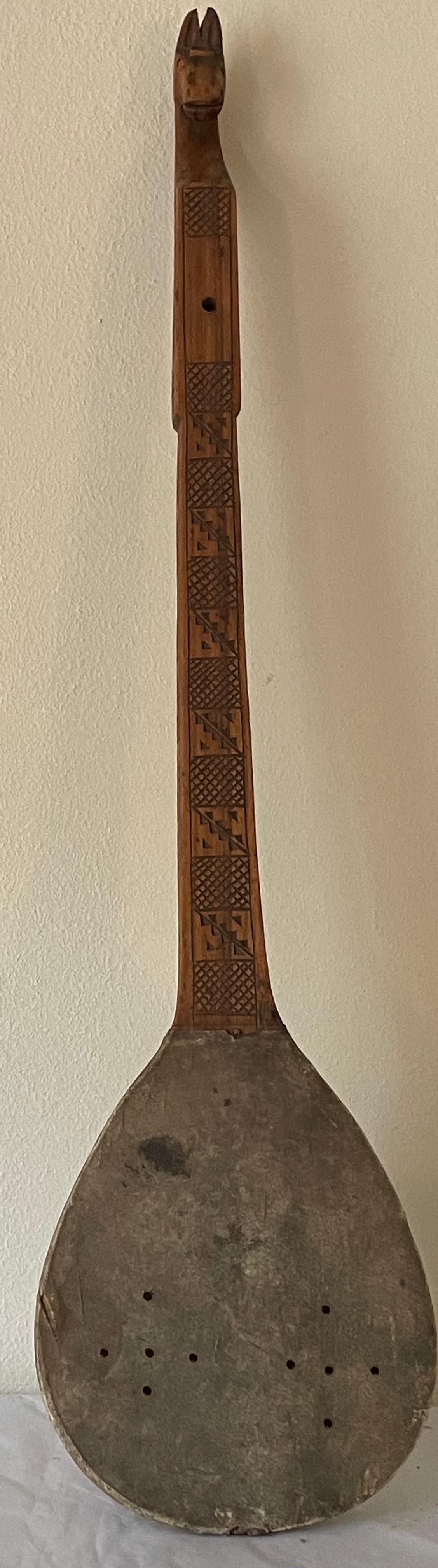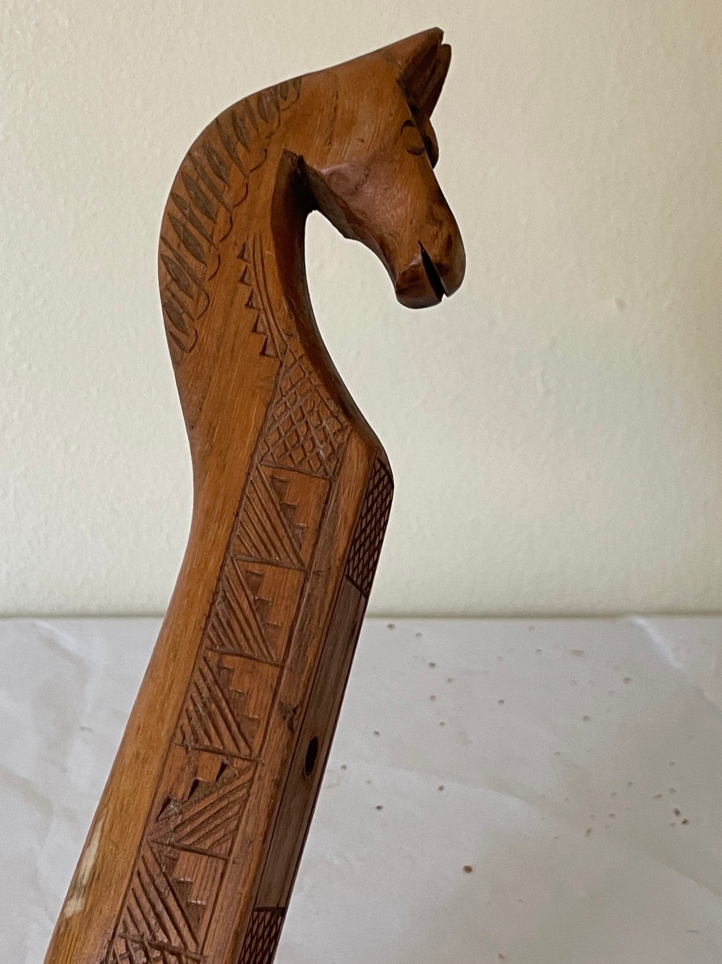 Carved Wood Musical Instrument With Horse Head Finial. 65 cms