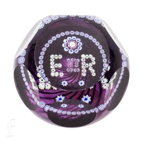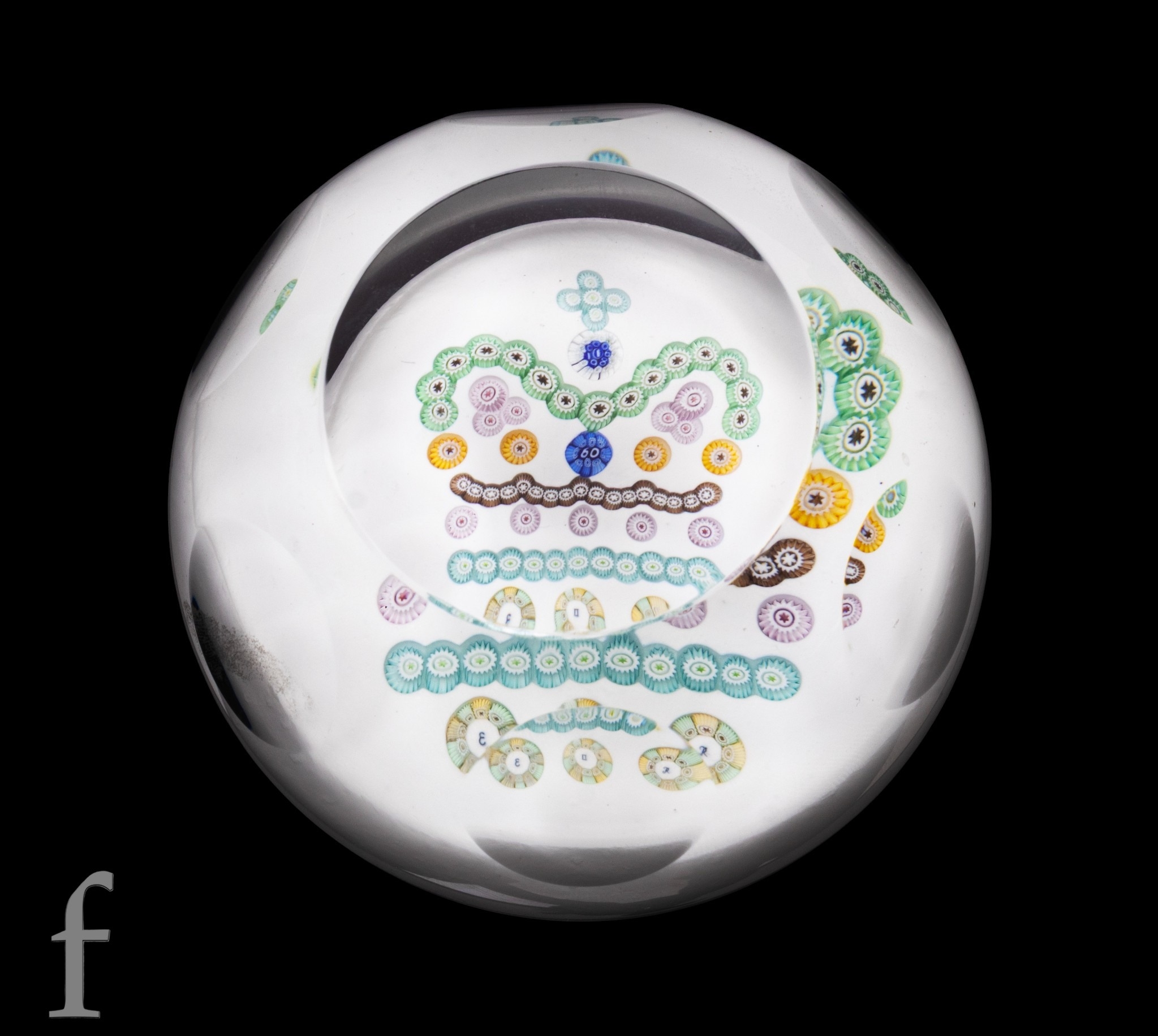 A later 20th Century Caithness Whitefriars glass paperweight, in the 'Vivat Regina' pattern, internally decorated with multicoloured millefiori canes to form a crown motif all over an opaque white ground, commemorating the 60th Birthday of H.M. Queen Elizabeth II, cased in clear crystal with facet cut top and sides, signature monk cane, acid marks, numbered 165/250, retains certificate of authenticity, diameter 7cm.
