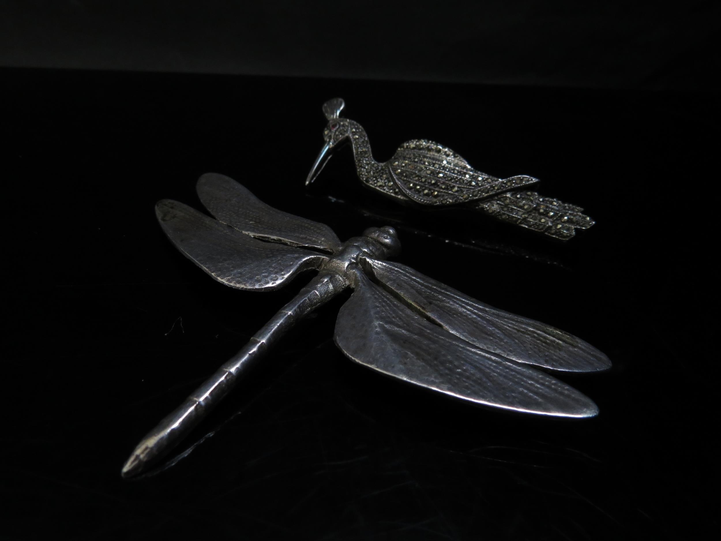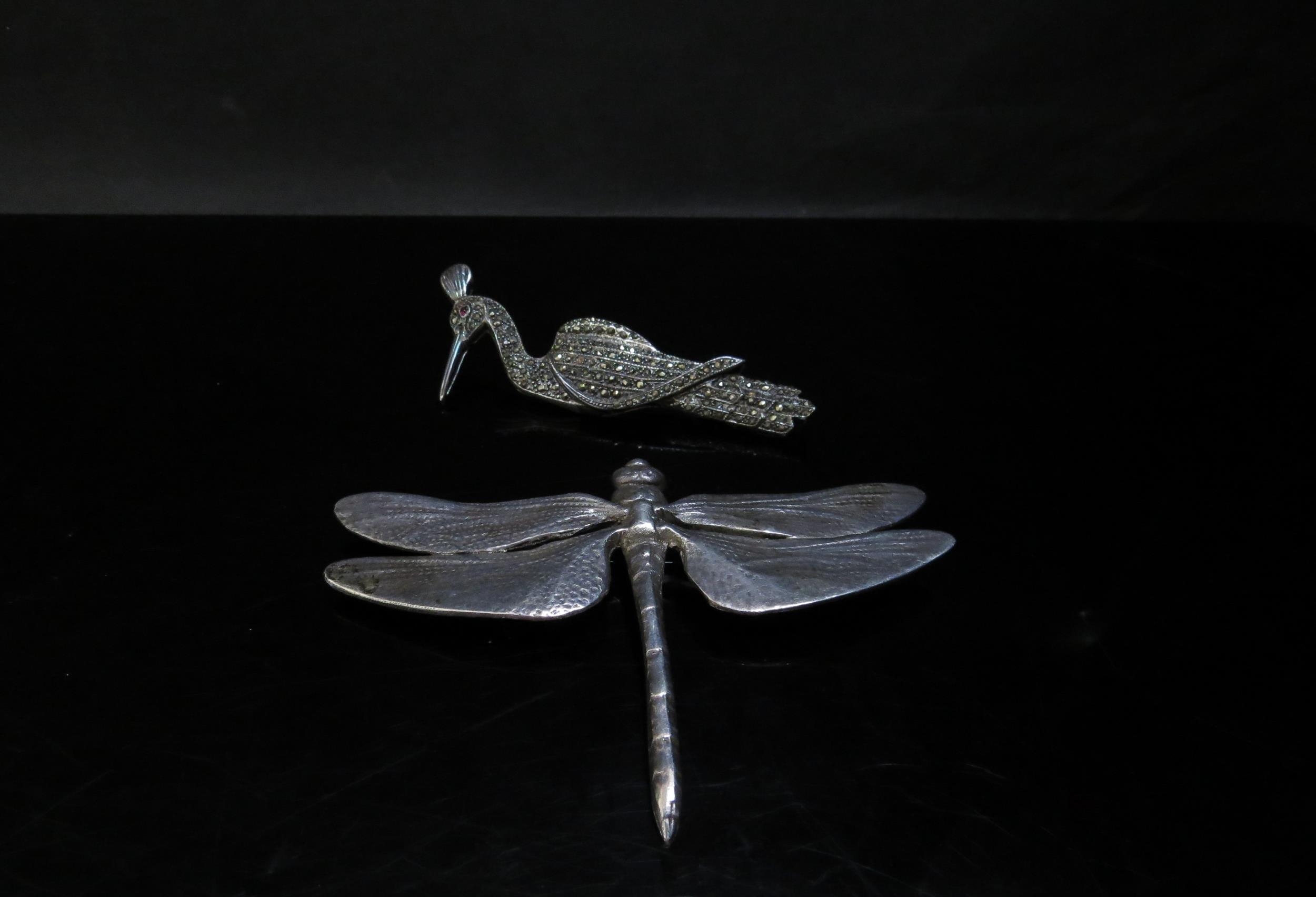A dragonfly brooch, 6cm x 9.5cm stamped silver and 925 marcasite peacock brooch 7.5cm (2)