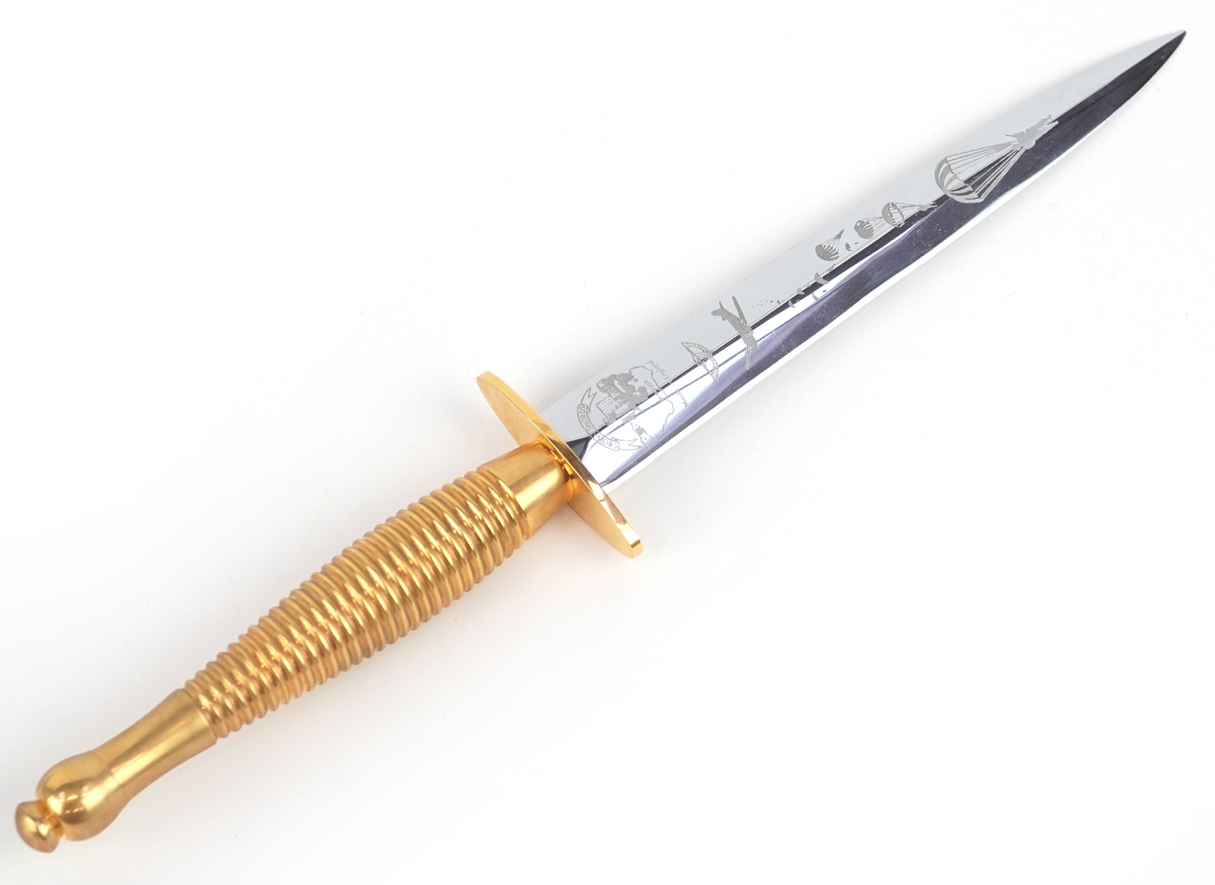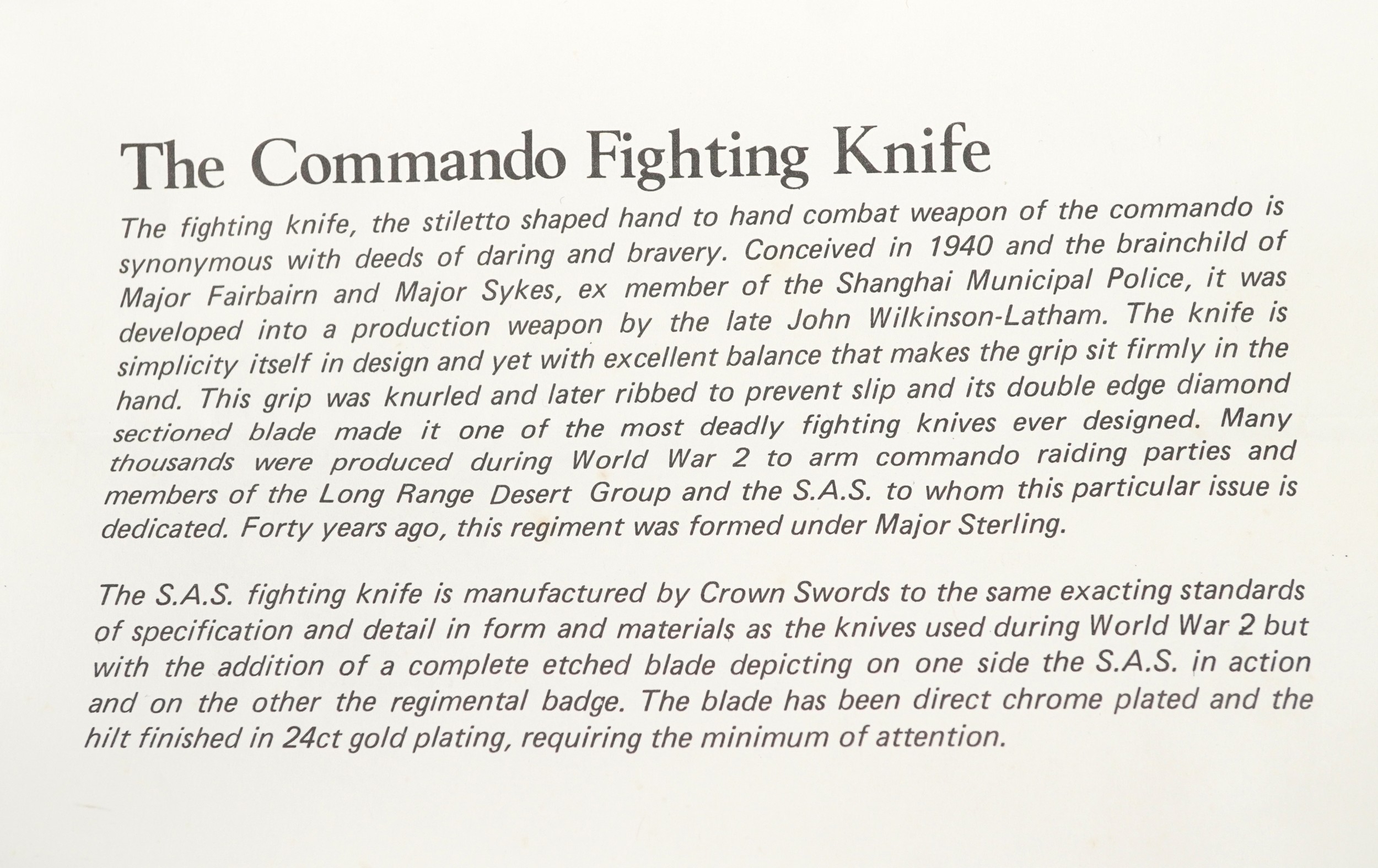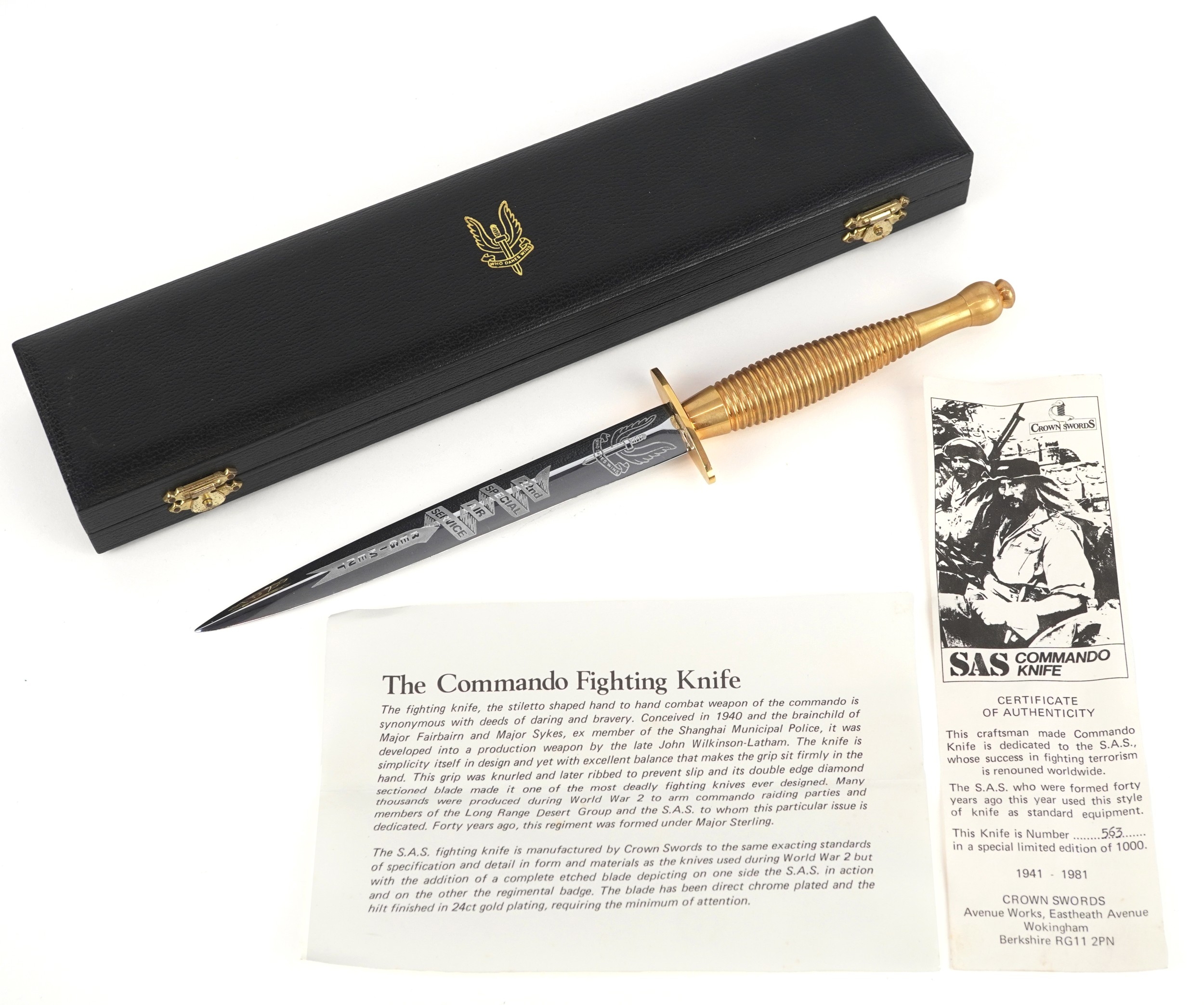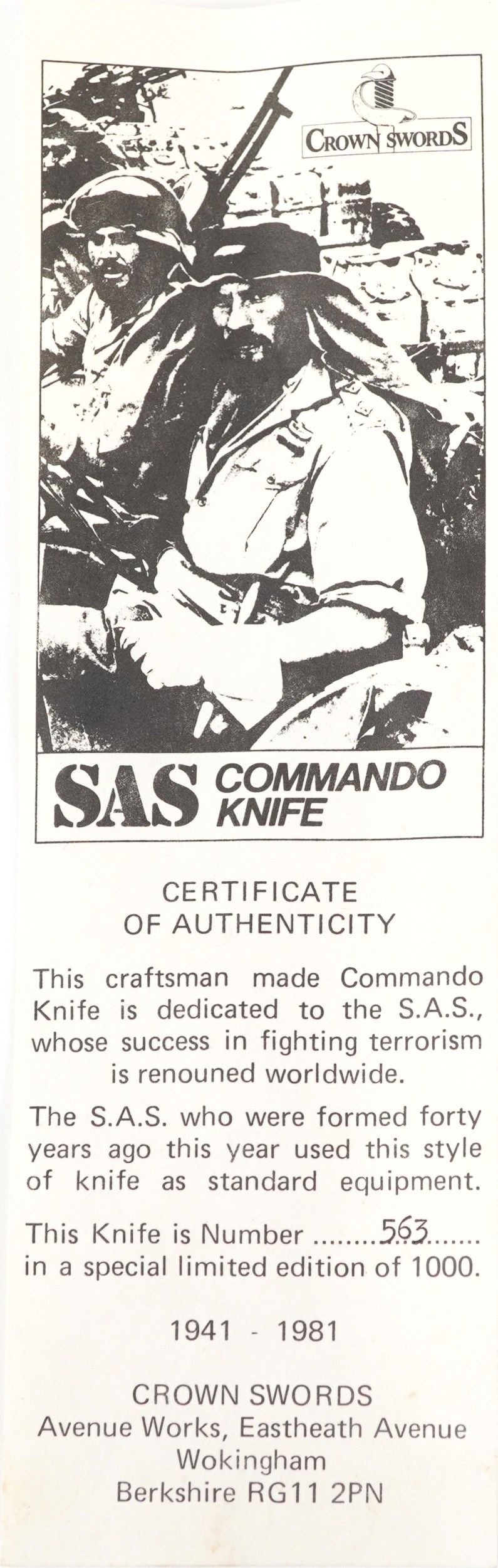 A limited edition SAS Commando knife by Crown Swords with certificate of authenticity numbered 563/1000, housed in a presentation case, 30cm in length.