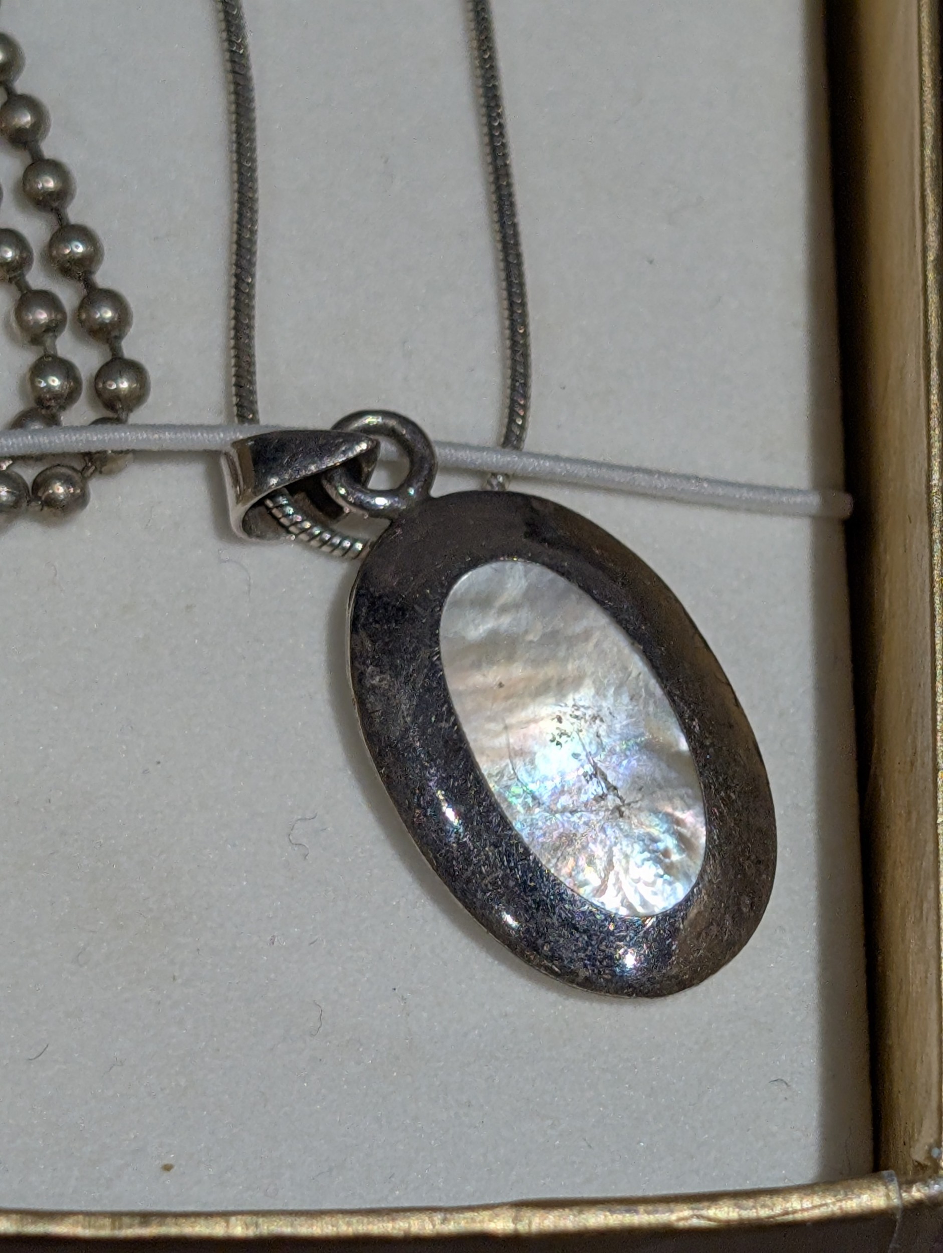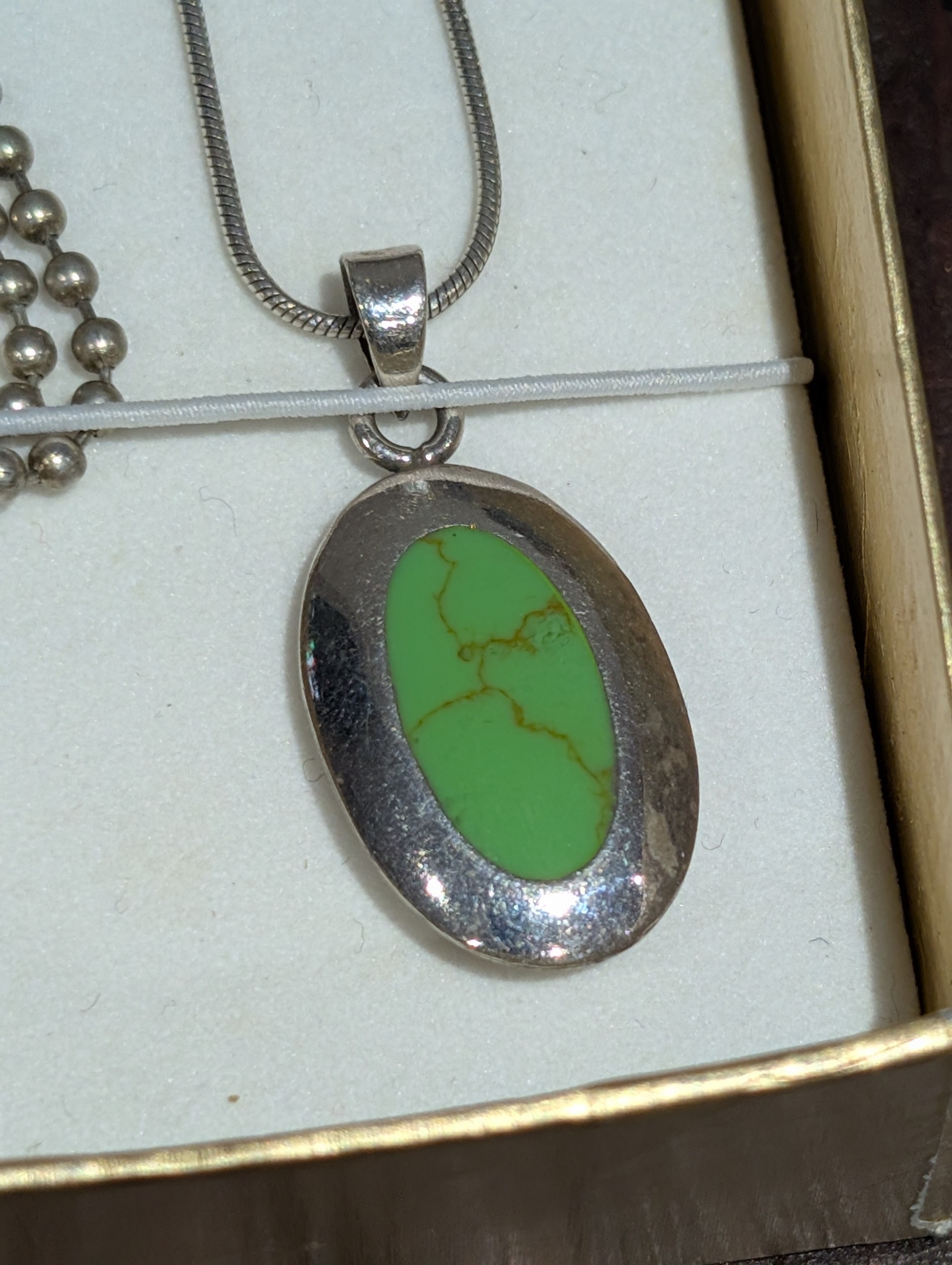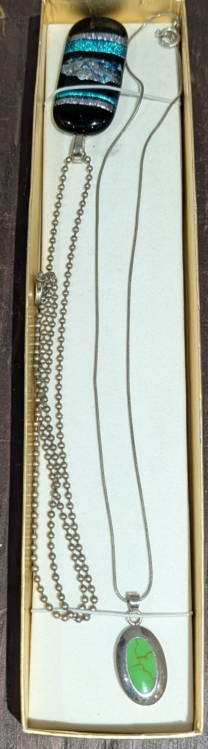 A Les Baker Style Indian Native Reversible Sterling Silver Pendant Necklace, and a Fused Glass Pendant Necklace