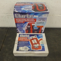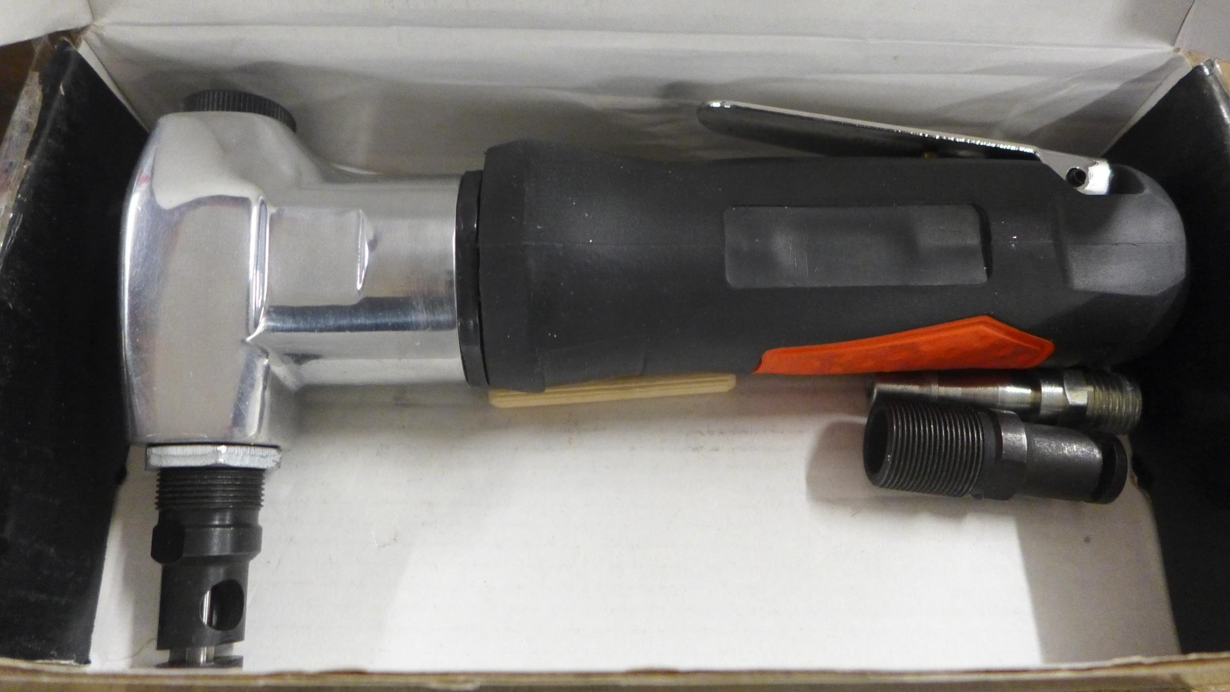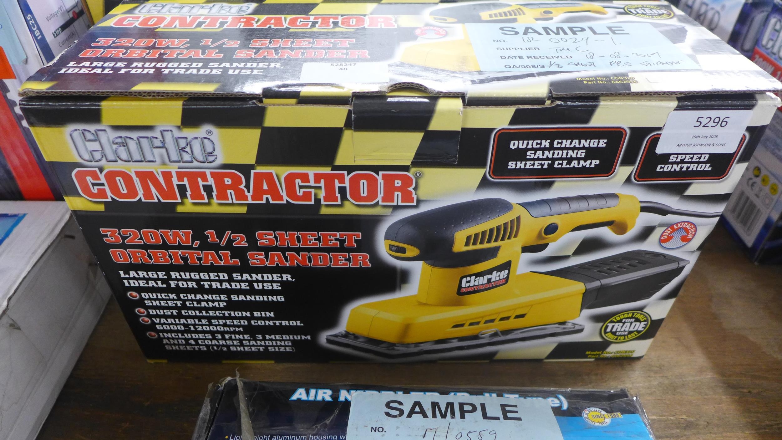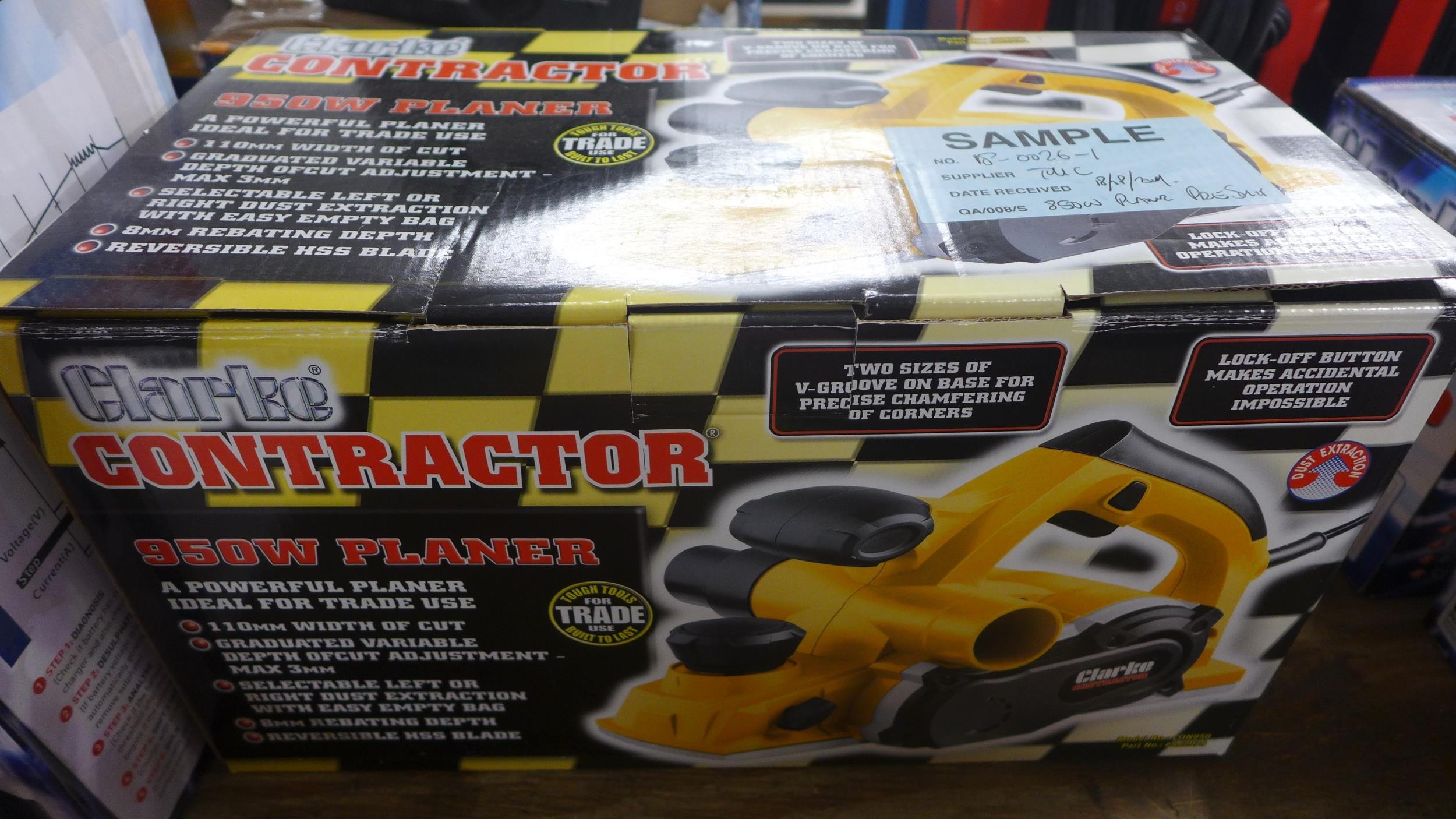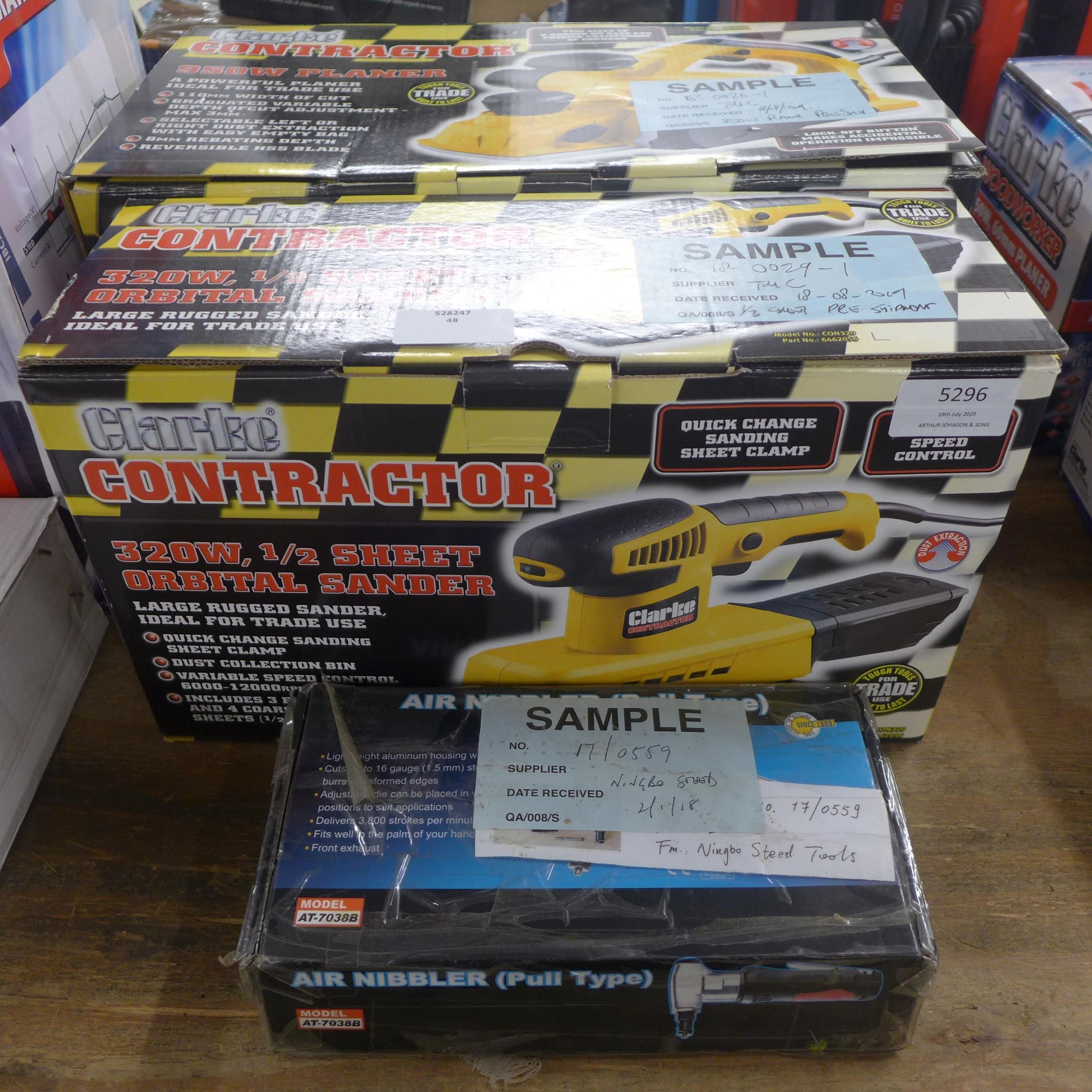A boxed Clarke Contractor 950w planer, a Clarke Contractor 320w 1/2 sheet orbital sander and an air nibbler *This lot is subject to VAT