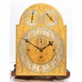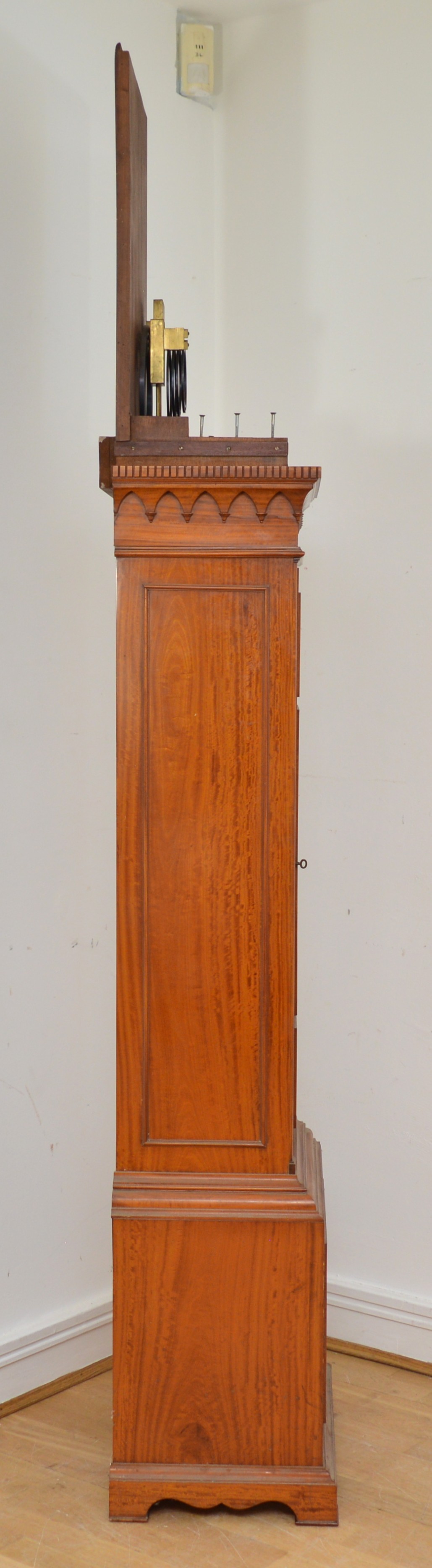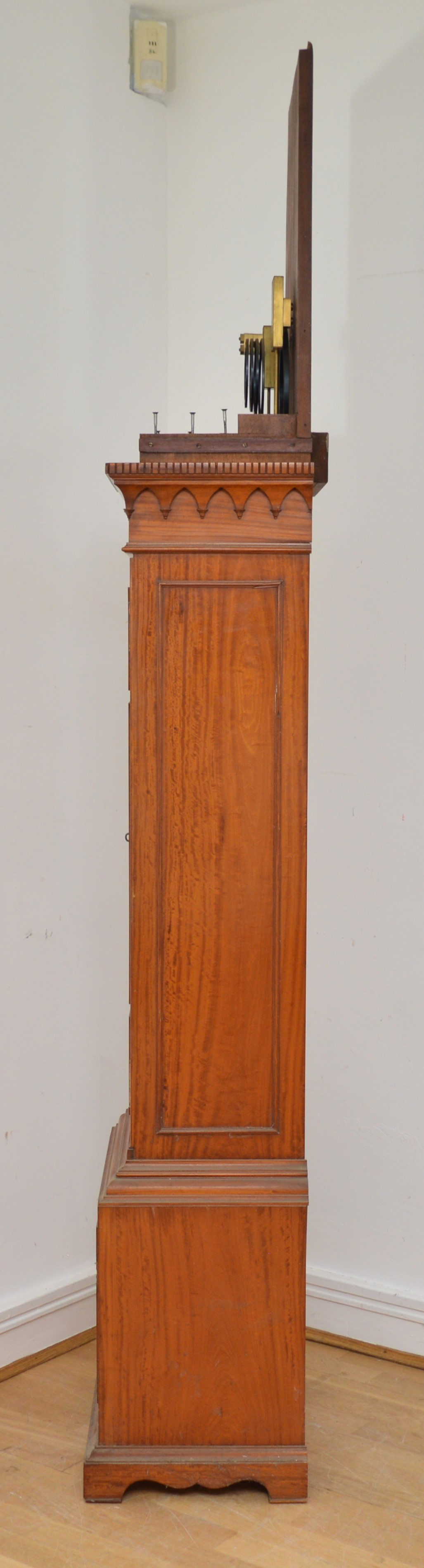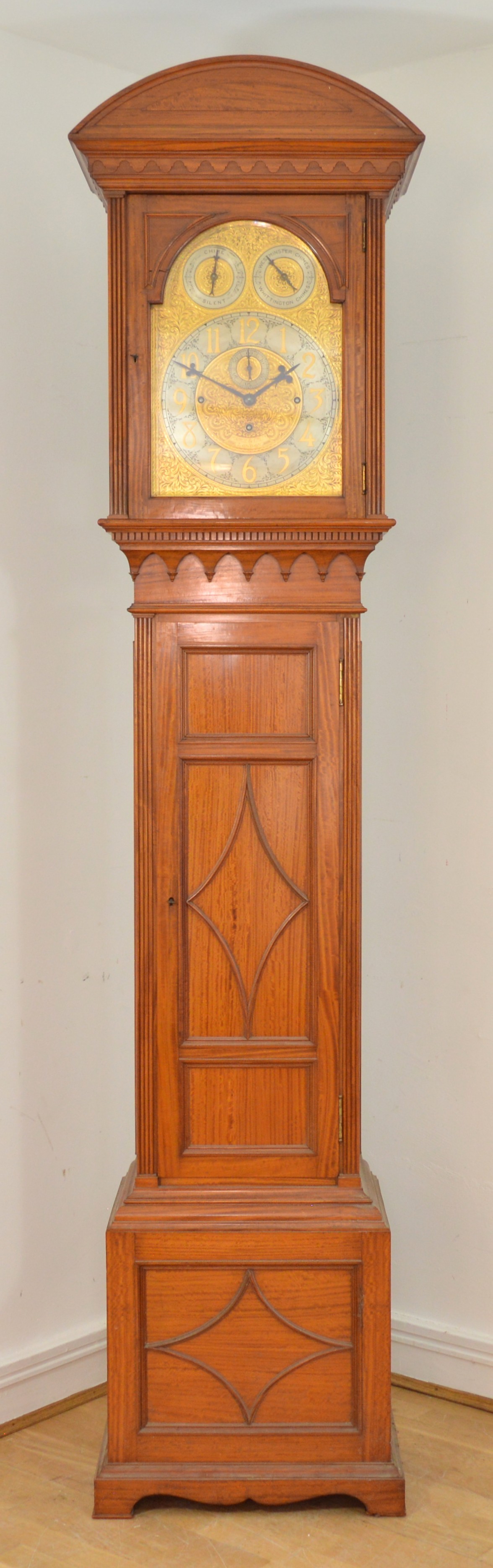 Maples & Co., London, a fine late 19th century satinwood three train musical longcase clock, the 12" chased gilt brass arched dial with applied silvered chapter ring, gilt Aesthetic Movement numerals, subsidiary seconds dial, chime/silent and Westminster/Whittington chime dials. The high quality movement with eight bells and musical drum, four gongs and separate hour gong, the arched hood with bevelled glass and reeded columns, the trunk with reeded columns and applied mouldings, key, pendulum and three different weights, 232cm.