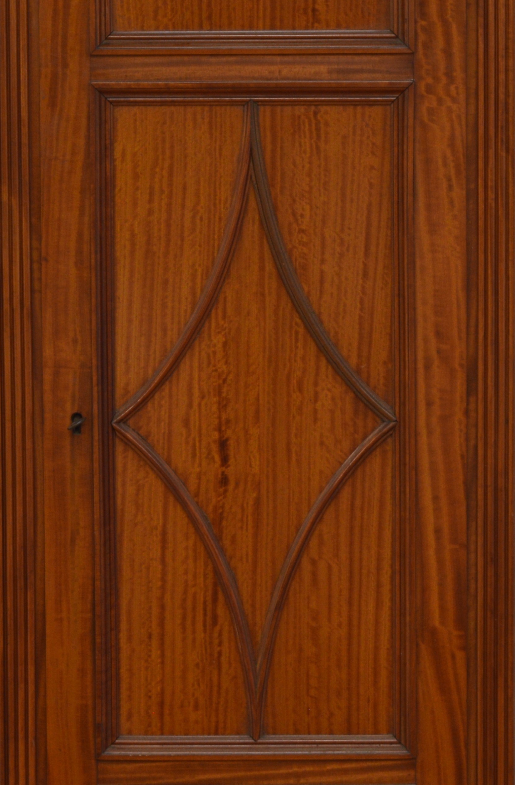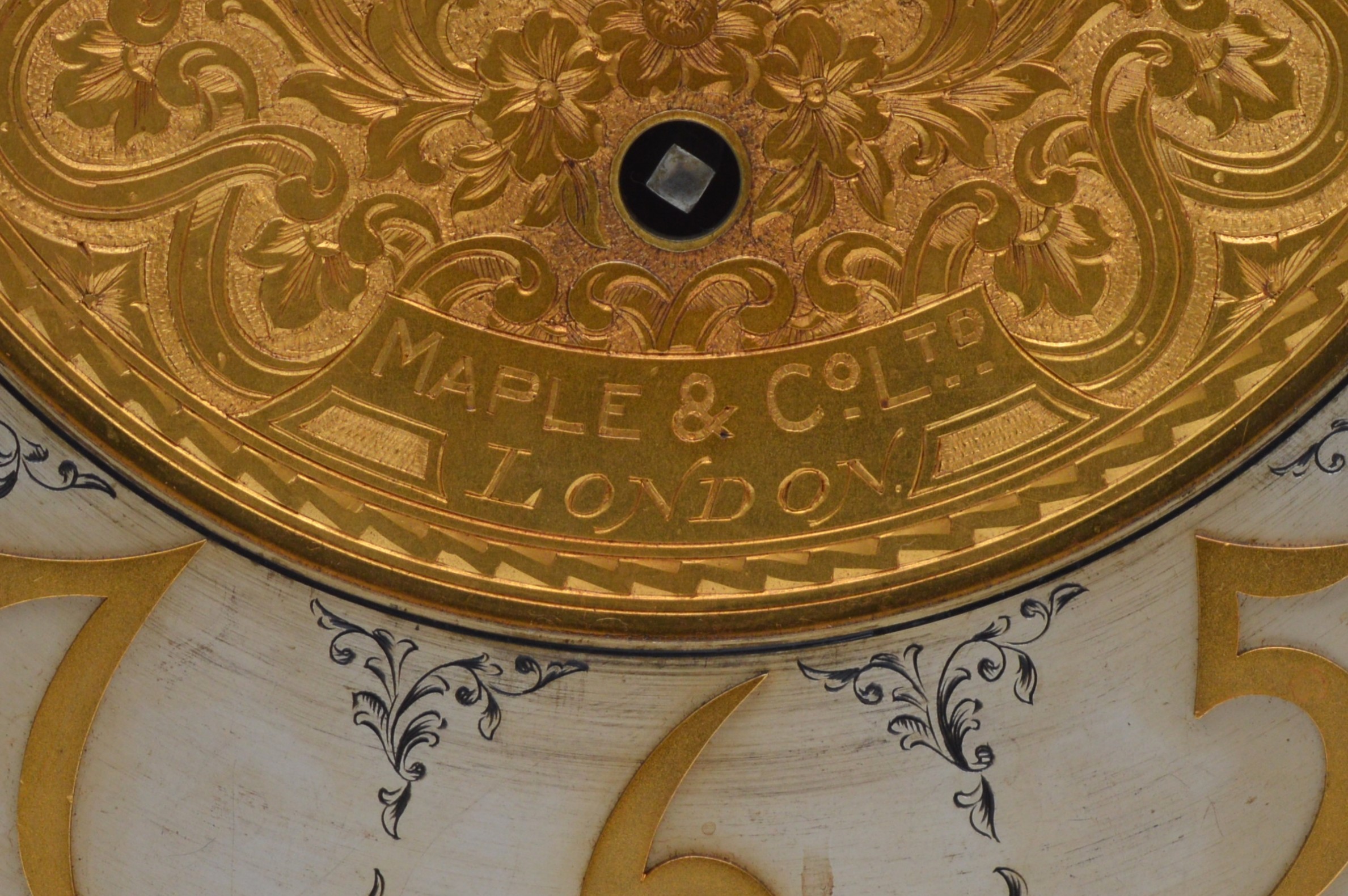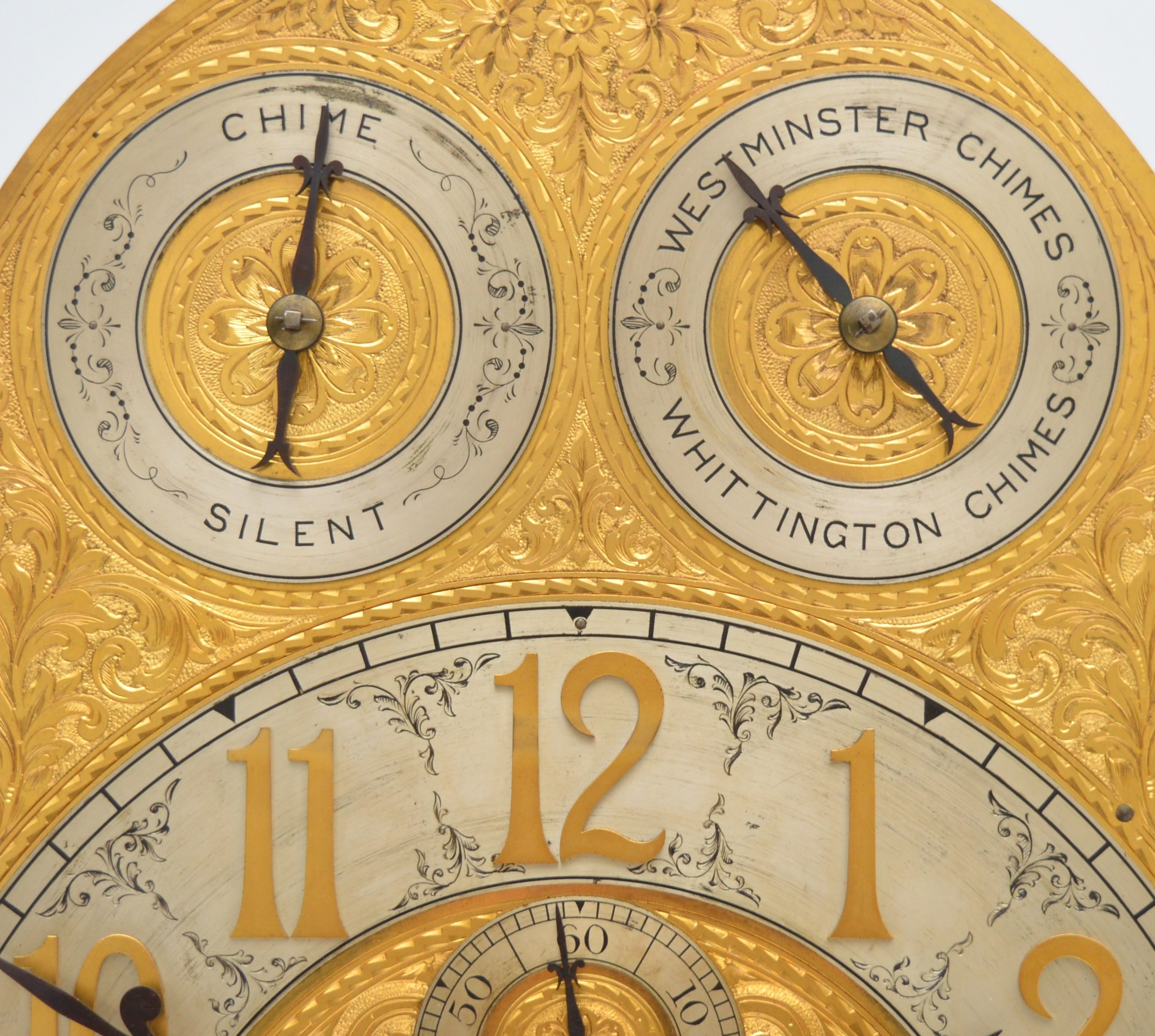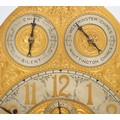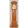 Maples & Co., London, a fine late 19th century satinwood three train musical longcase clock, the 12" chased gilt brass arched dial with applied silvered chapter ring, gilt Aesthetic Movement numerals, subsidiary seconds dial, chime/silent and Westminster/Whittington chime dials. The high quality movement with eight bells and musical drum, four gongs and separate hour gong, the arched hood with bevelled glass and reeded columns, the trunk with reeded columns and applied mouldings, key, pendulum and three different weights, 232cm.