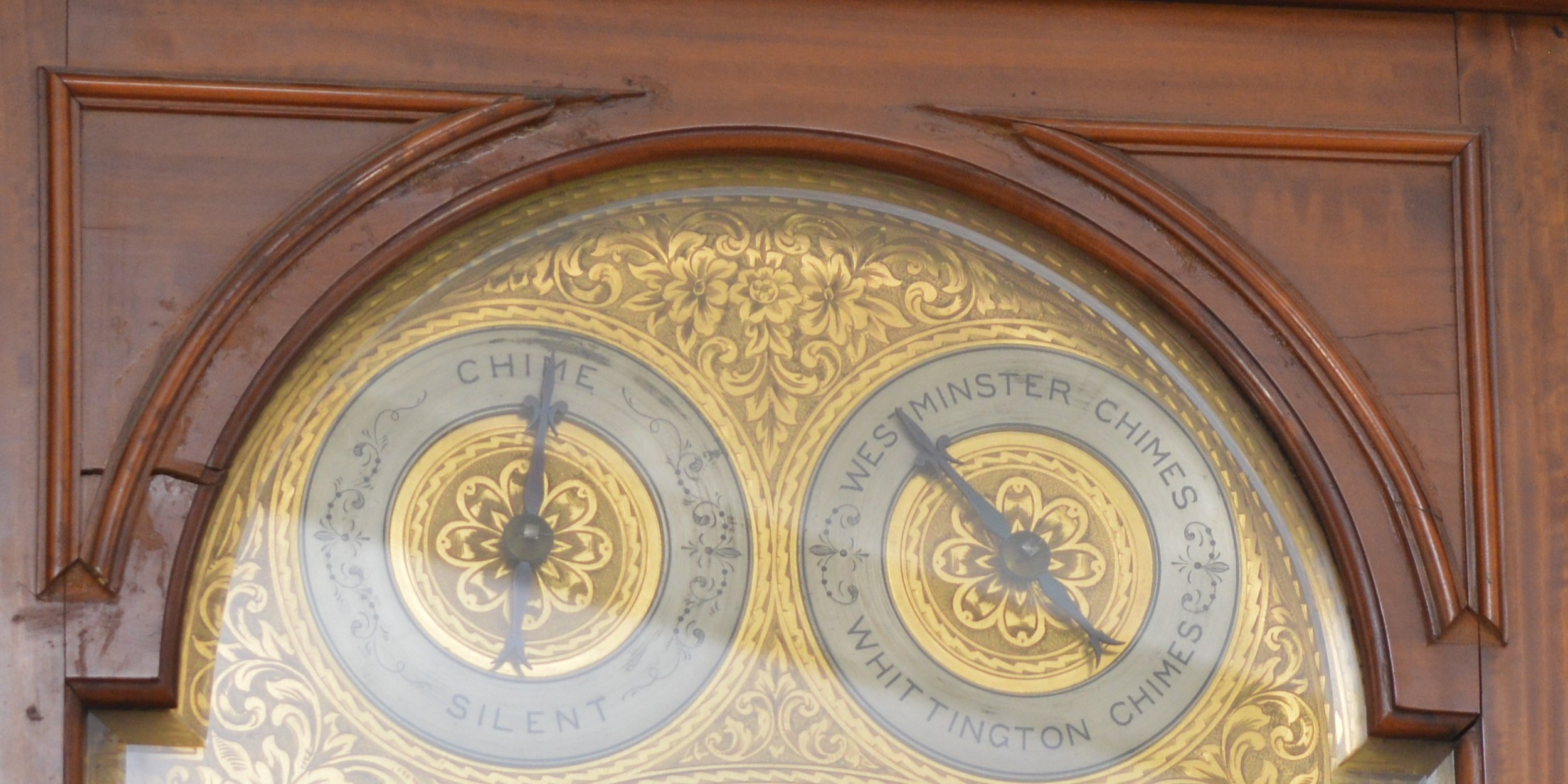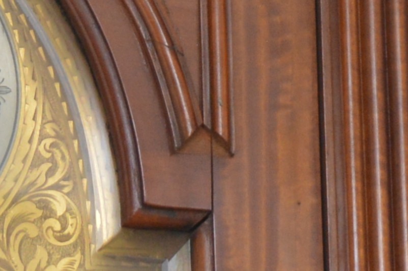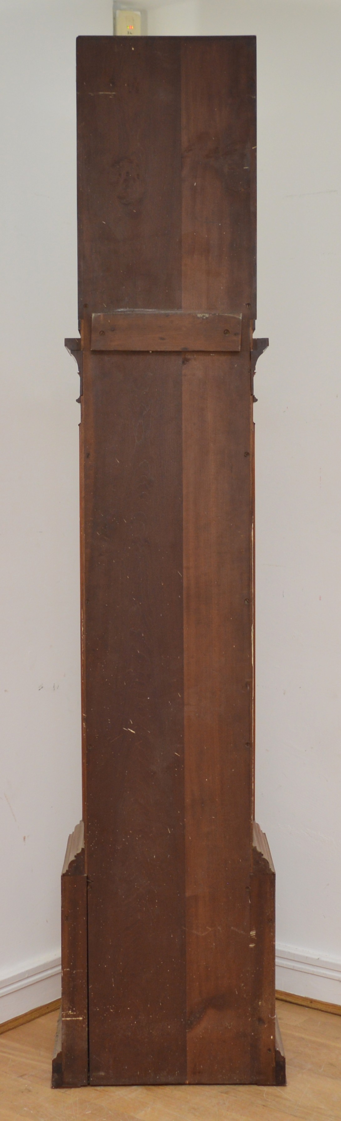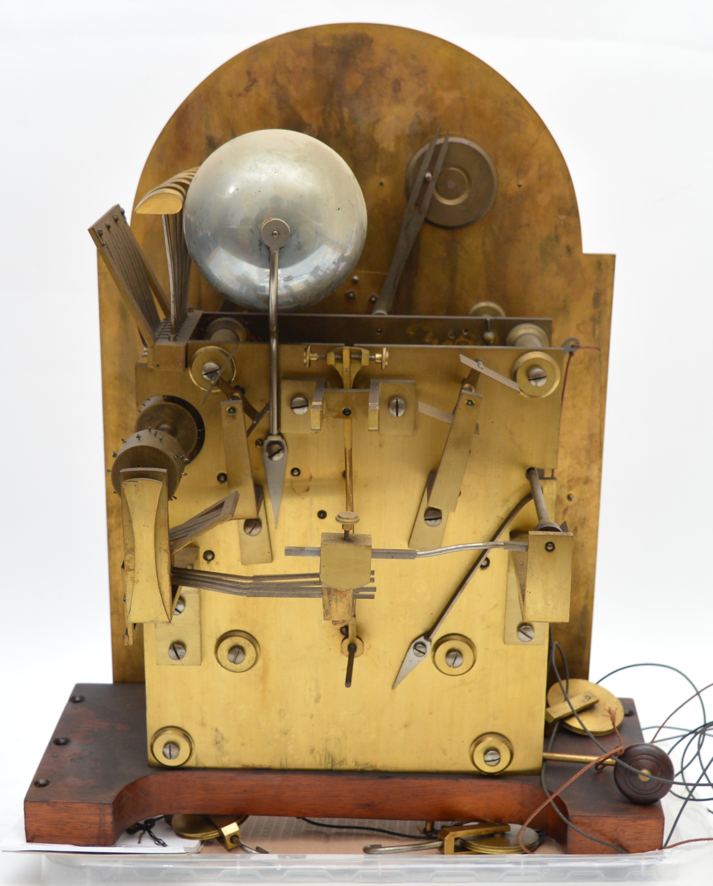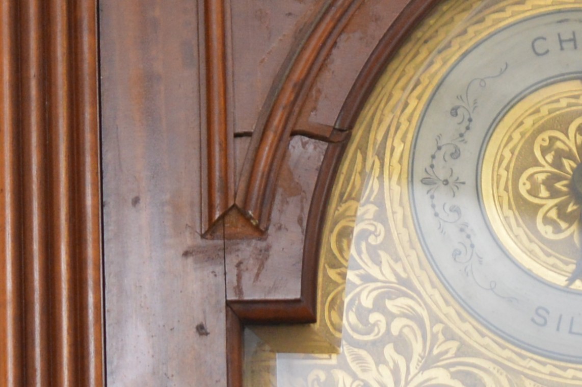 The movement is in working order, all functions work and sound true, it has not been serviced for many years and would benefit from cleaning, the dial is in very good condition, believed totally original finish, the hood has split on the arched top, see images, there is the odd small small moulding missing and crack, please check images. The clock had not run for many years and when we assembled it it started without any coaxing.