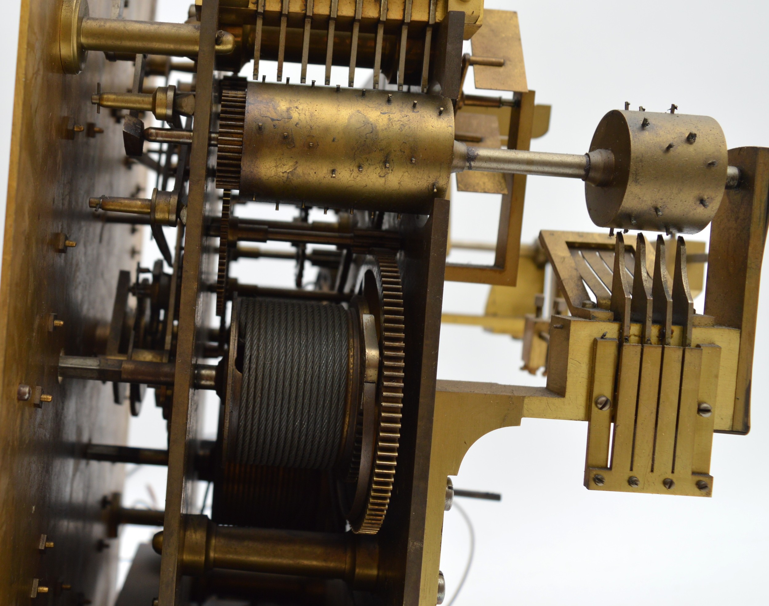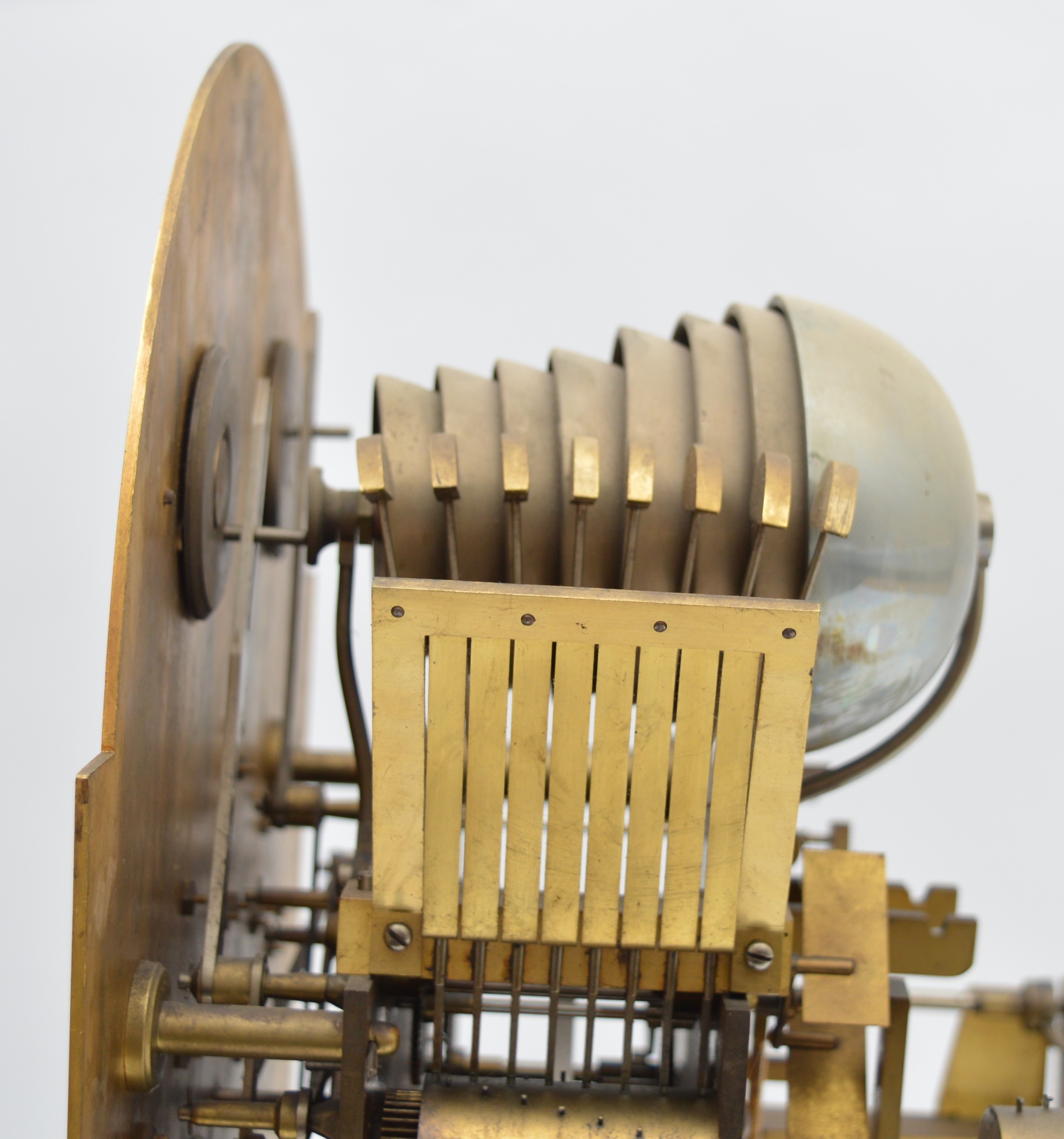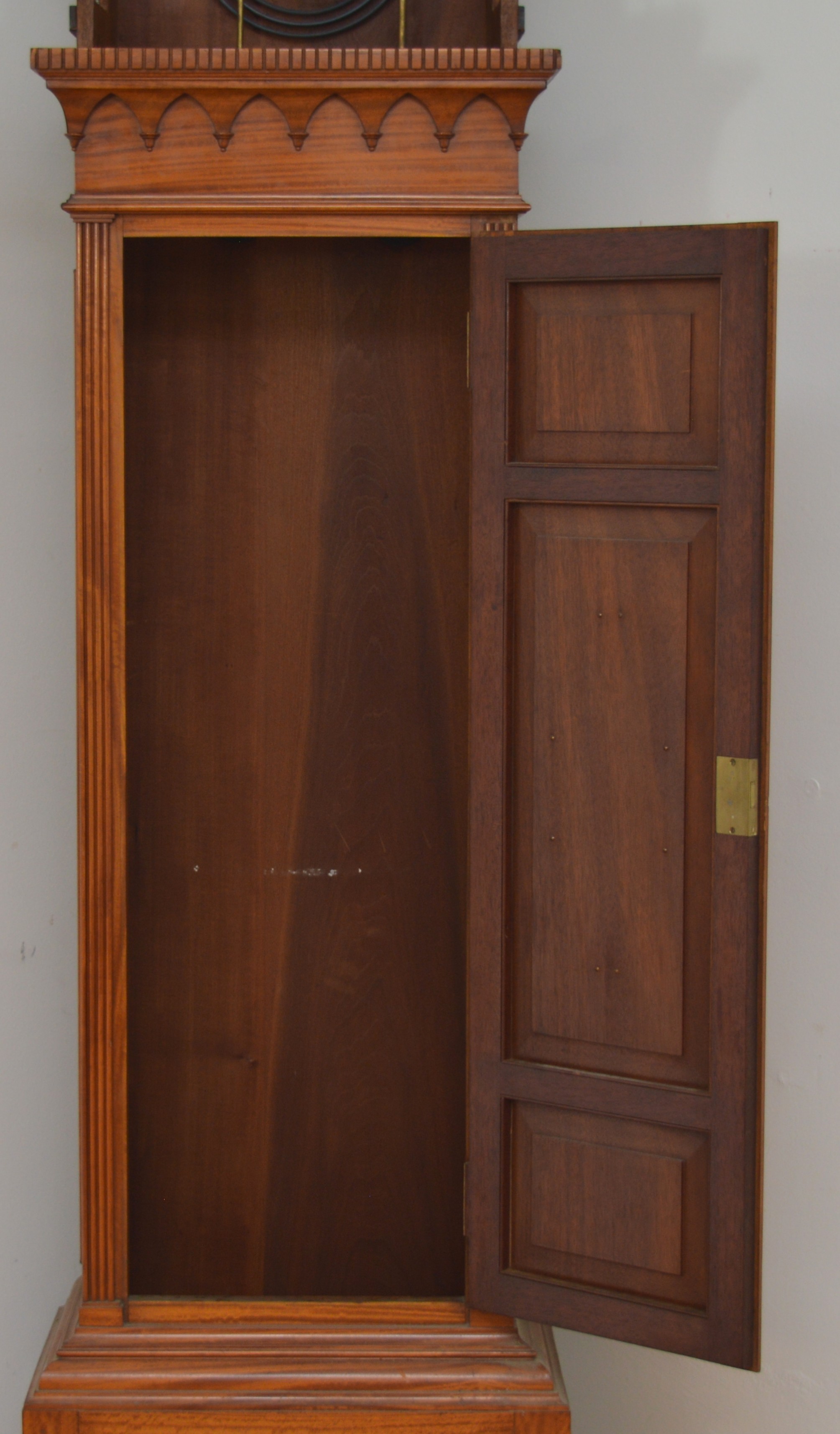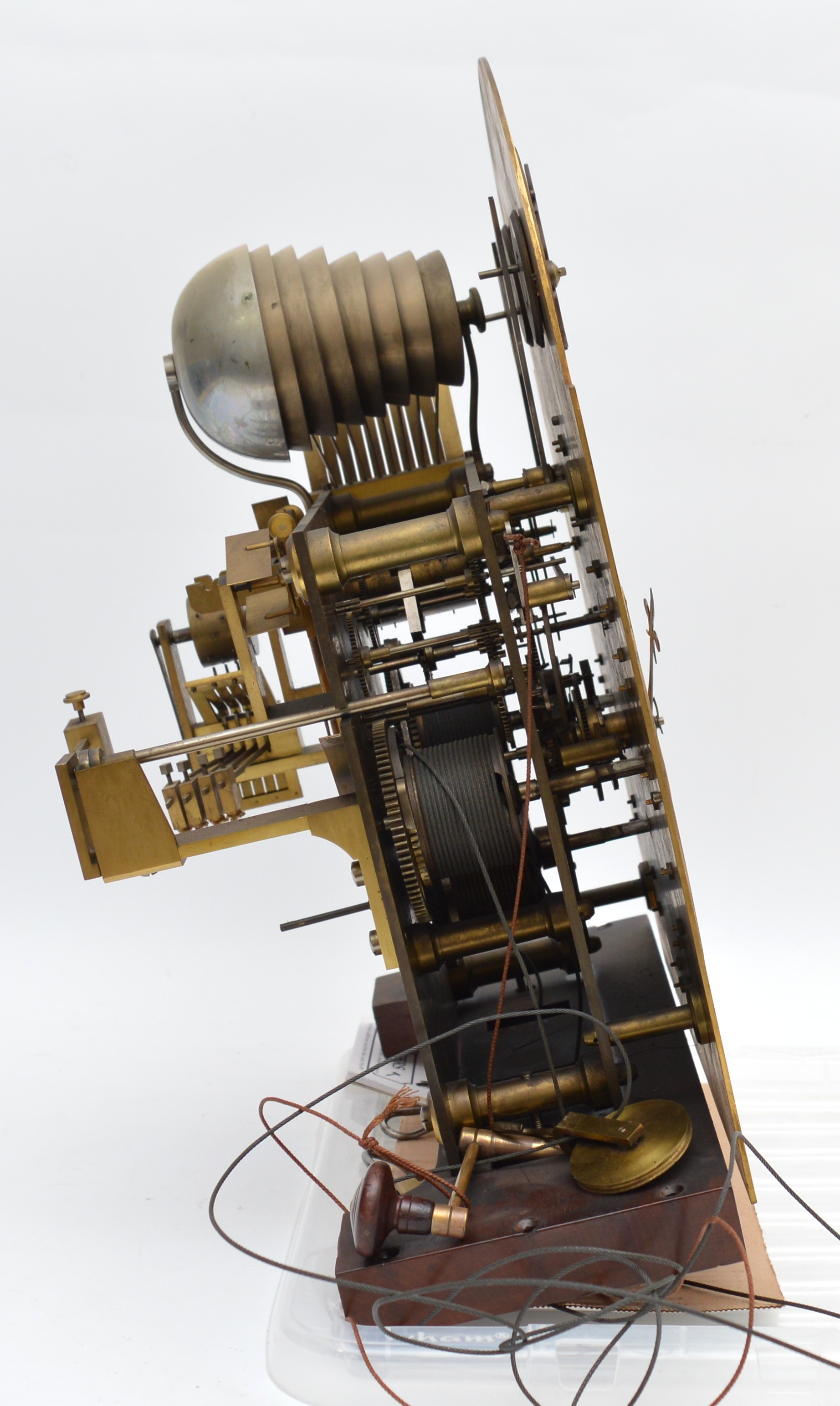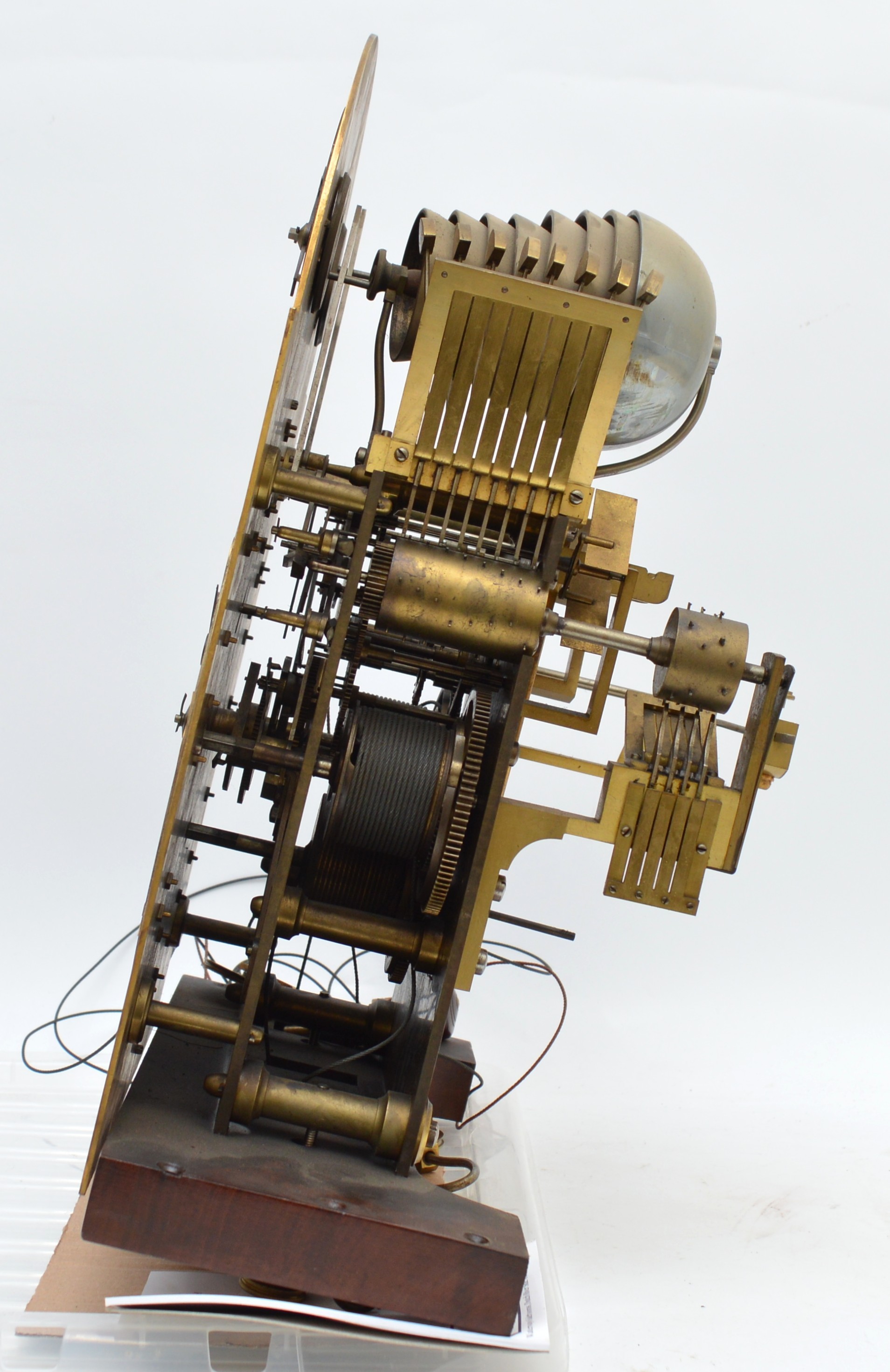 The movement is in working order, all functions work and sound true, it has not been serviced for many years and would benefit from cleaning, the dial is in very good condition, believed totally original finish, the hood has split on the arched top, see images, there is the odd small small moulding missing and crack, please check images. The clock had not run for many years and when we assembled it it started without any coaxing.