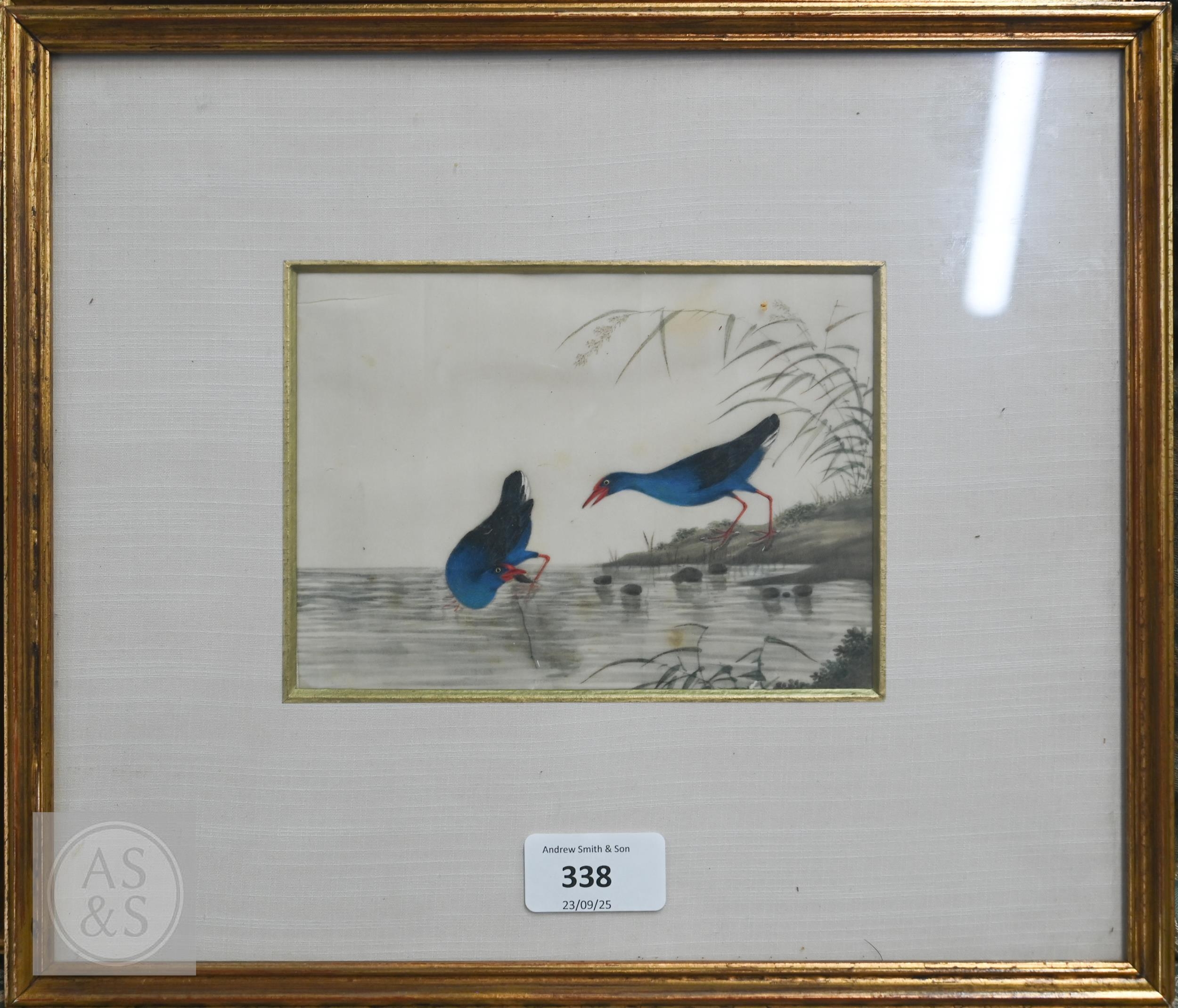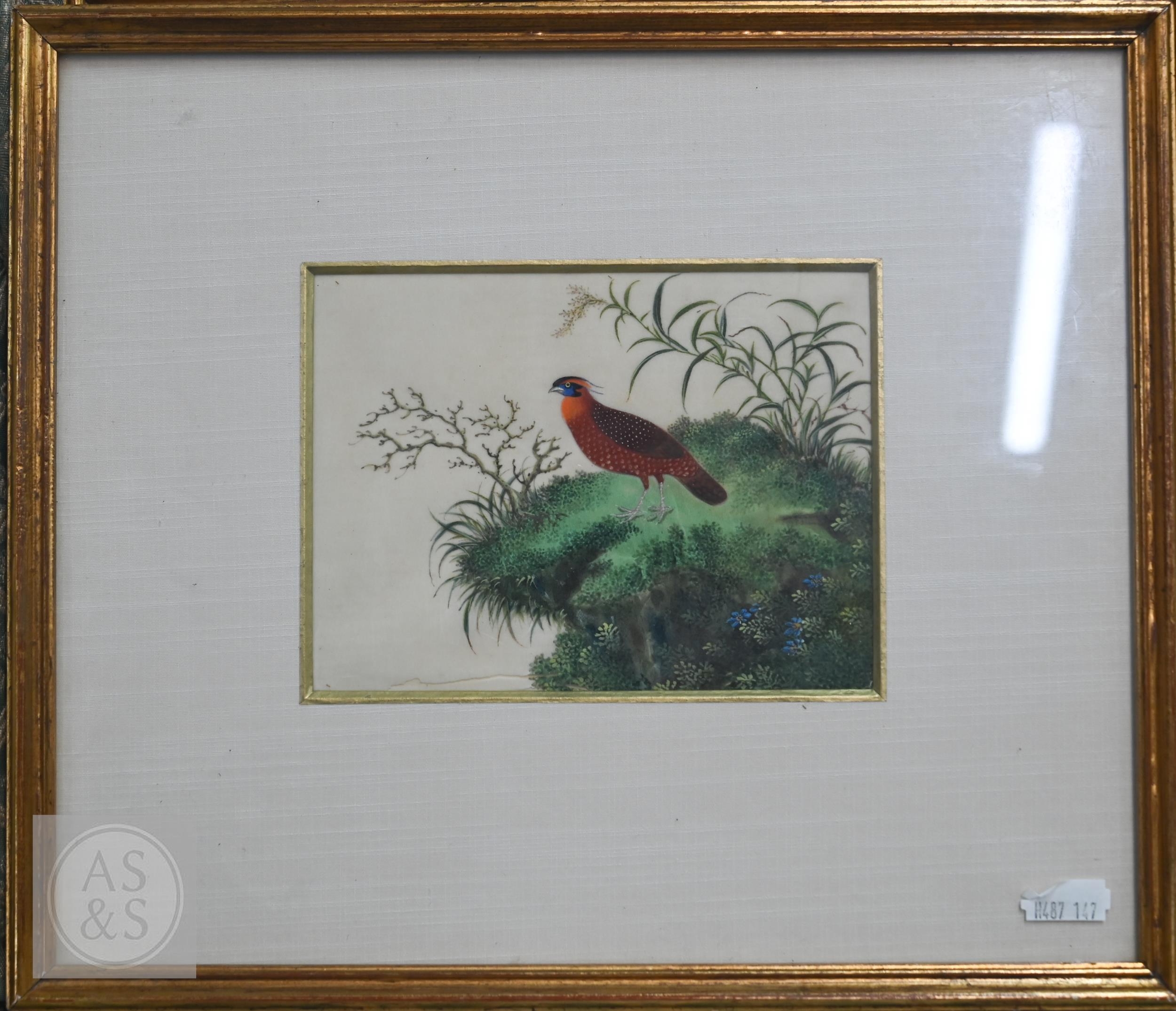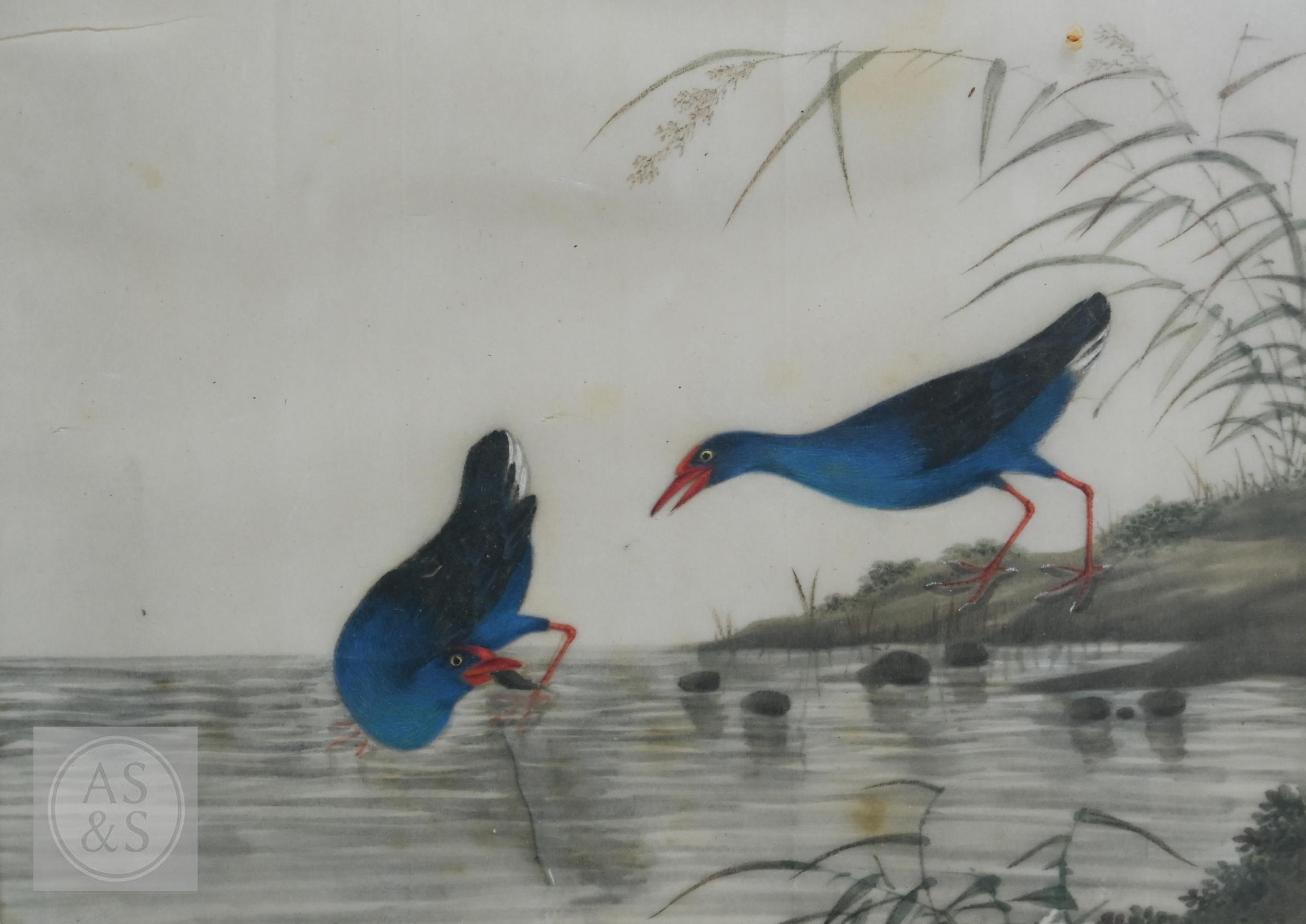 Three early 20th century Chinese export pith paintings of birds, late Qing or Republic period, mounted framed and glazed, image size - 16 cm x 12 cm (3)