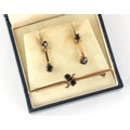 Property of a lady - a pair of 9ct gold sapphire pendant earrings, each claw set with two round cut sapphires, with post & 9ct gold butterfly fastenings, each 21mm long, boxed; together with a 9ct gold bar brooch set with two round cut sapphires, 55mm long (the three approximately 6.3 grams together) (3).