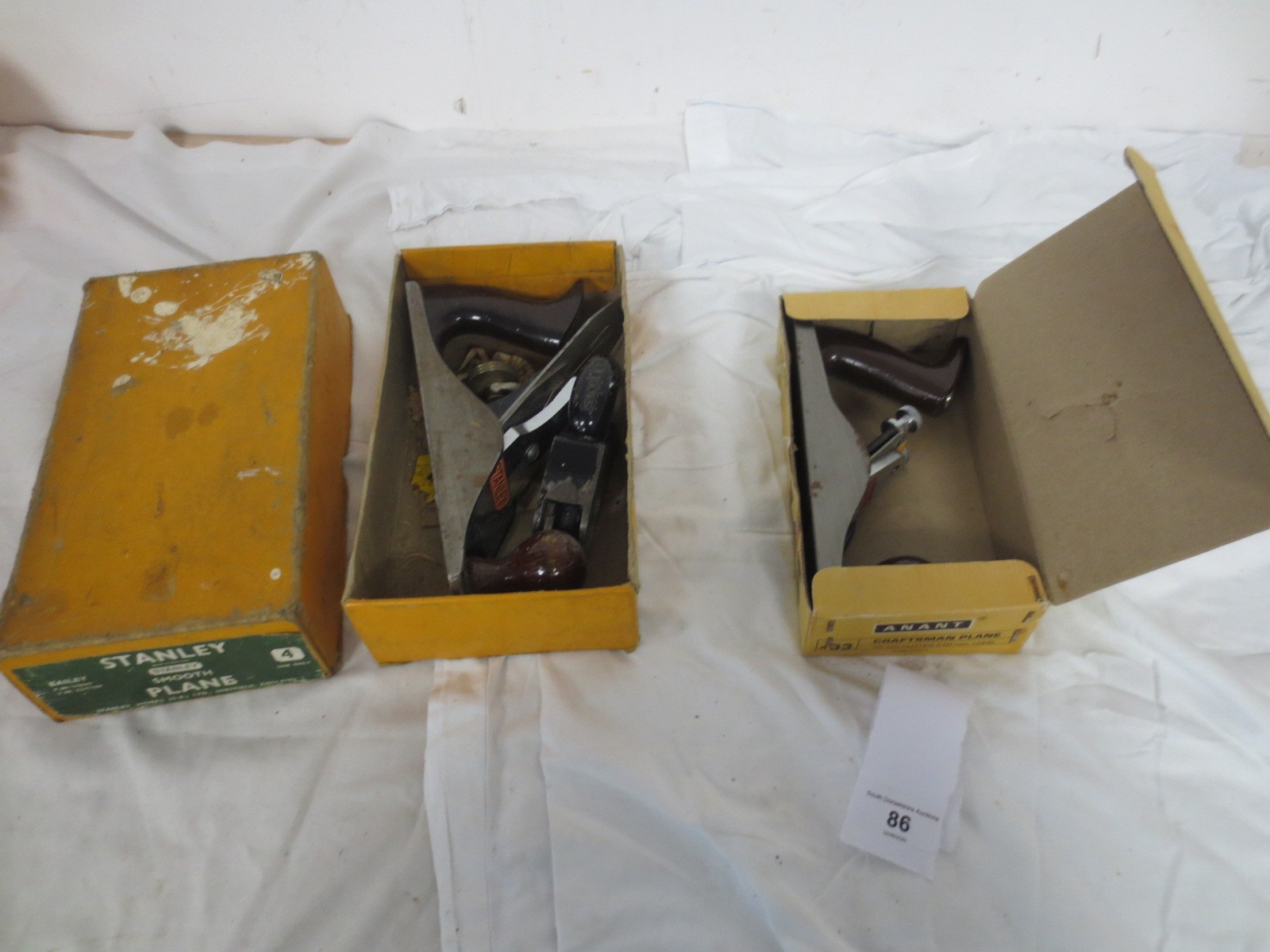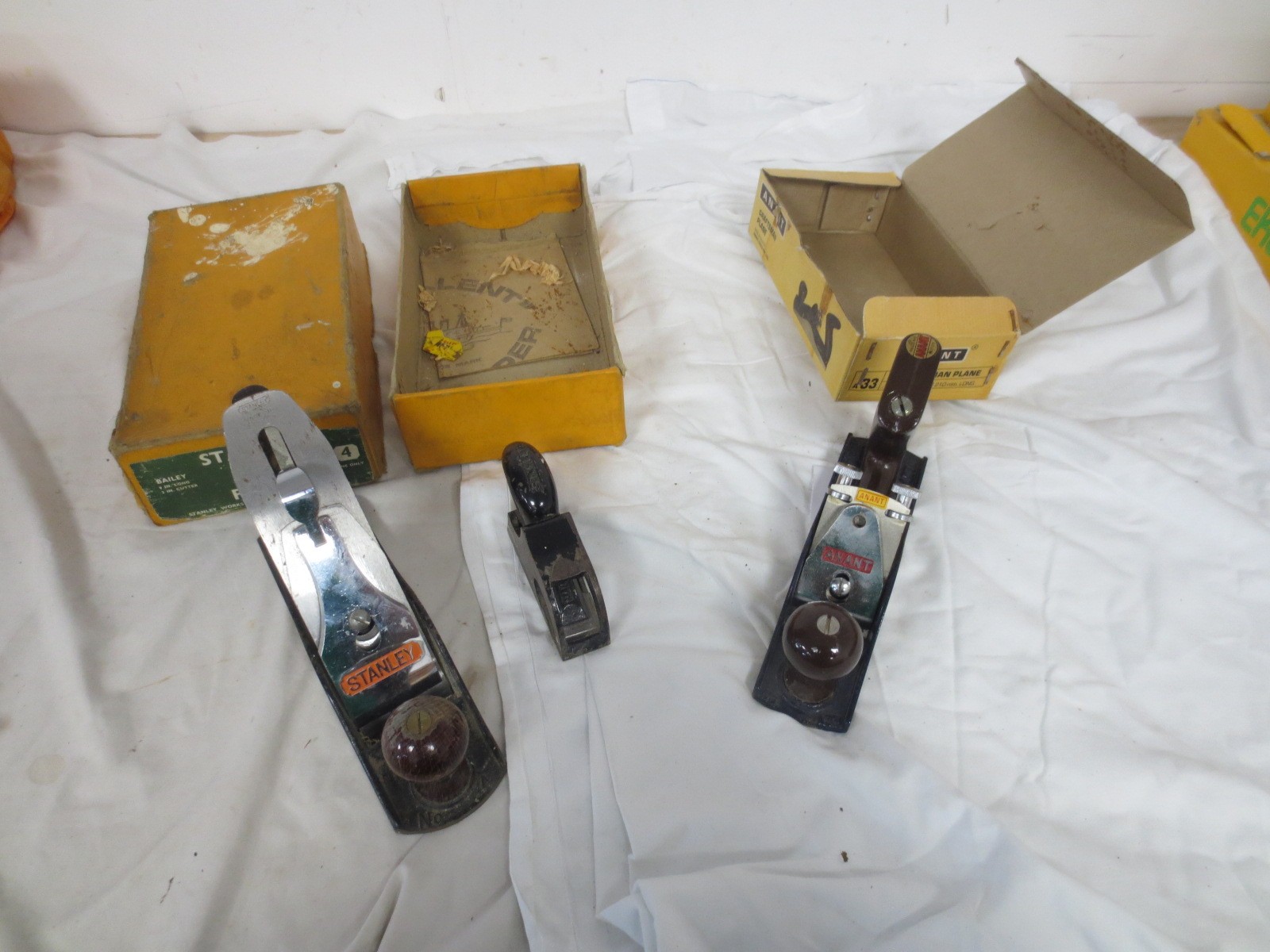 A boxed Stanley Bailey smooth plane no 4, together with a Stanley block plane, and a boxed Anant A33 craftsman plane