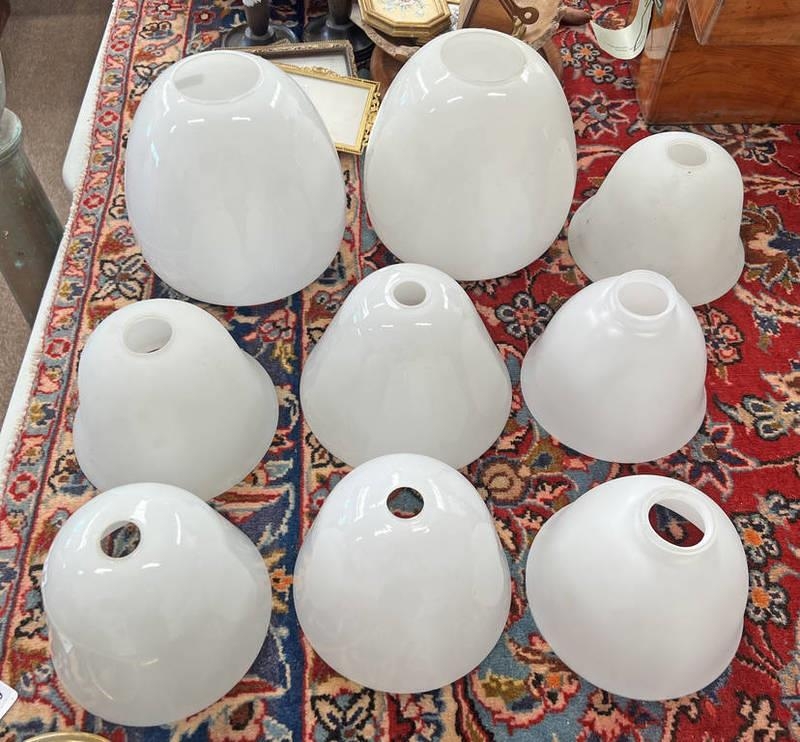 SELECTION OF WHITE GLASS SHADES INCLUDING PAIR AT 22CM TALL & 23CM WIDE