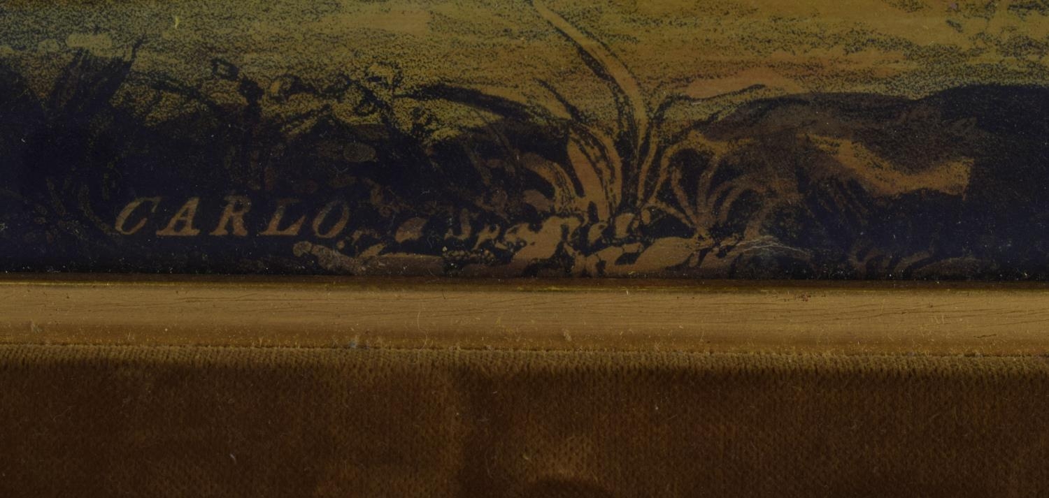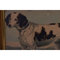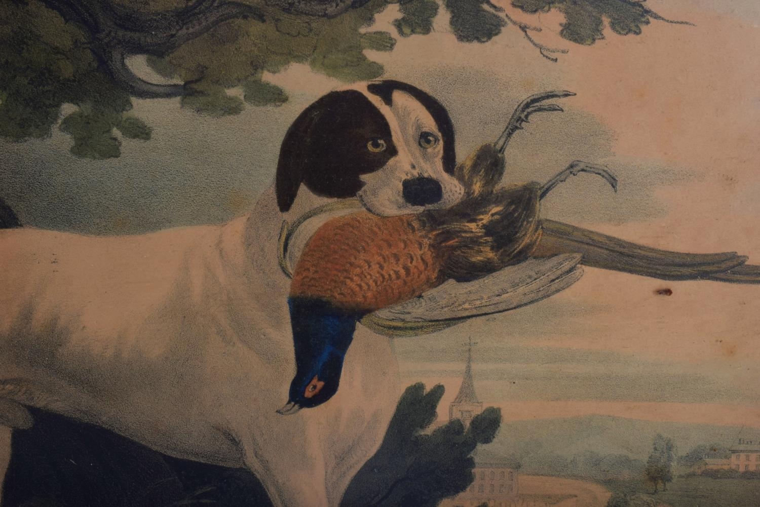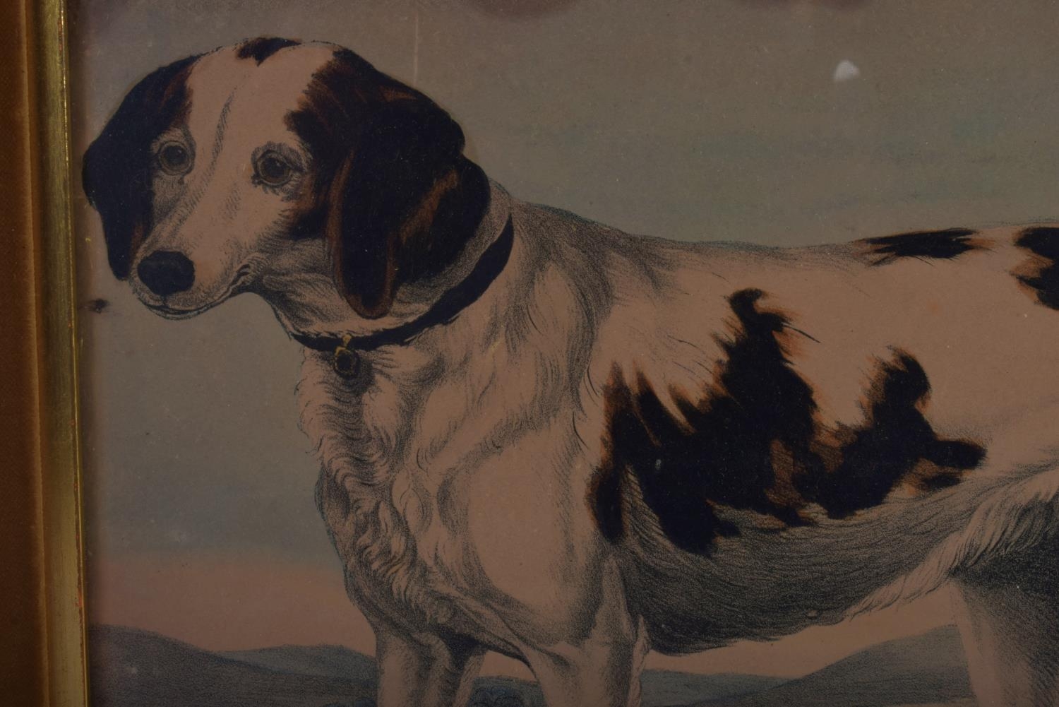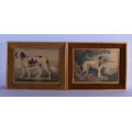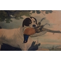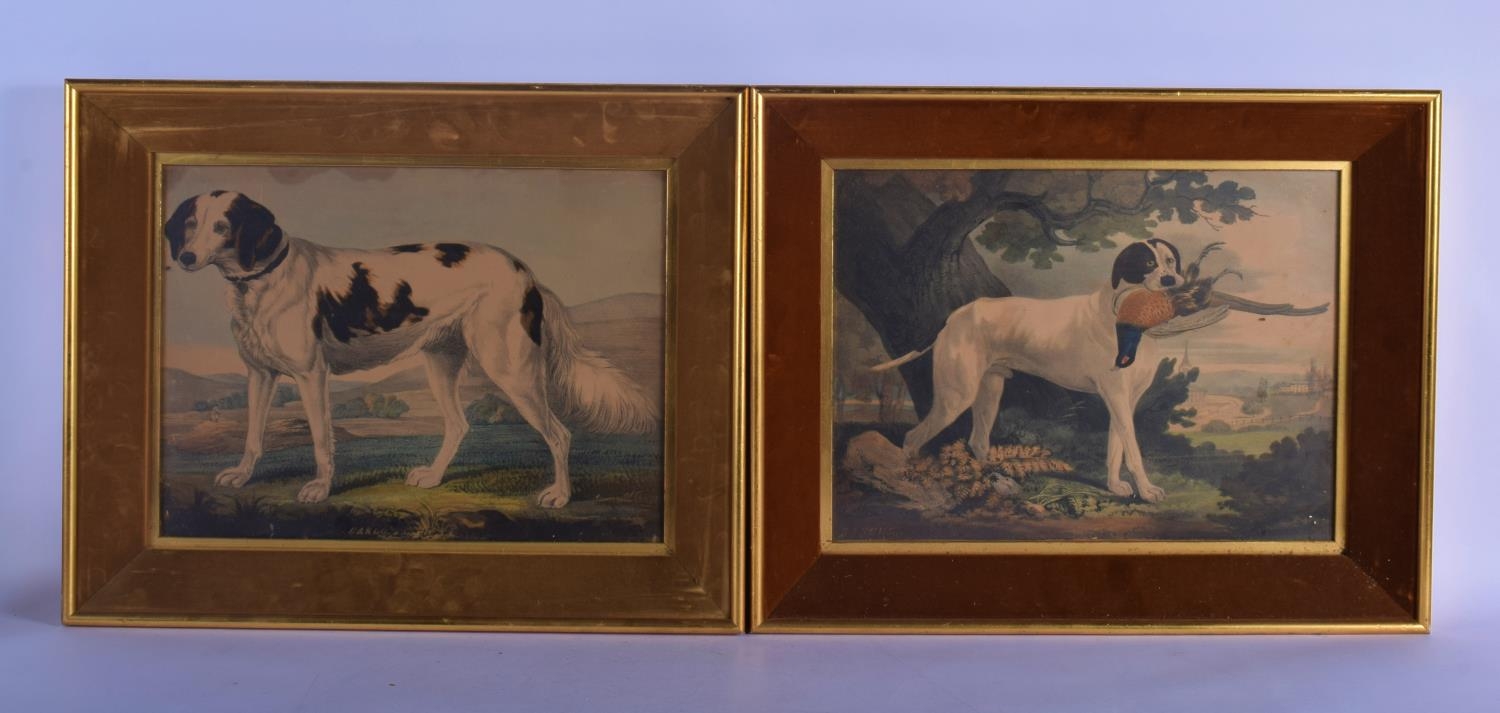 A PAIR OF 19TH CENTURY HAND COLOURED ENGLISH ENGRAVINGS depicting hunting dogs within landscapes. 48 cm x 36 cm.