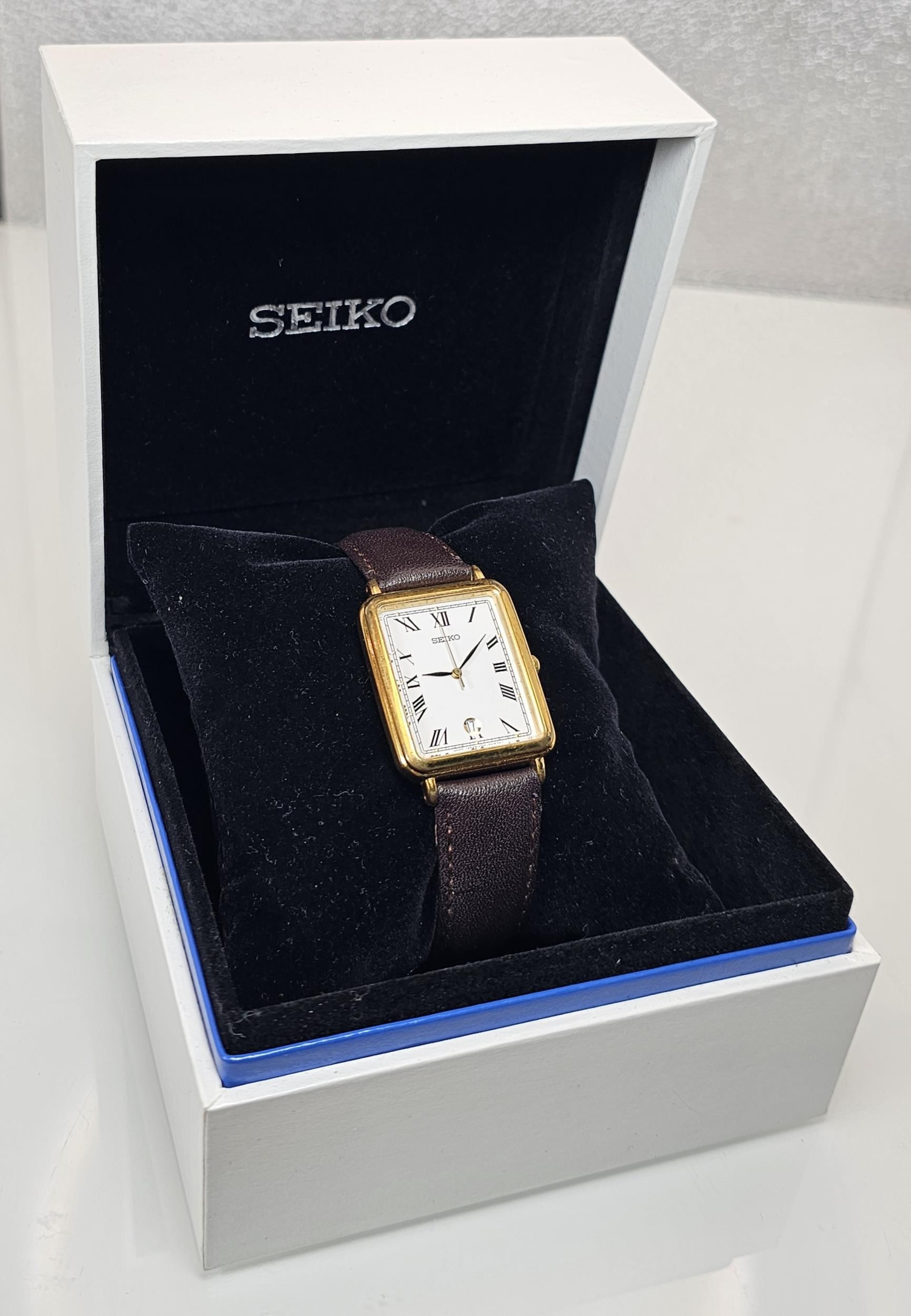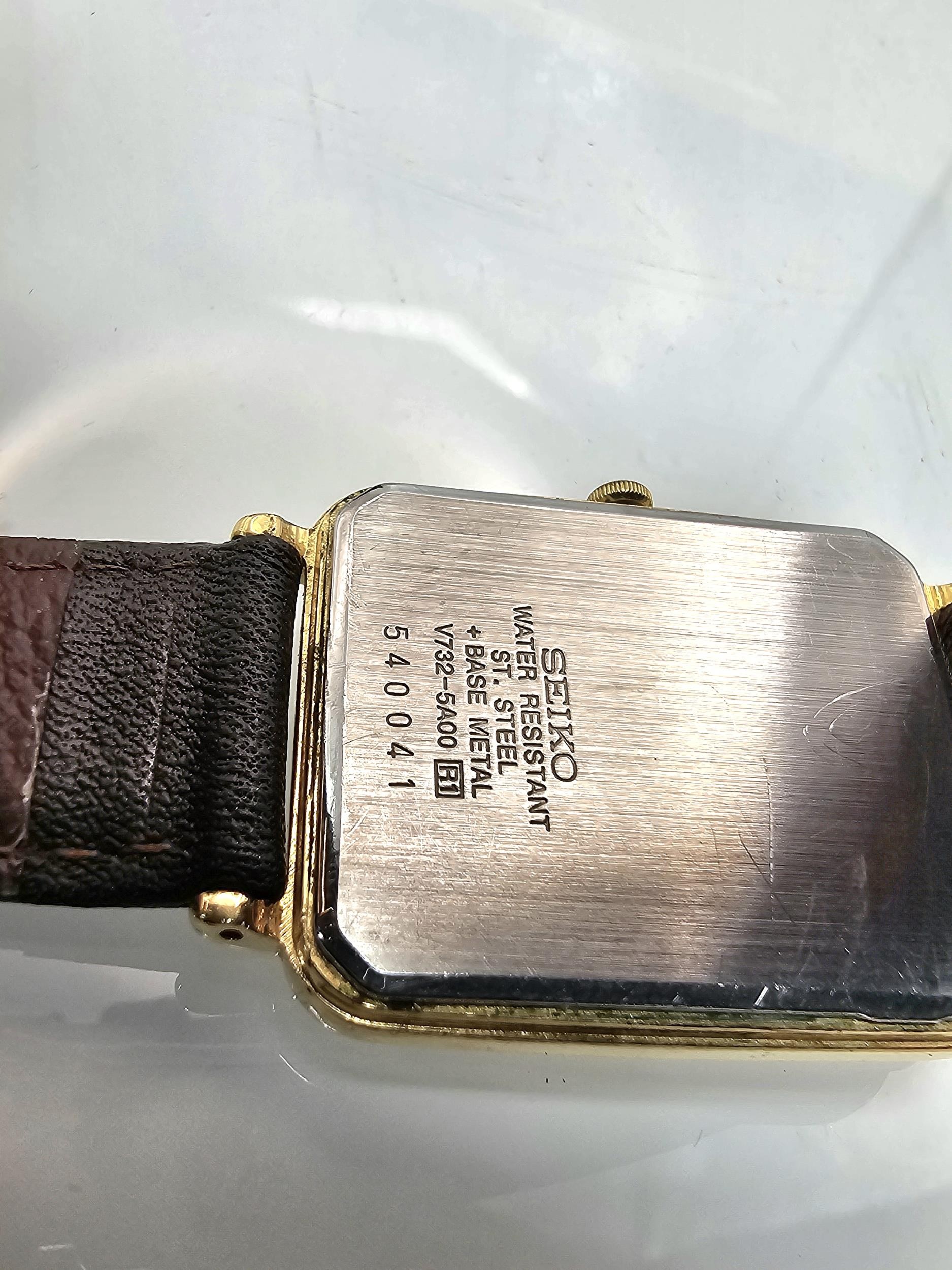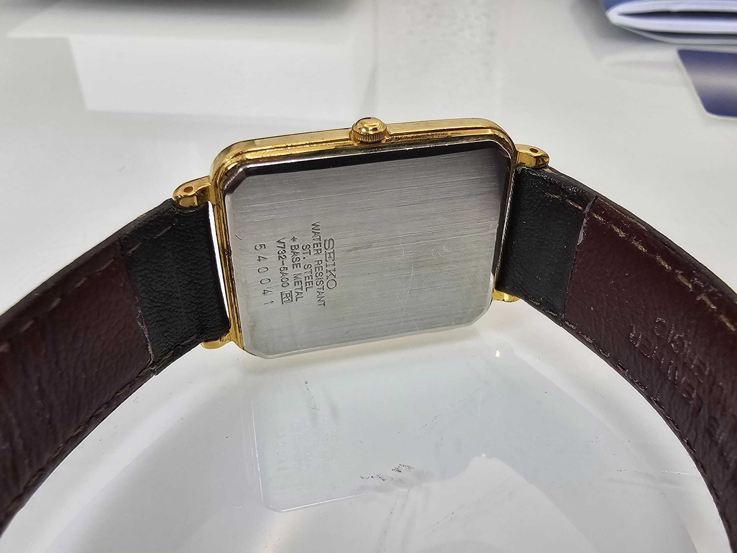 A good quality Seiko V732-5A00 tank watch with date window, in full working order, (new replacement battery very recently fitted), in excellent hardly used condition, complete with its original box, outer ox and paperwork. It has a good elegant design.
