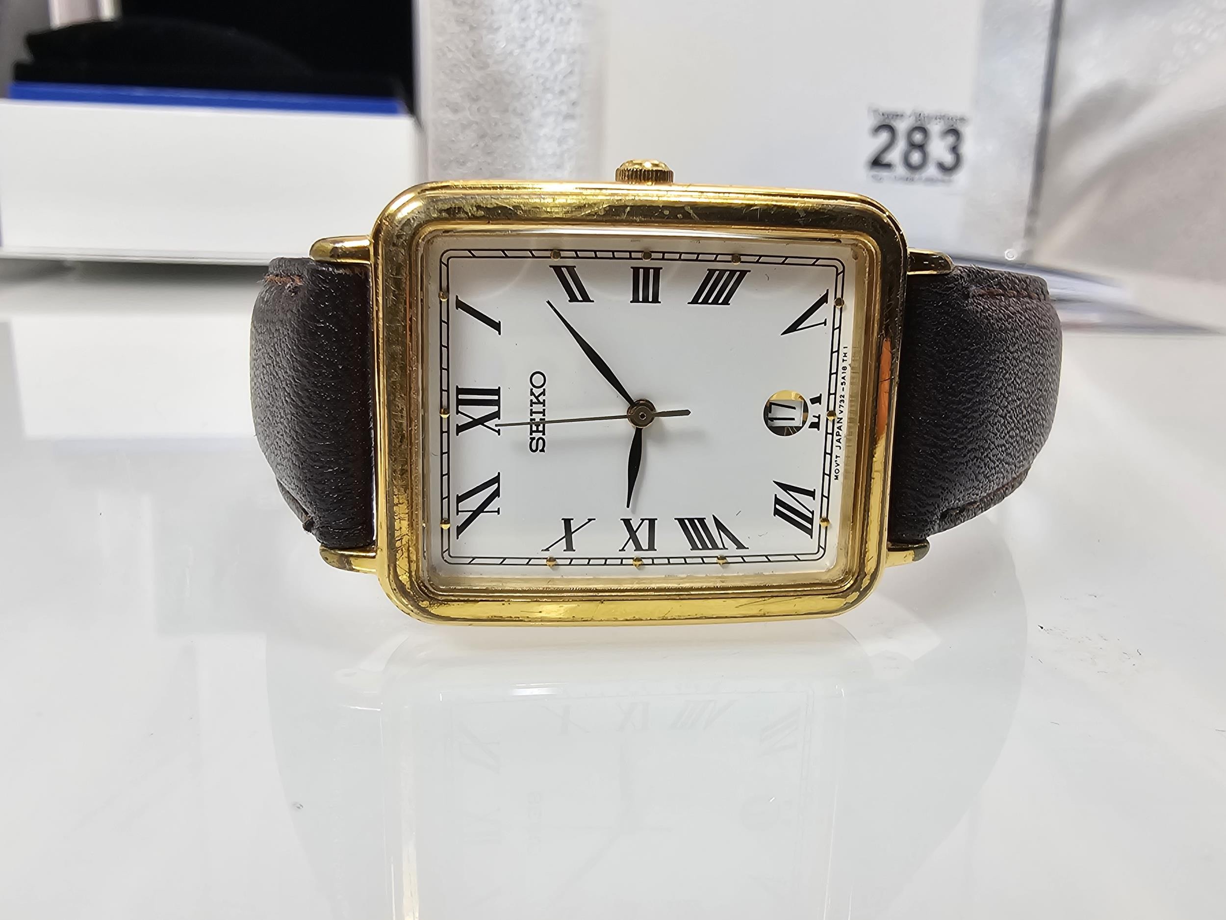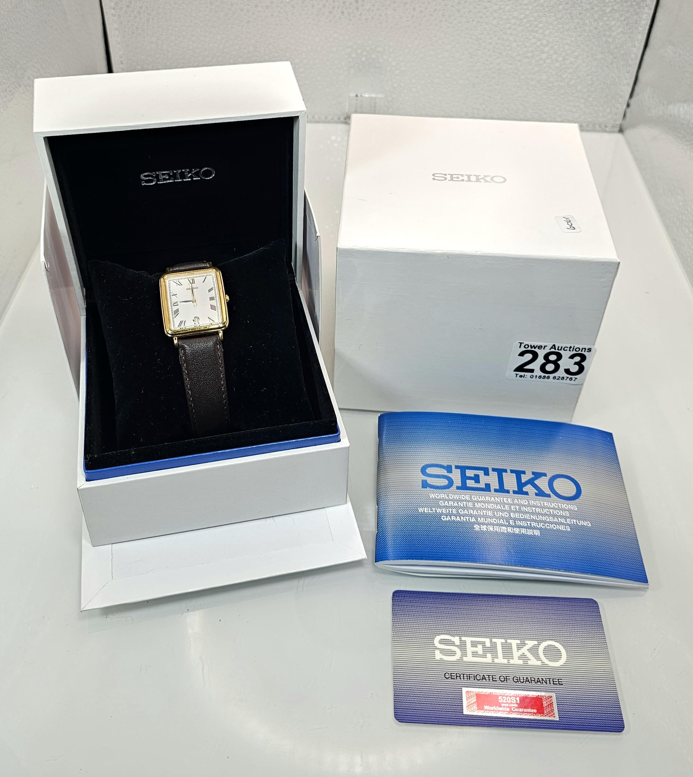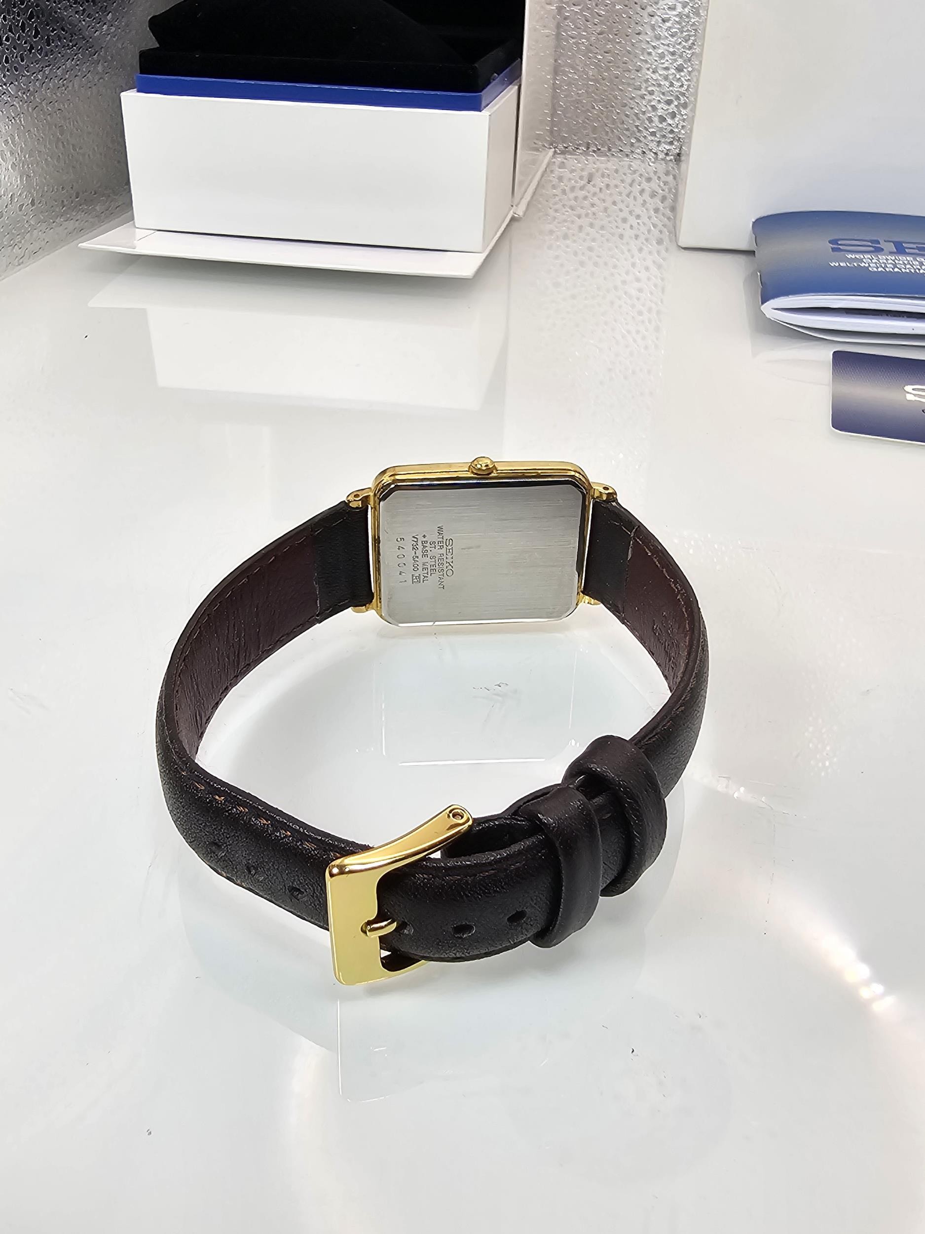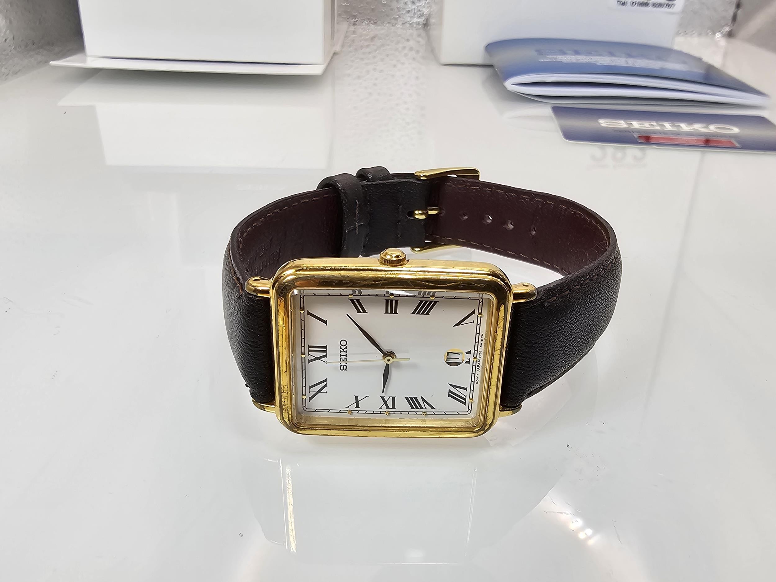 A good quality Seiko V732-5A00 tank watch with date window, in full working order, (new replacement battery very recently fitted), in excellent hardly used condition, complete with its original box, outer ox and paperwork. It has a good elegant design.