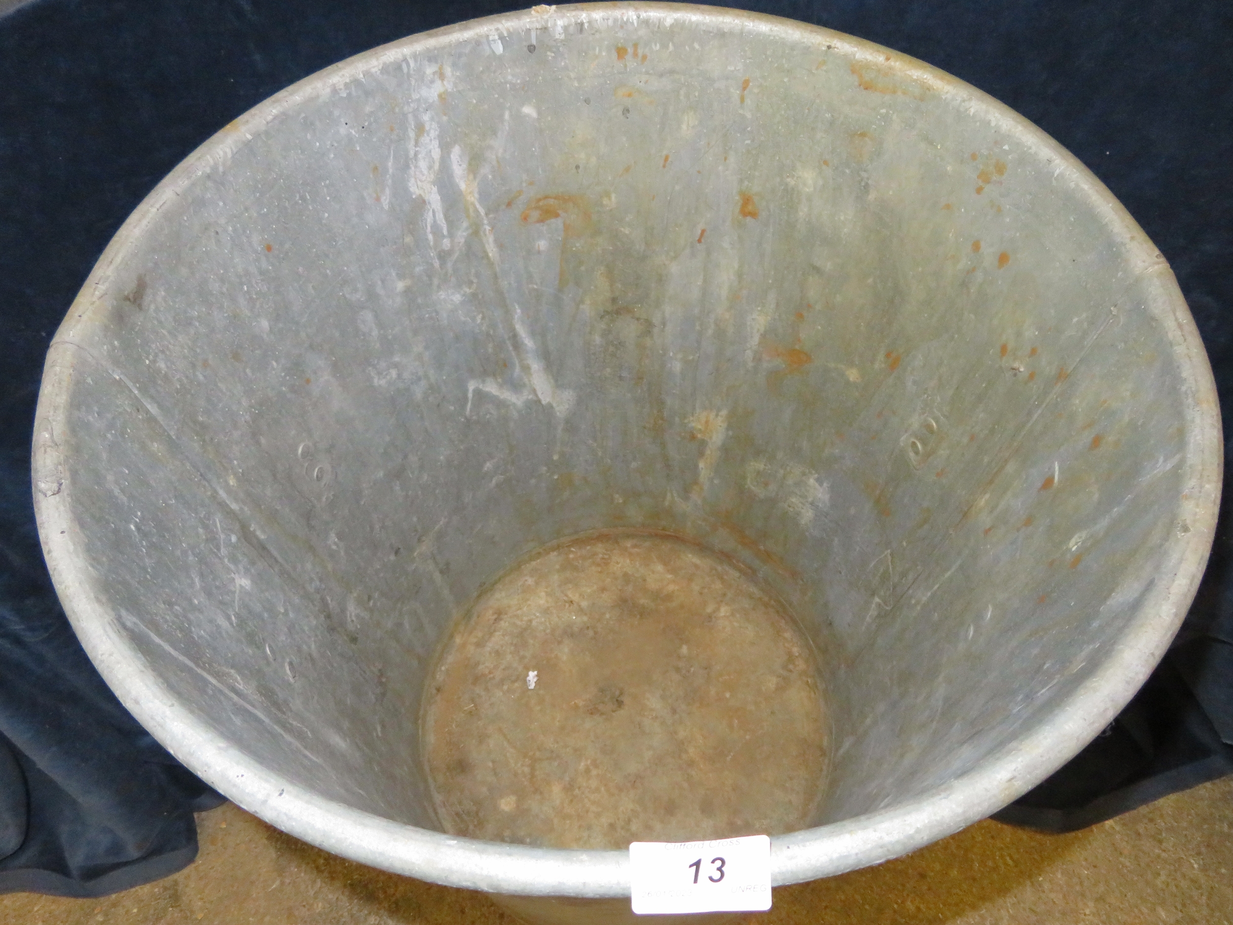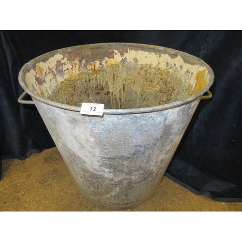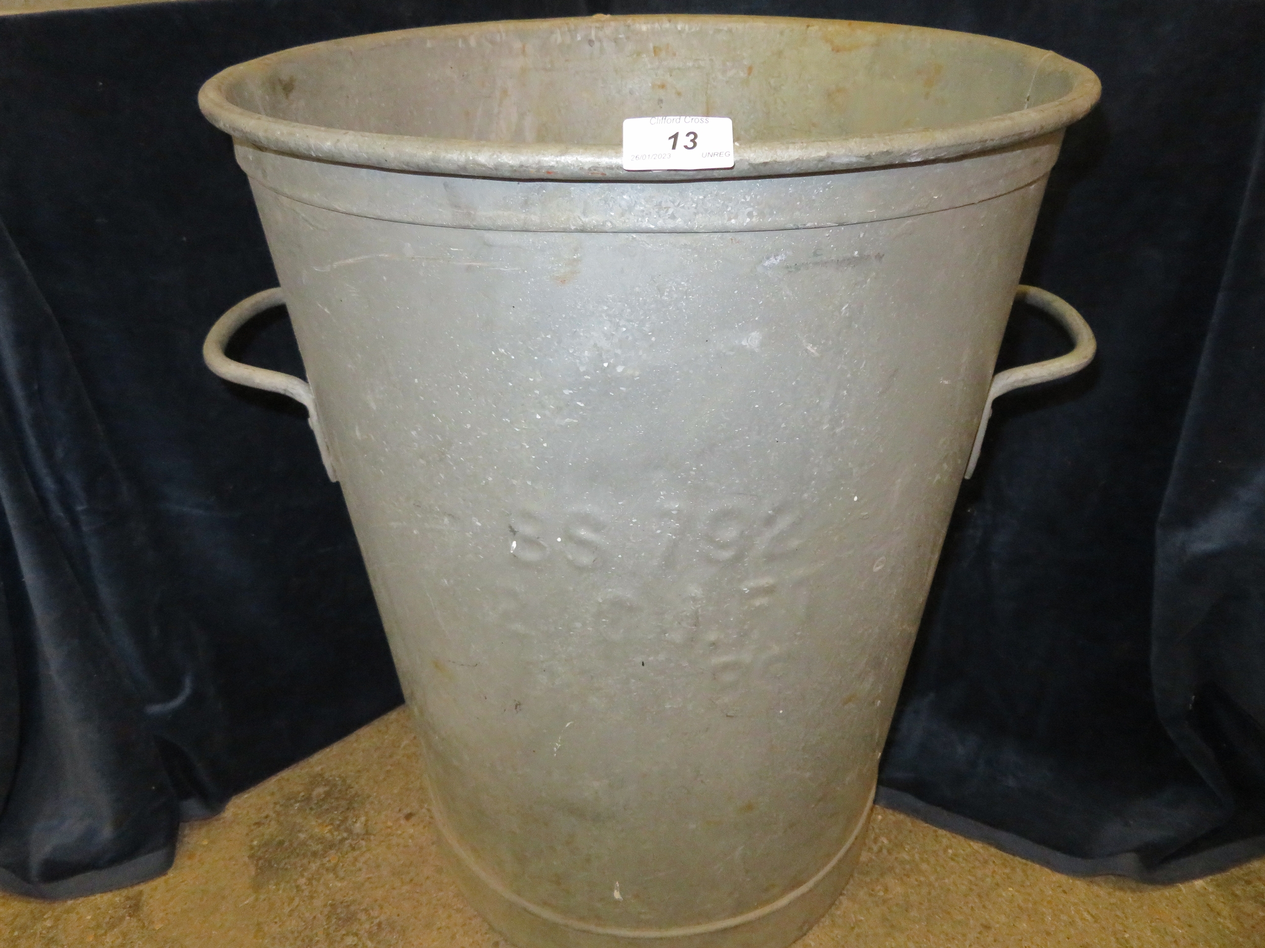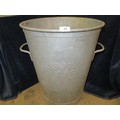 A galvanised two-handled bin with sloping sides. Top diameter approx 45cm and approx 60cm tall.