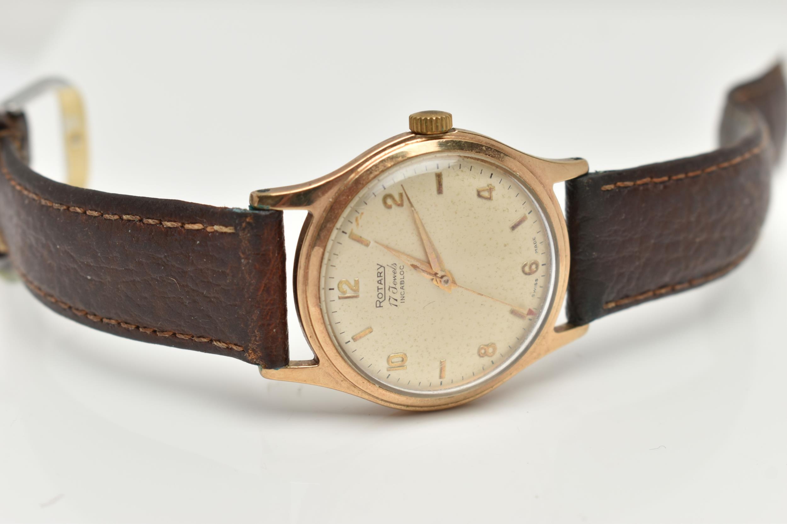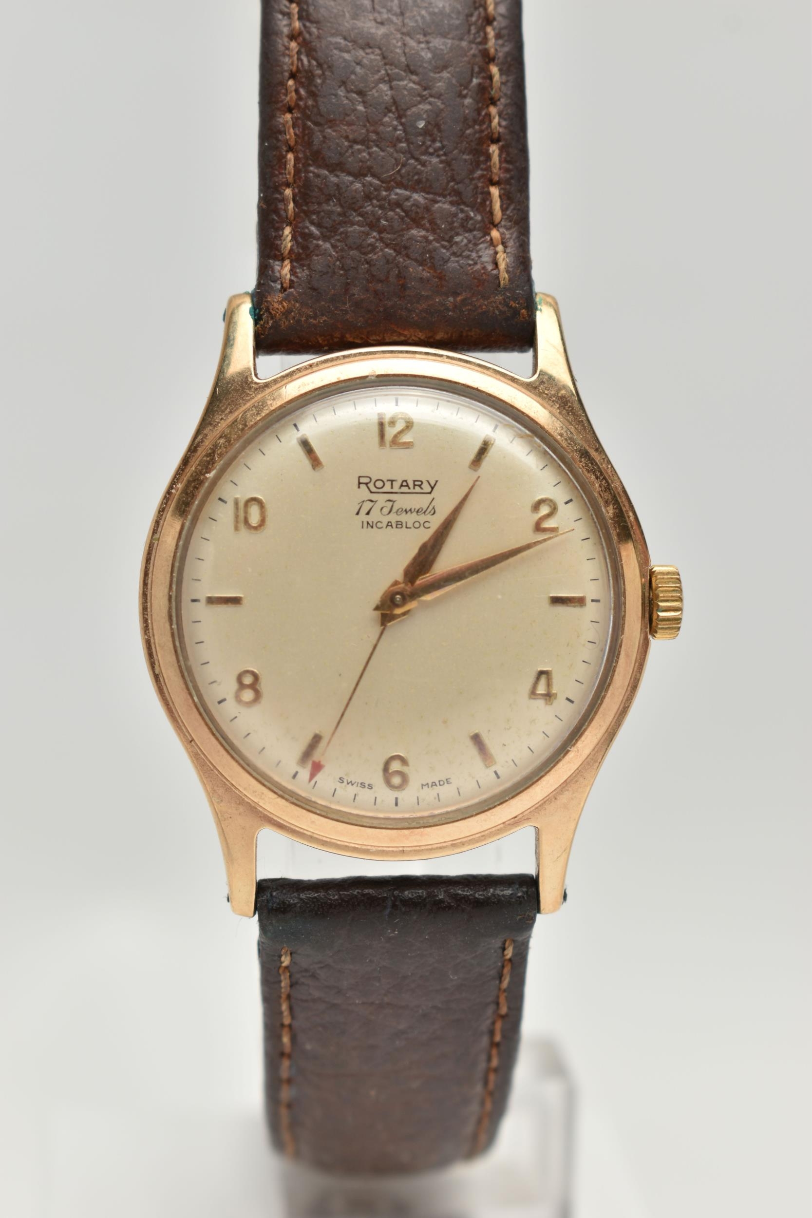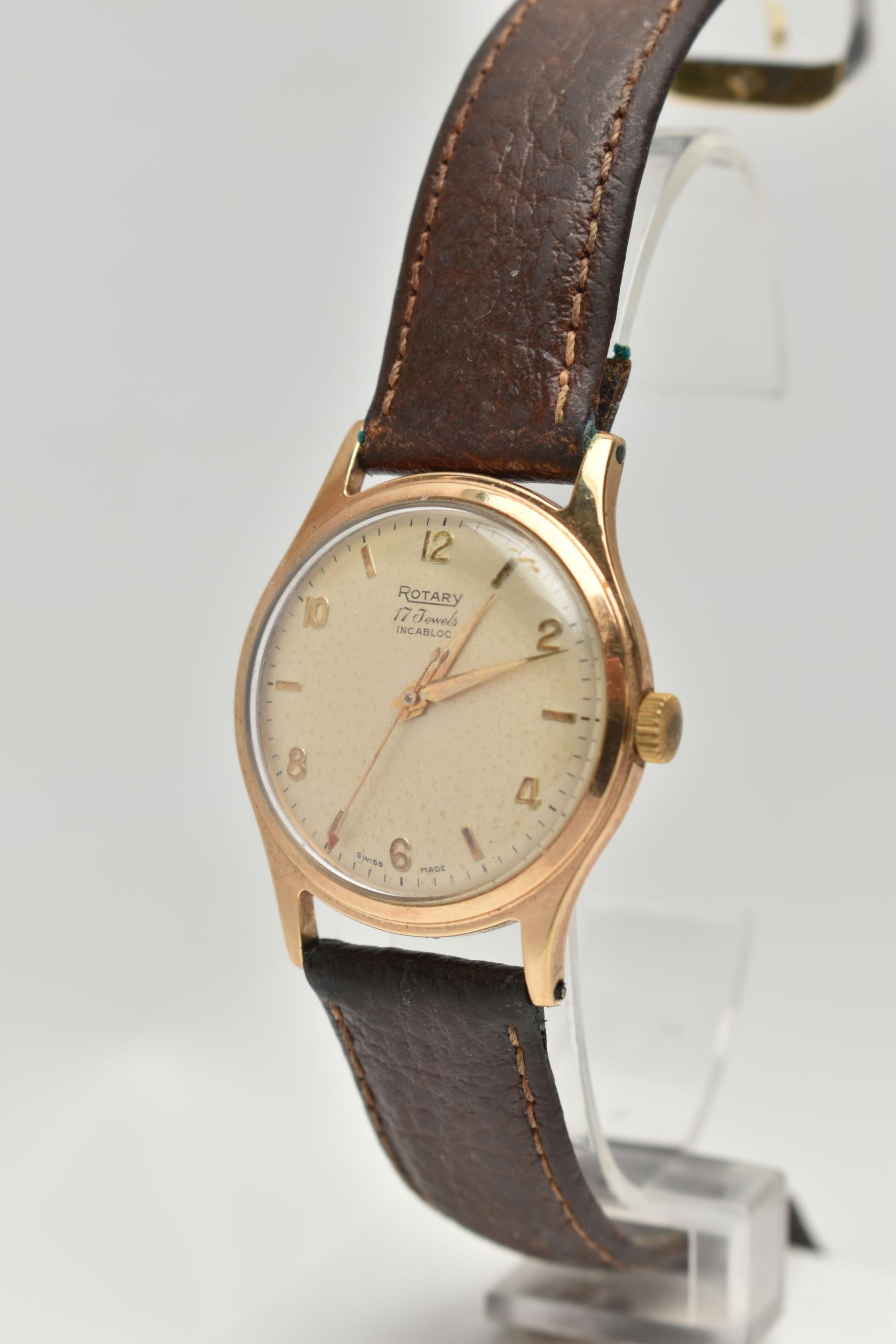 A YELLOW METAL 'ROTARY' WRISTWATCH, hand wound movement, round dial, signed 'Rotary' 17 jewels incabloc, Arabic numerals interspaced with baton markers, yellow metal case, approximate case width 33mm, screw case back, fitted with a brown leather strap, approximate gross weight 40.9 grams (condition report: case back not removed, believed to be 9ct gold, currently working, time keeping not tested, stitching has come undone on strap)