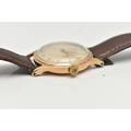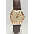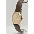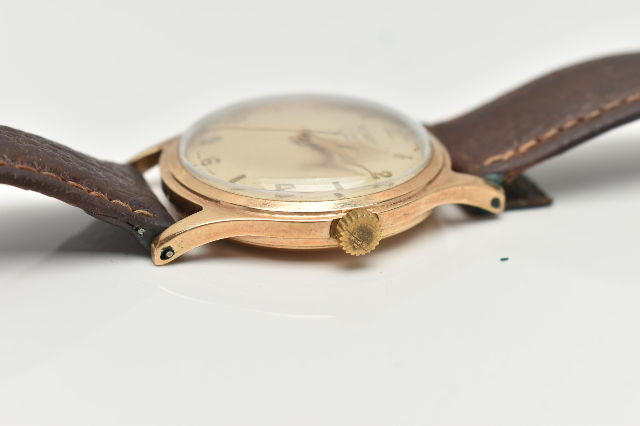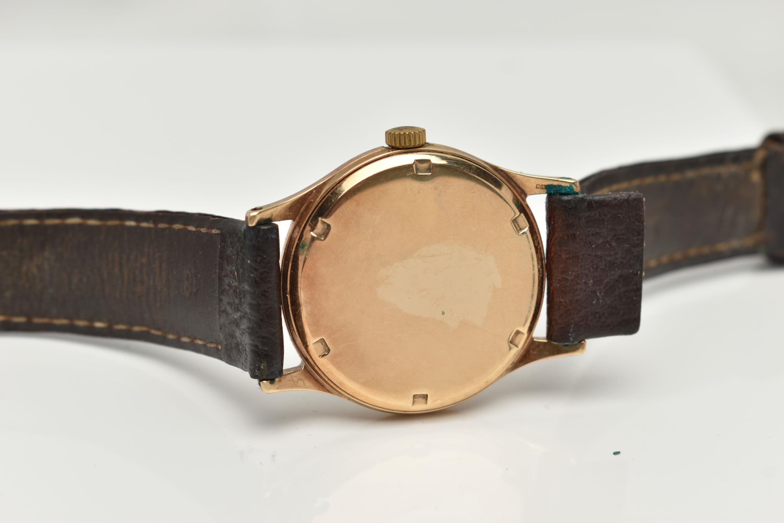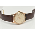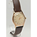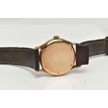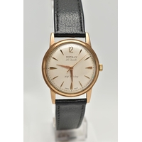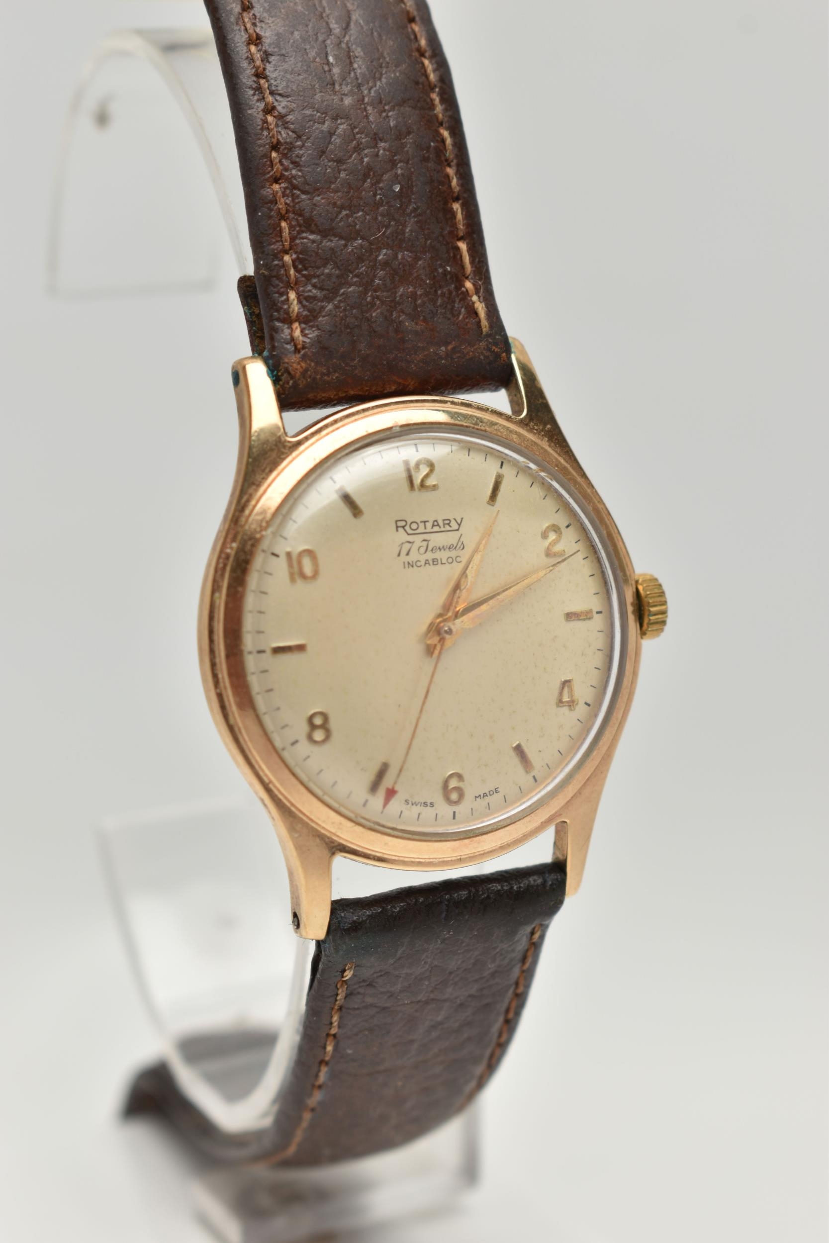 A YELLOW METAL 'ROTARY' WRISTWATCH, hand wound movement, round dial, signed 'Rotary' 17 jewels incabloc, Arabic numerals interspaced with baton markers, yellow metal case, approximate case width 33mm, screw case back, fitted with a brown leather strap, approximate gross weight 40.9 grams (condition report: case back not removed, believed to be 9ct gold, currently working, time keeping not tested, stitching has come undone on strap)