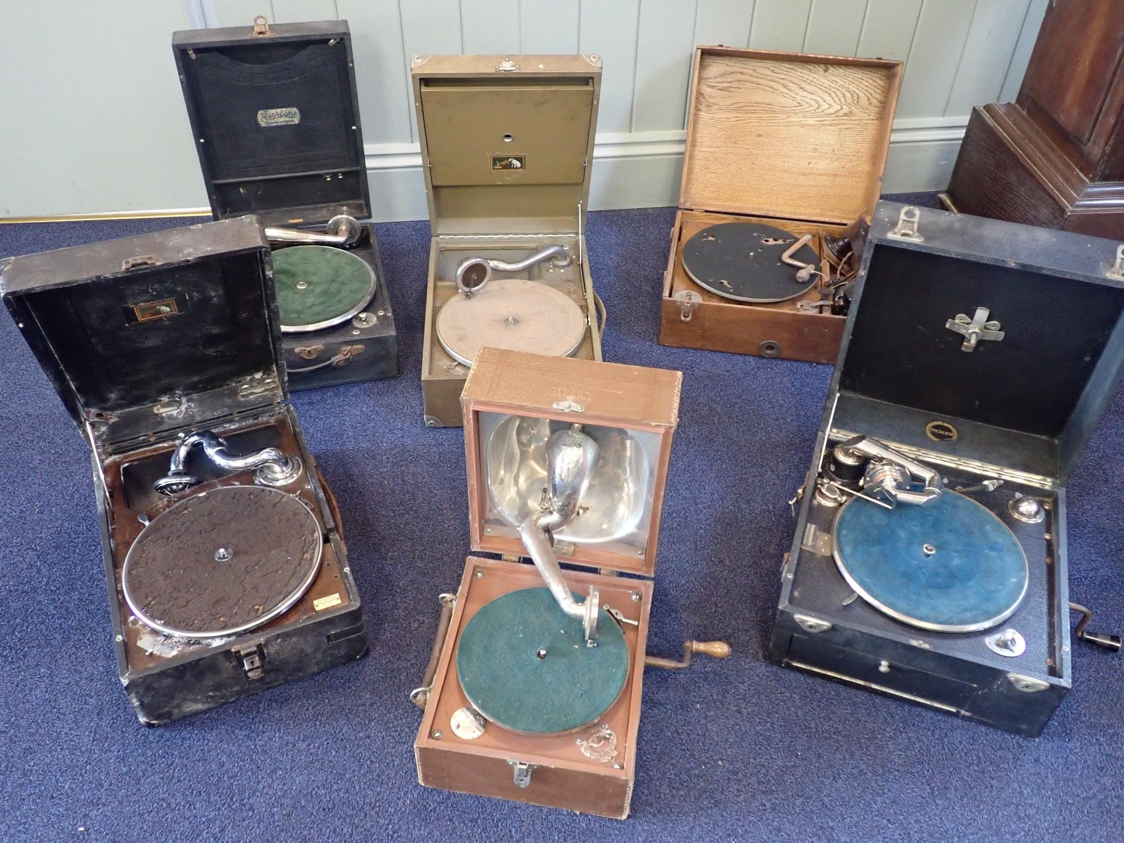 SIX PORTABLE GRAMOPHONESincluding HMV 101 and 102 (both lacking winders), Decca 'Junior' bowl in lid type,, and others (for spares or restoration) (6)