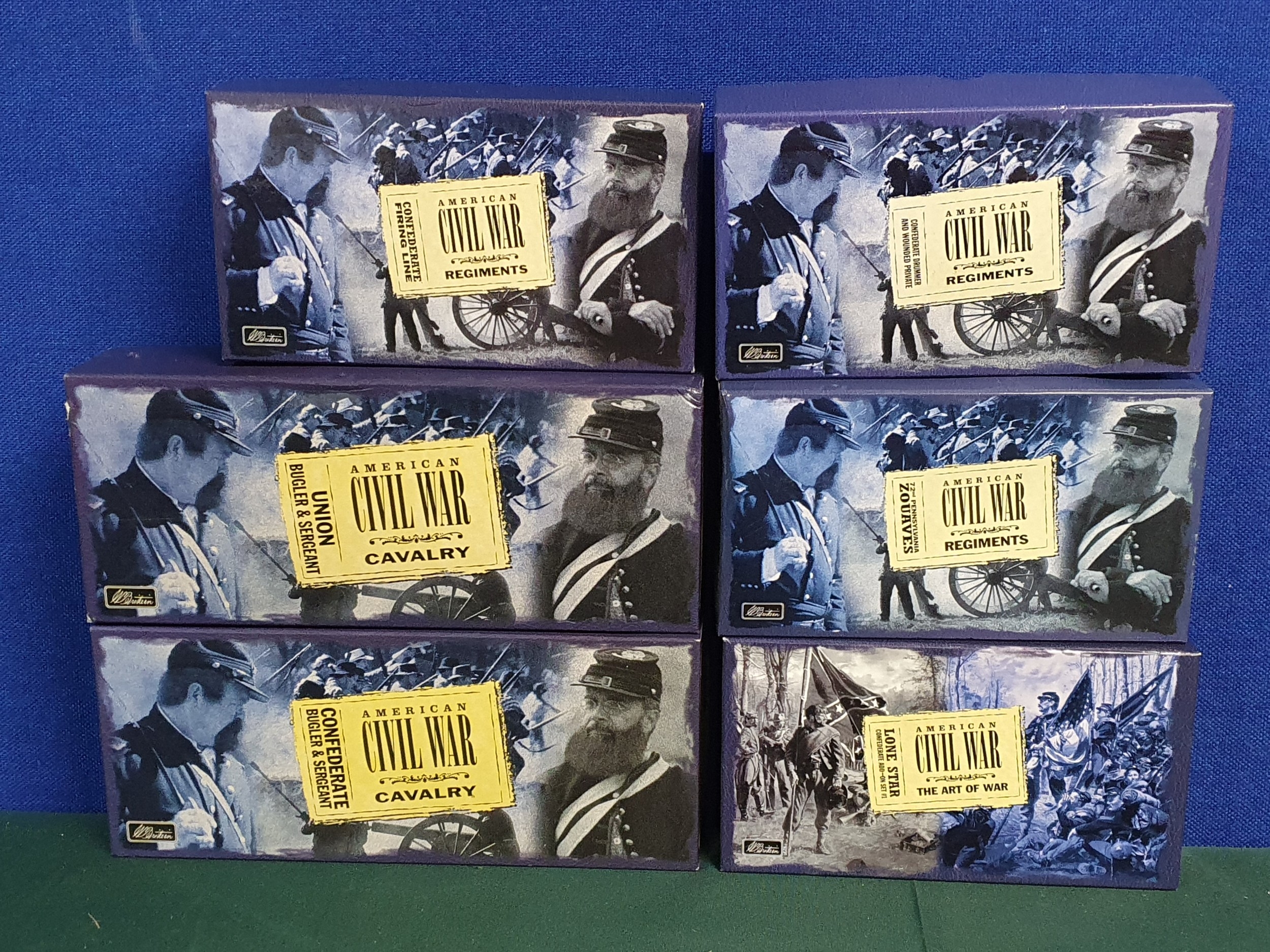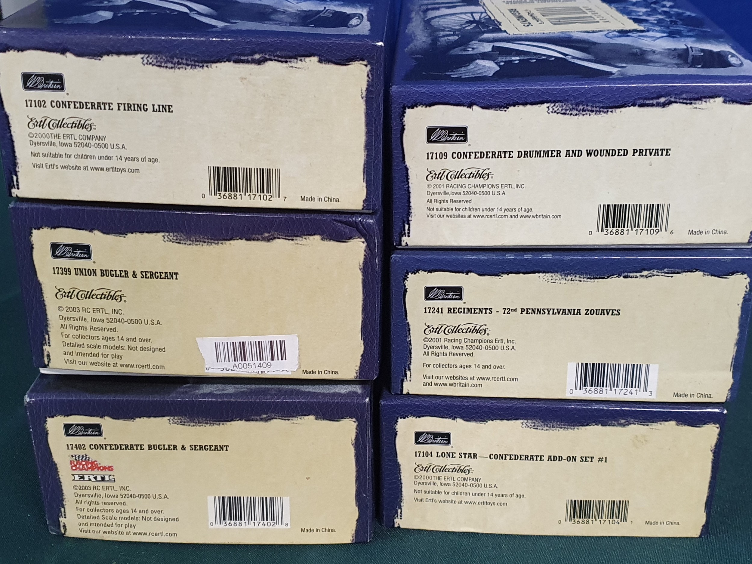 Six boxed Britains American Civil War Sets of Figures comprising 17109 Confederate Drummer and Wounded Private, 17241 Regiments- 72nd Pennsylvania Zouaves, 17104 Lone Star- Confederate Add-on Set No.1, 17102 Confederate Firing Line, 17399 Union Bugler & Sergeant and 17402 Confederate Bugler & Sargeant, all unopened as new
