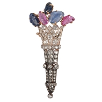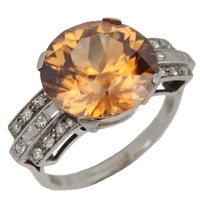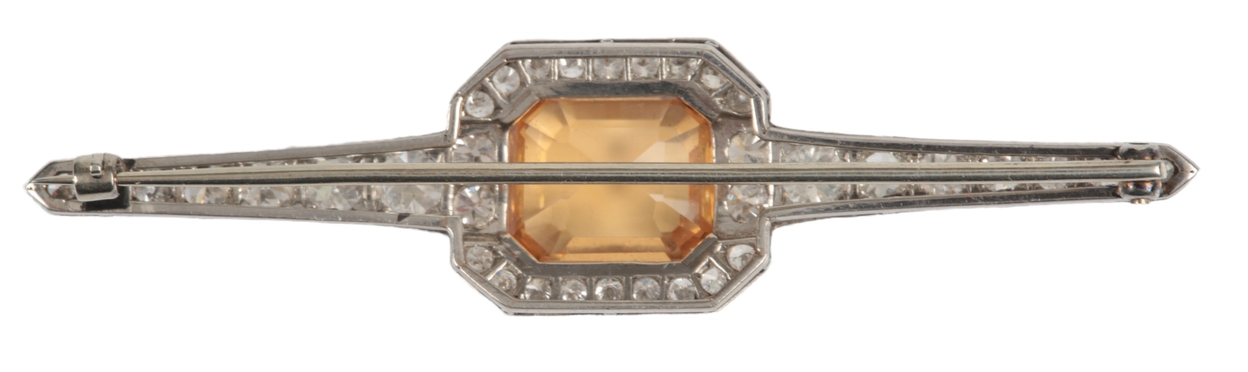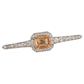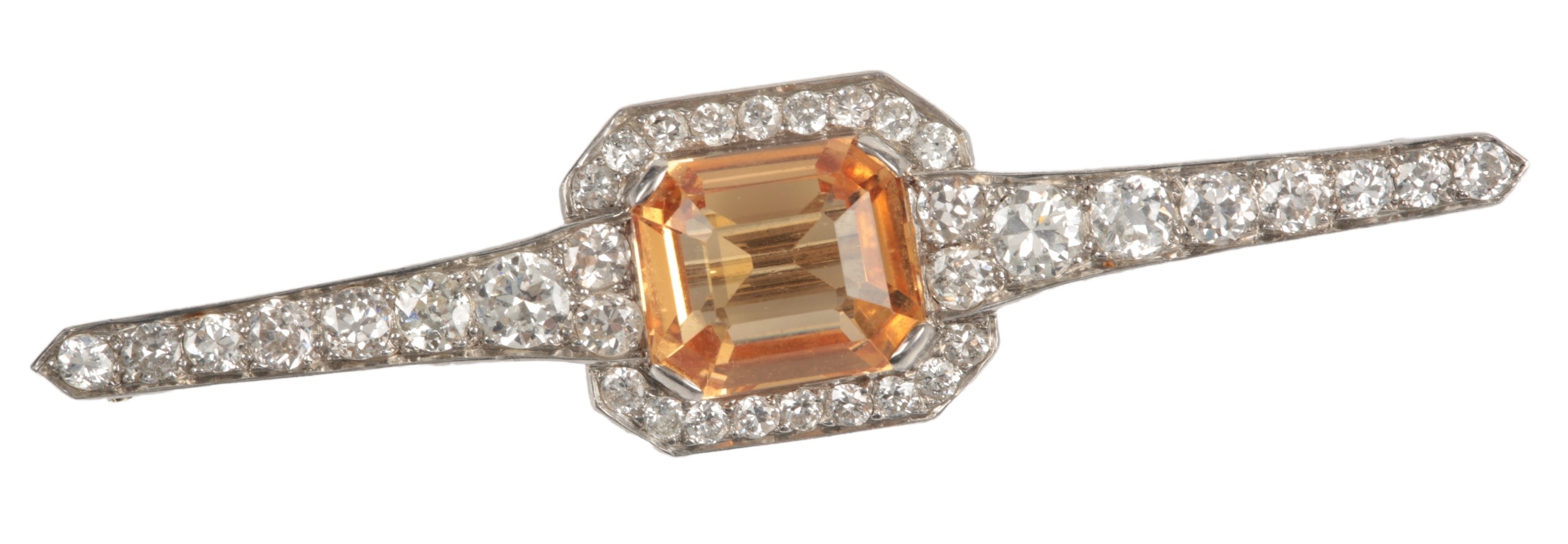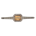 An Art Deco topaz and diamond bar brooch, 1930s, claw-set with a step-cut orange topaz weighing approximately 12.00 carats, to a geometric bar brooch set with circular-cut diamonds totalling approximately 2.80 carats, length 6.8cm, gross weight approximately 9.5cm