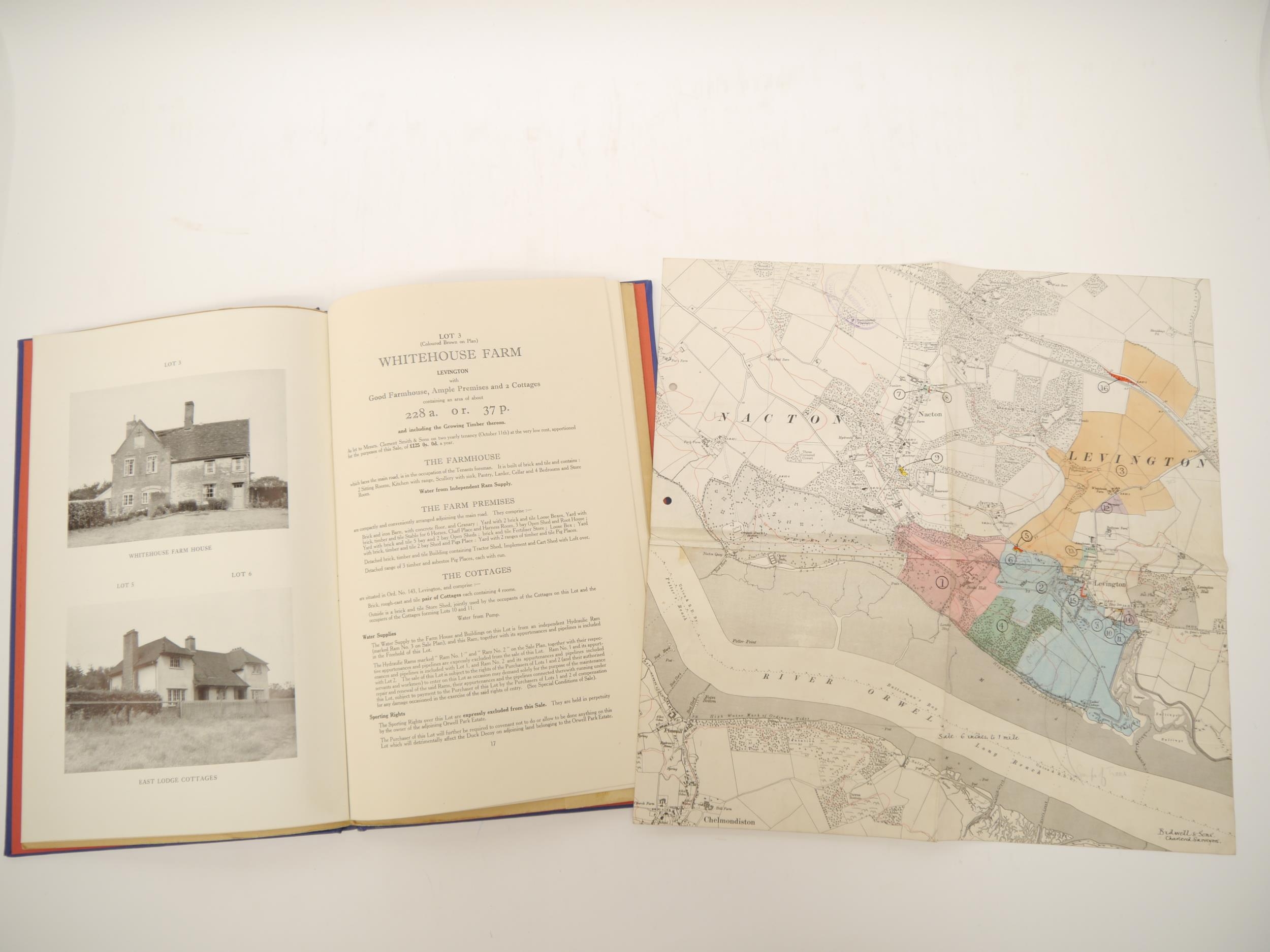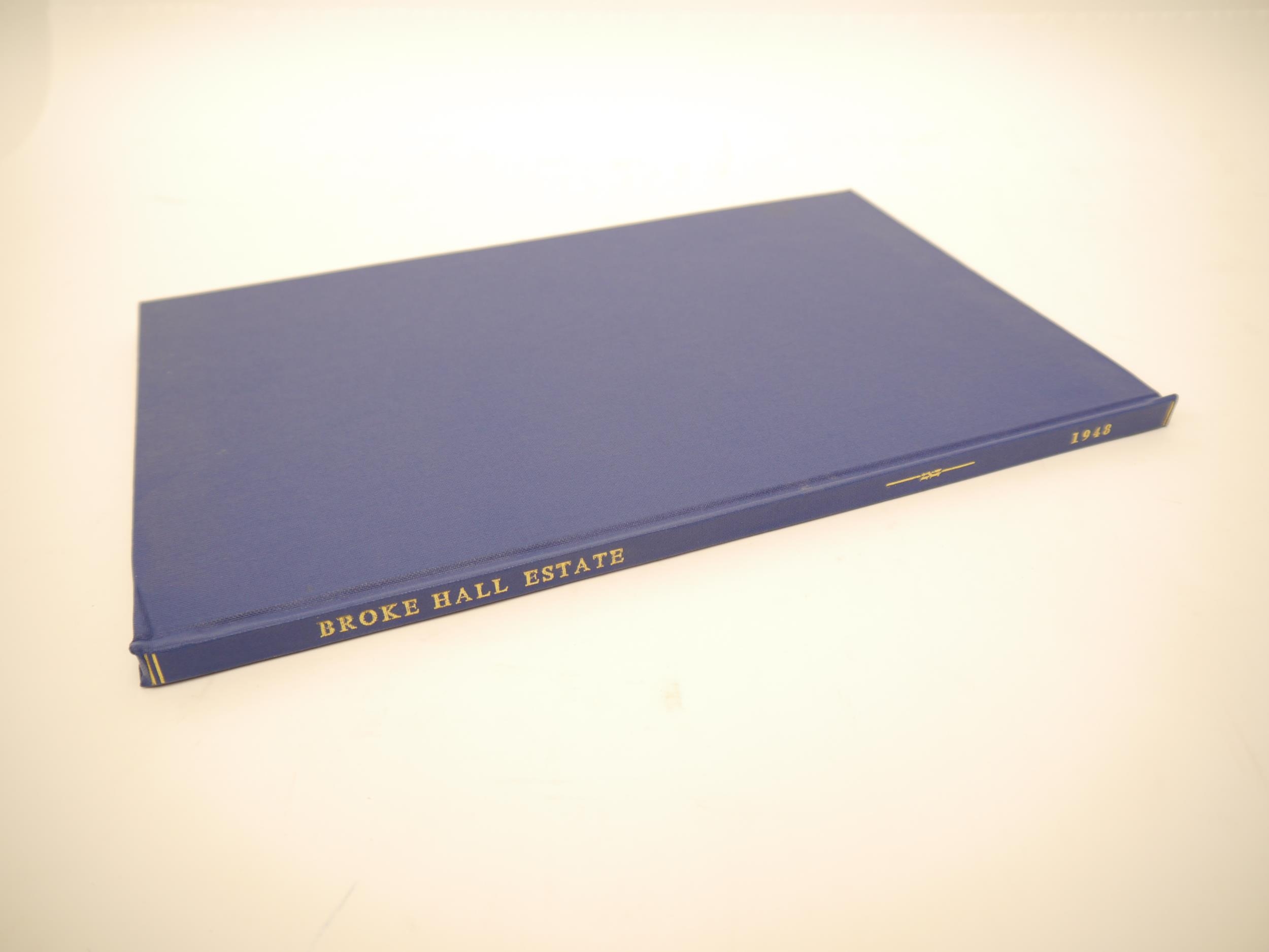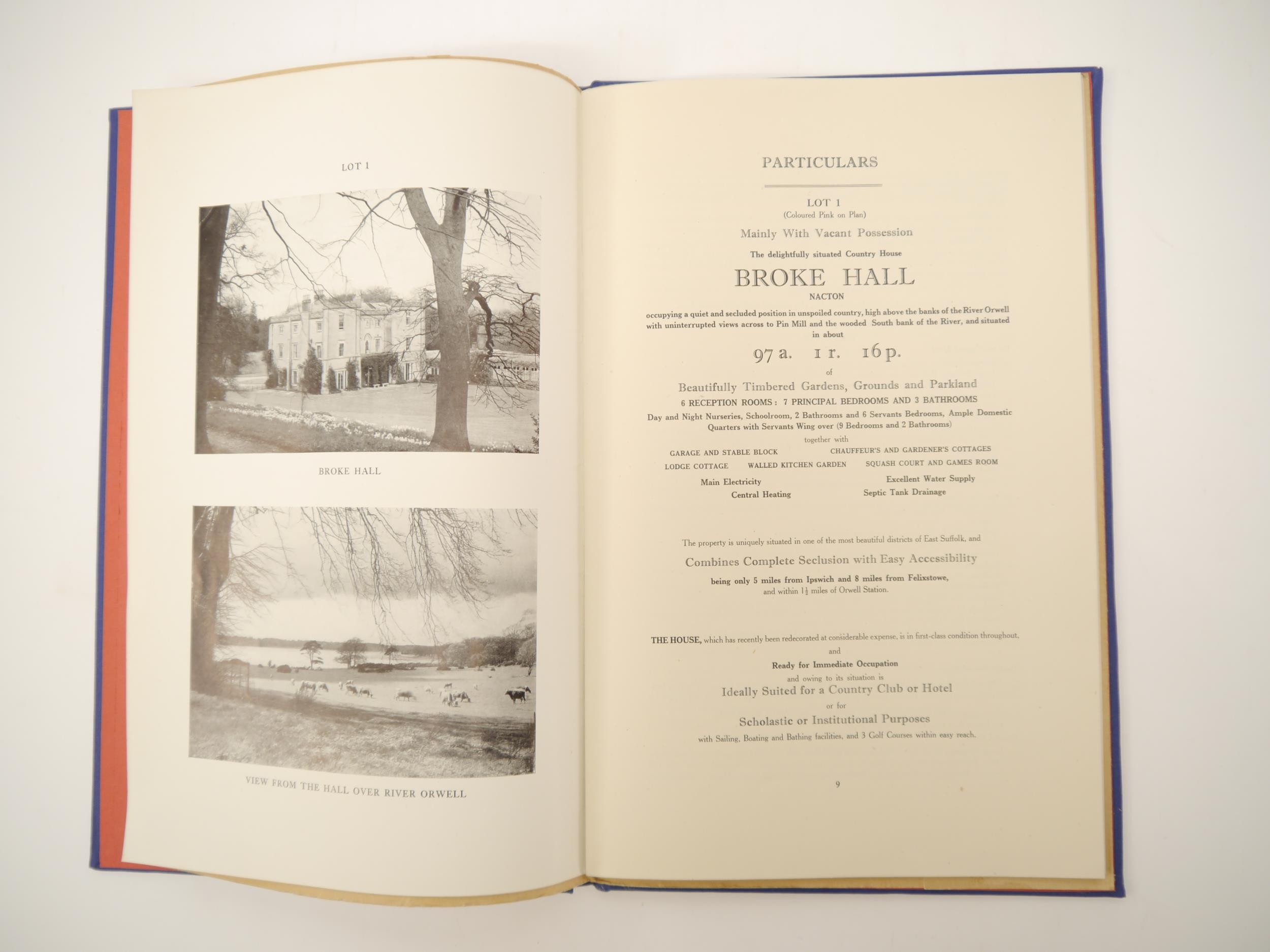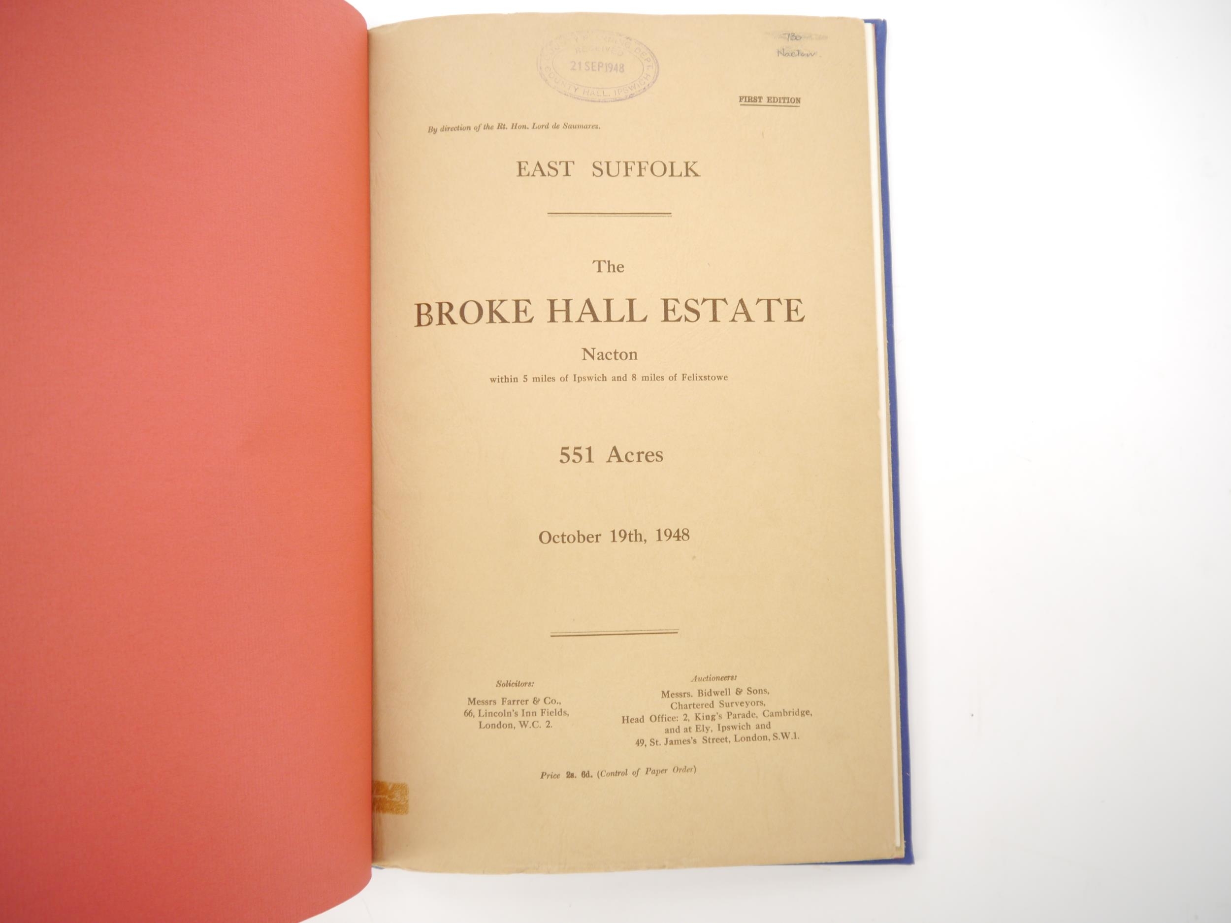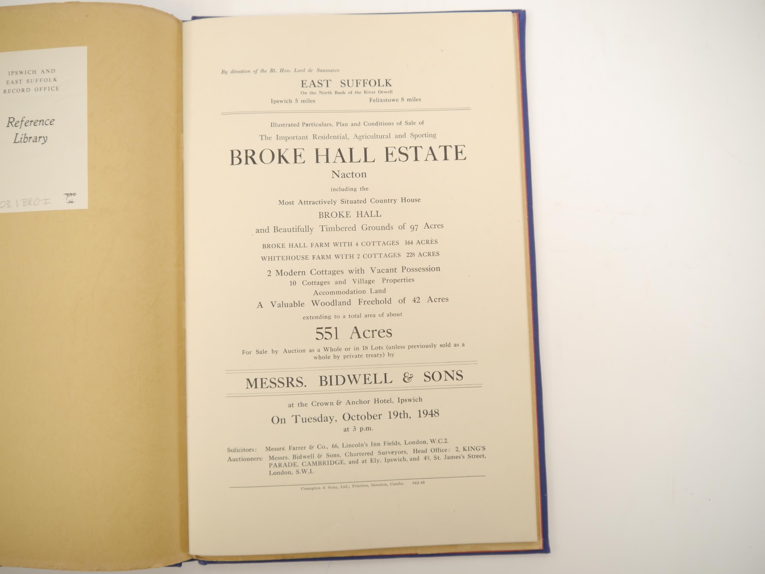 'The Broke Hall Estate, Nacton, East Suffolk', 1948 sale particulars, including "the Most Attractively Situated Country House Broke Hall and Beautifully Timbered Grounds of 97 Acres, Broke HAll Farm with 4 Cottages 164 Acres, Whitehouse Farm with 2 Cottages 228 Acres...extending to a toal area of about 551 acres", 27,[1]pp catalogue, 5 illustrations from photos on 3 full page plates as called for, plus folding colour plan in rear pocket, the whole catalogue encompassing property and land in Nacton & Levington, by direction of the Rt. Hon. Lord de Saumarez, ex Ipswich and East Suffolk Record Office, and Richard Thurlow, Ipswich, Suffolk, with both of their bookplates, original printed wraps, bound into modern blue cloth gilt